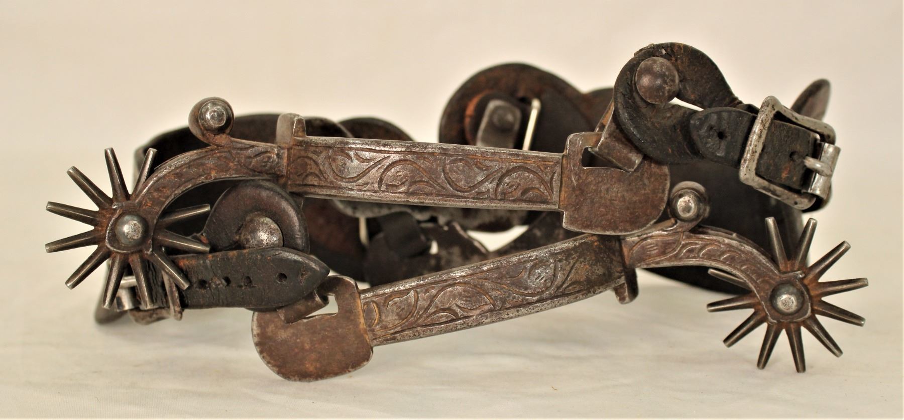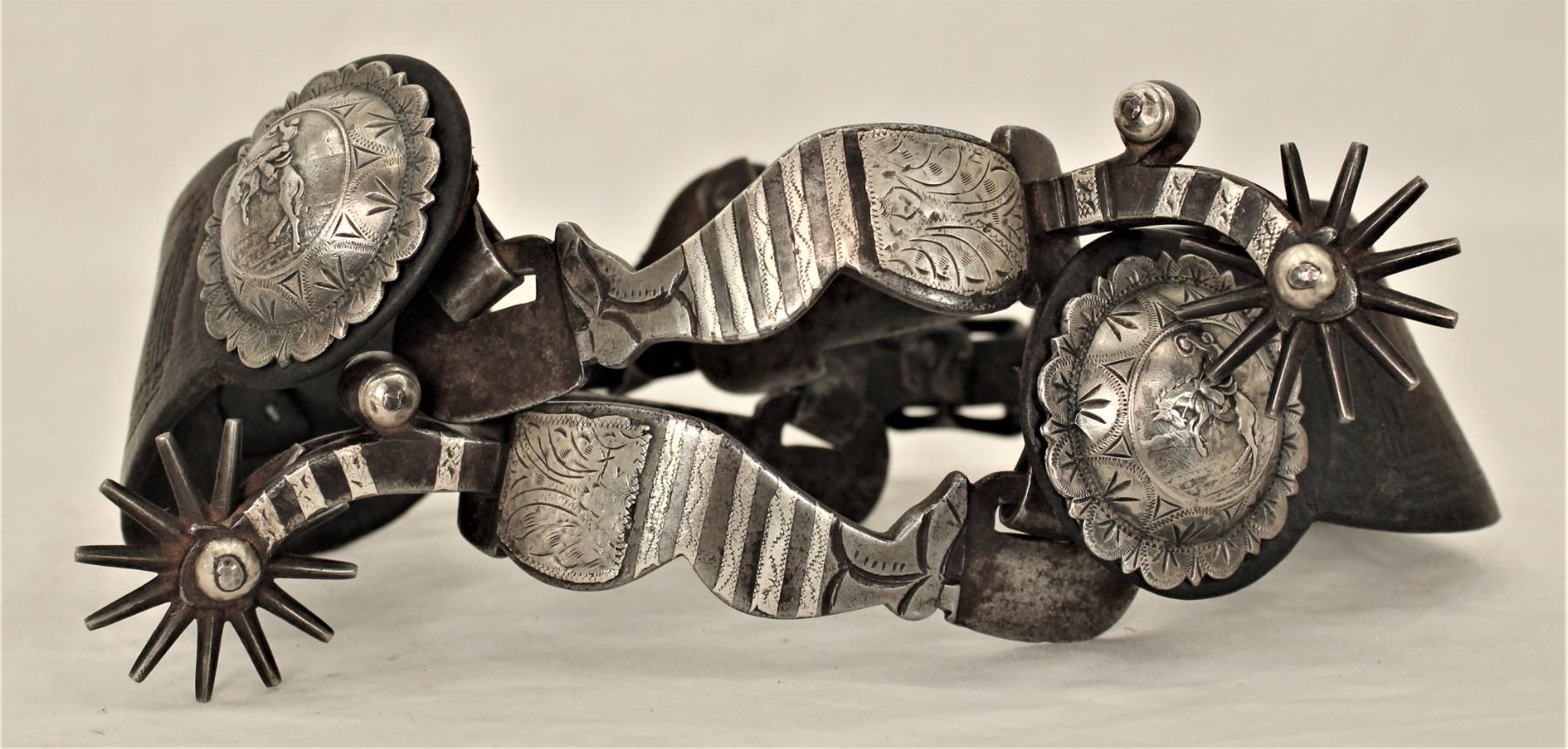 Incredible large Hernandez style figural lady leg spurs, with detailed iron design, single inlaid with finely engraved silver, early style drop shanks with chapgaurds with the 3 X's mark on top edge, all set off by extemely scarce Al Furstnow straps with Visalia marked scalloped bucking horse conchos.