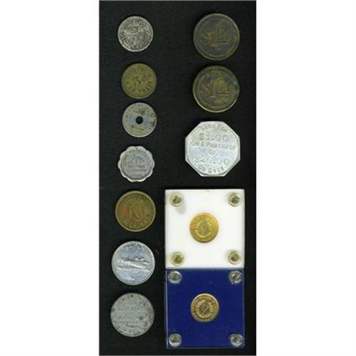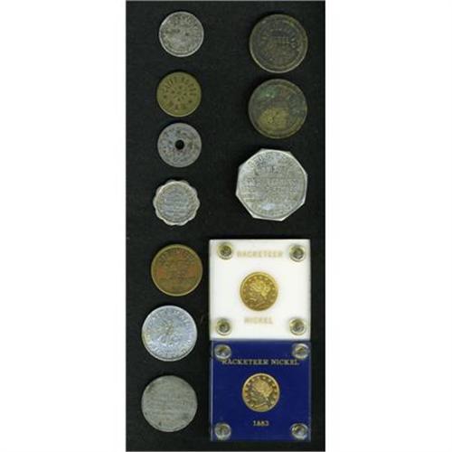 <B>California Merchant Token Miscellany.</B></I> Ten merchant tokens, including many from California:<B> Kappen-LA-1048a; SF-510; SF-150; Riverside-20; </B></I>an <B>unlisted San Luis Obispo token; two 1883 "racketeer" nickels;</B></I> an <B>R.8 Cleveland Ohio token, CL4640;</B></I> and a couple of others.<BR><BR><b>Shipping:</b> Coins & Currency (<a target="_blank" href="http://www.heritageauctions.com/common/shipping.php">view shipping information</a>)