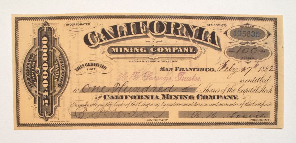 100 shares at $100 per share to H. B. Parsons, Trustee. The California Mining Company was split from the major Consolidated Virginia Mining Company in January of 1874 to speed up exploration. The gamble paid off with the discovery of the 'Big Bonanza.' This lesser known mining company is historically important..City: Virginia CityCounty: StoreyState: NV