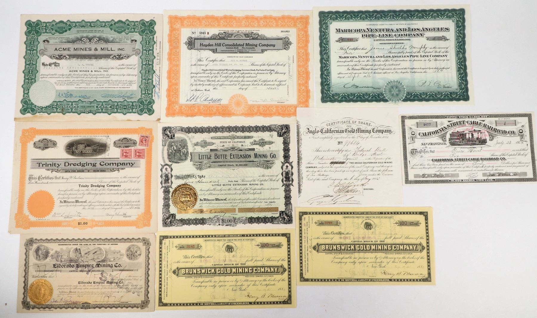 Lot of 11, most different. Includes: Acme Mines & Mill (1929); Brunswick Gold MC (1889, x2); Hayden Hill Cons. MC (1951); Calaveras Water & Mining Co. (1882); Maricopa, Ventura & Los Angeles Pipe-Line Co. (1916); Little Butte Extension MC (1898); California Street Cable Railroad Co. (1924); Trinity Dredging Co. (1932); Eldorado Empire MC; and Anglo-California Gold MC (1853).