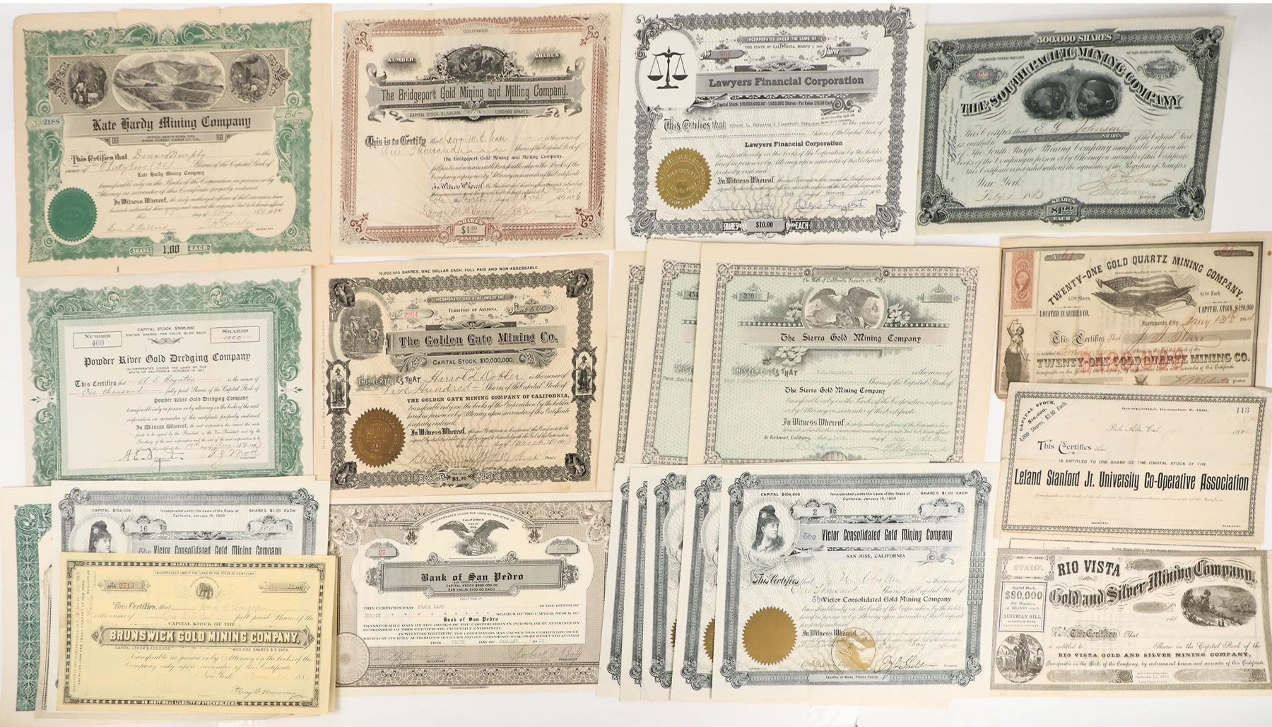 Lot of 37. U/U. I/U, I/C. Issued 1865-1923. Mostly Gold mining stocks, VG or better cond. I.E.; The Golden Gate Mining Co,. Victor Consolidated Gold Mining Co. , The Lightner Gold Mining Co. , Erie Mining Co. 1893, very rare. Twenty-One Gold Quartz Mining Co. bare breasted allegorical female. . Added a few non-mining stocks: Yreka Railroad Co., 1888. ,Oil Creek Petroleum Co. dateline 186_ great vignettes., California Railway 1893. ,Bank of San Pedro.