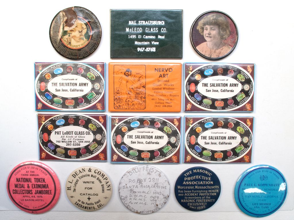 Lot of 14 mirrors, round and rectangular. 1-5) Pat LeDeit Glass Co. of San Jose, CA, rectangular. 6) Bill Feist, Santa Rosa, CA, Collector of Wooden Money, a round hand-lettered mirror showing an address with zip code, hence of a more recent date. 7) Paul L. Koppenhaver, Professional Numismatist, of Van Nuys, CA, also showing a zip code in the address. Round. 8) H.L. Dean & Company, Mail Order Grocers, Sacramento, CA. Round. 9) National Token, Medal & Exonumia Collectors Jamboree, San Jose, 1975. Round. GF $1 IT. 10) Nervo Art, Stained Glass Works, Oakland, rectangular. 11) Bill Strausburg McLeod Glass Co., Mountain View. Rectangular. 12) Unidentified, round, with picture of young girl on the front. 13) Gillette Safety Razor, round, torn cover. 14) Masonic Protective Association, Worcester, MA. Round.