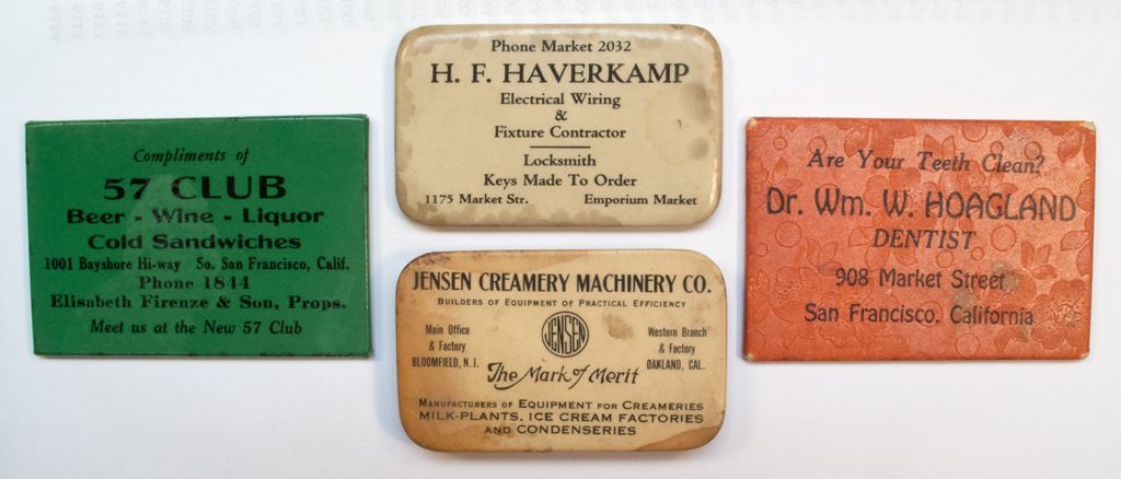 Lot of 4, rectangular advertising mirrors (one is not a mirror). Advertisers include: Dr. Wm. W. Hoagland, Dentist, on Market Street; H.F. Haverkamp, electrical wiring and fixtures contractor and locksmith, on Market Street; 57 Club, on Bayshore Highway, Elisabeth Firenze & Son, Props.; and Jensen Creamery Machinery Co. in Oakland, CA.