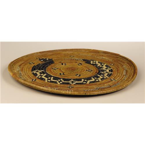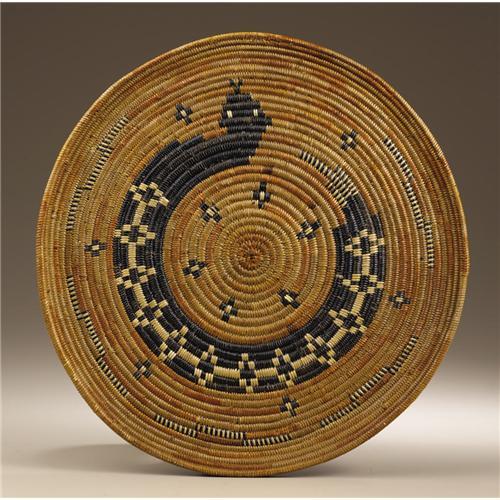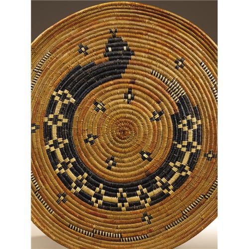 <B>California Mission Polychrome Tray</B></I><BR>Circa 1910<BR>Diameter 11 5/8 in.<BR><BR>This coiled tray is decorated with a rattlesnake design curling around the center. The rattlesnake is flanked by a group of small crosses on both sides of its body and short striped bands towards the outer rim. The realistic depiction of rattlesnakes was common on Mission baskets. Donna Largo, a contemporary Cahuilla weaver comments, "My grandmother told me a story about the rattlesnake and how it got into the basket. She said that the women would all sit on the ground making baskets and a rattlesnake kept coming toward one lady. And she'd chase him away and chase him away. And he kept coming back. And finally she told the rattlesnake, 'If you don't go away, I'm going to put you in my basket.' Well, he wouldn't go away, so that's how we got rattlesnakes in our baskets."<BR><BR>Reference<BR>Bibby, Brian, <I>The Fine Art of California Indian Basketry,</B></I> Crocker Art Museum, Sacramento, 1996, p. 92.<BR><BR>