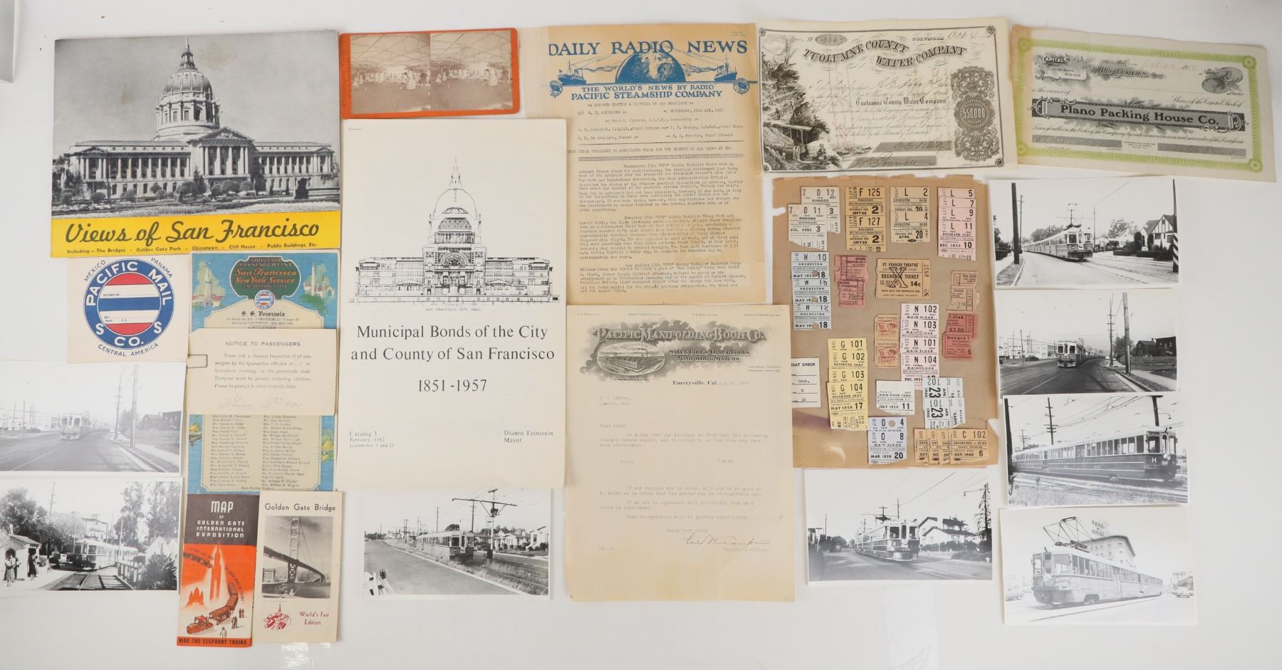 Another Mystery Mishmash of Great California Ephemera. Early RPPCs, Souvenir Book of San Francisco with a Birds Eye View of the Entire Bay Area, black and white photographs, stereo views, billheads, letterheads, stocks, brochures, The Western Railroader 1972, Map of the Golden Gate International Exposition, tram tickets, and so much more. See photos.