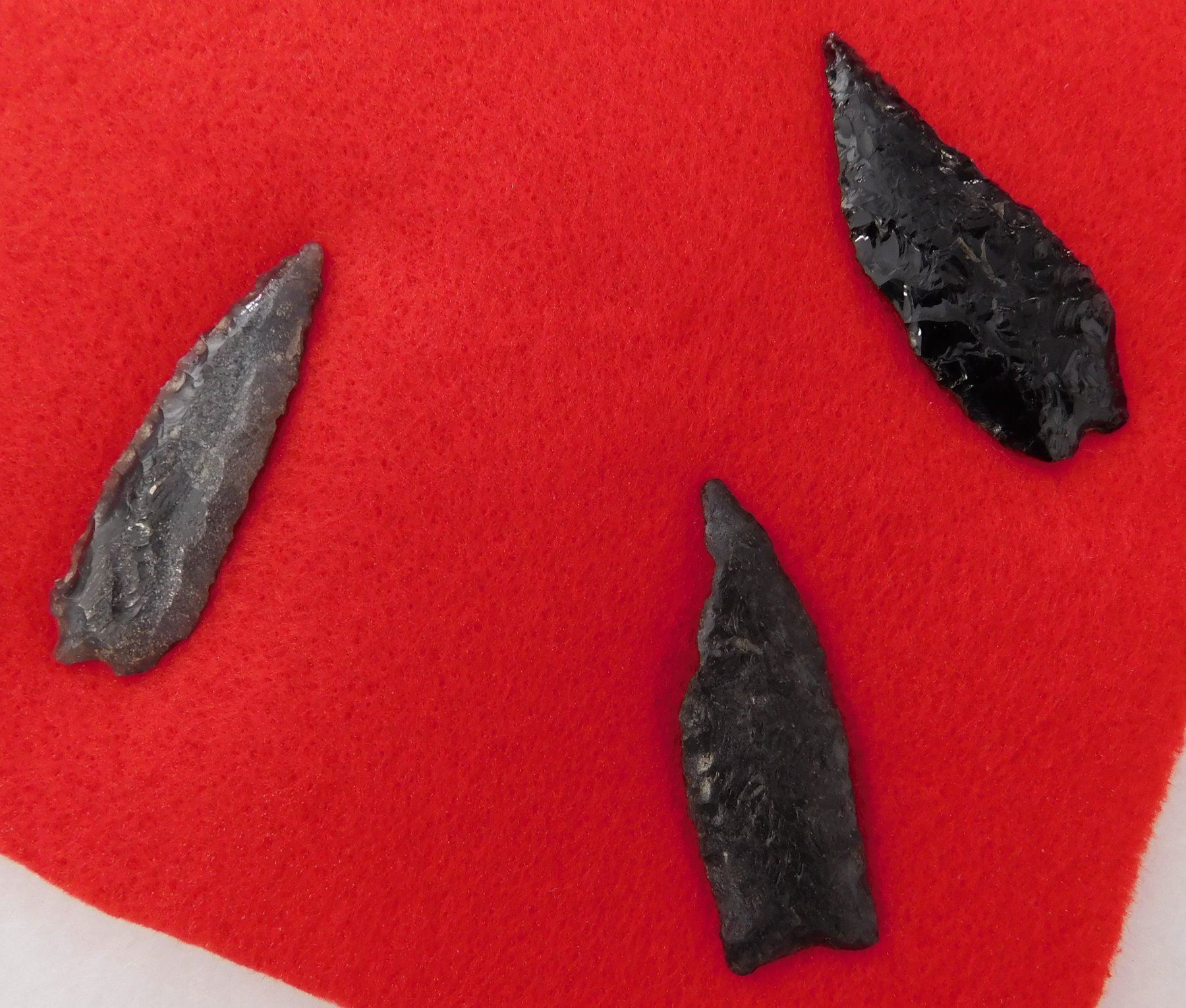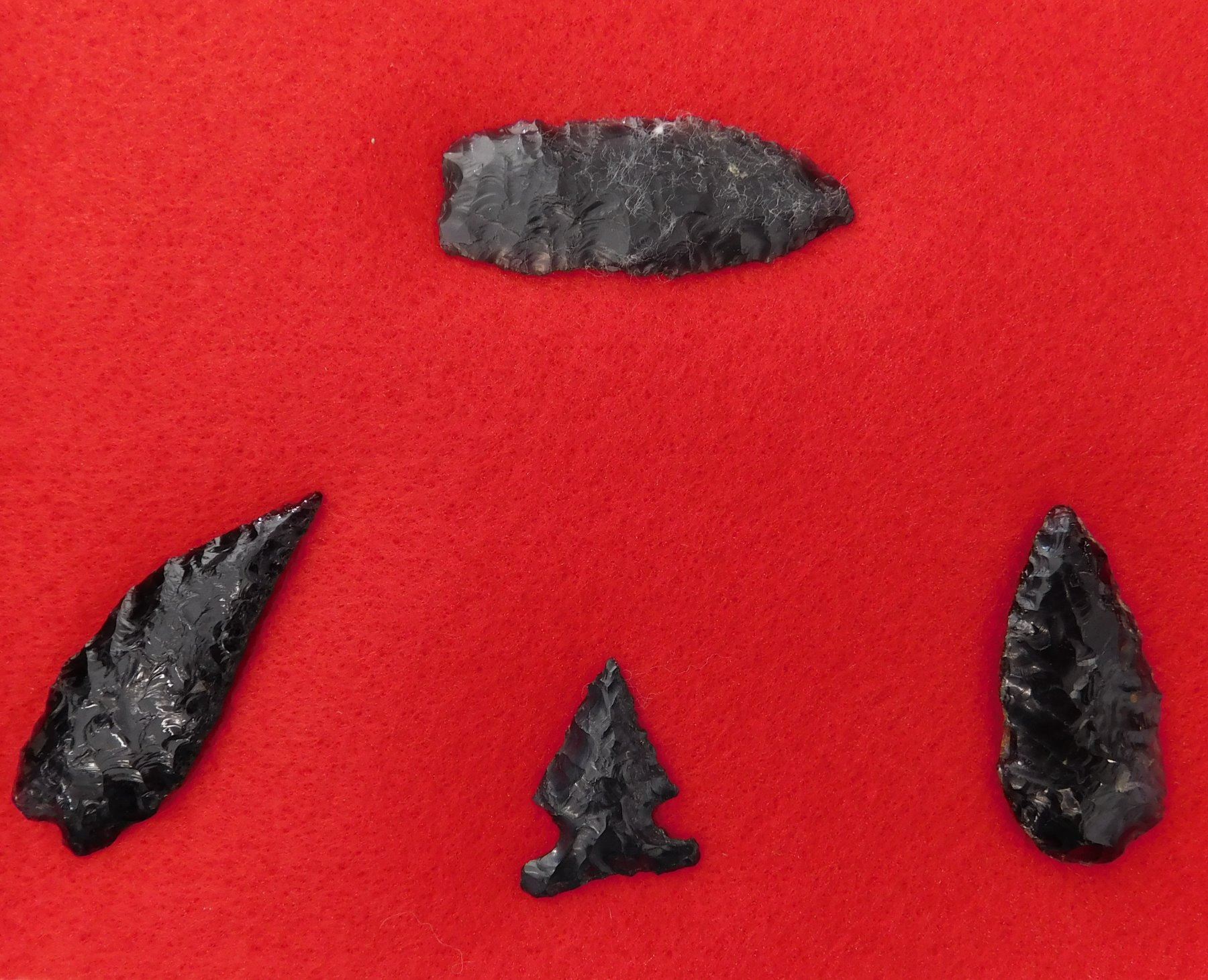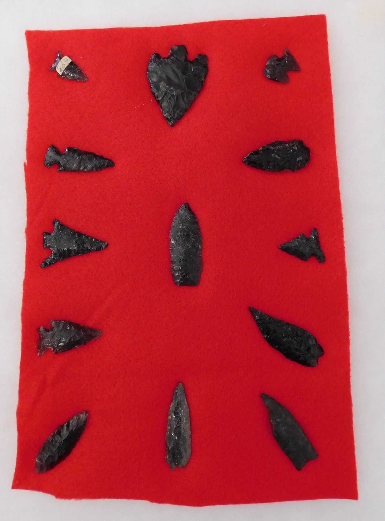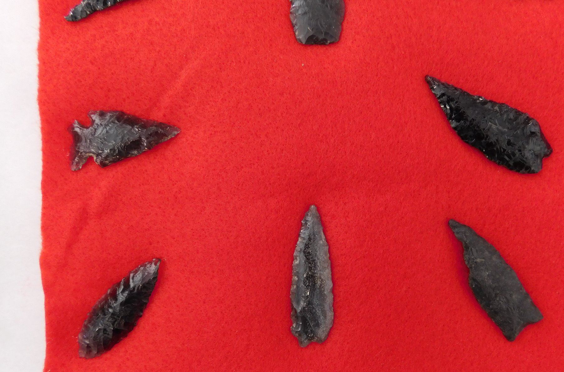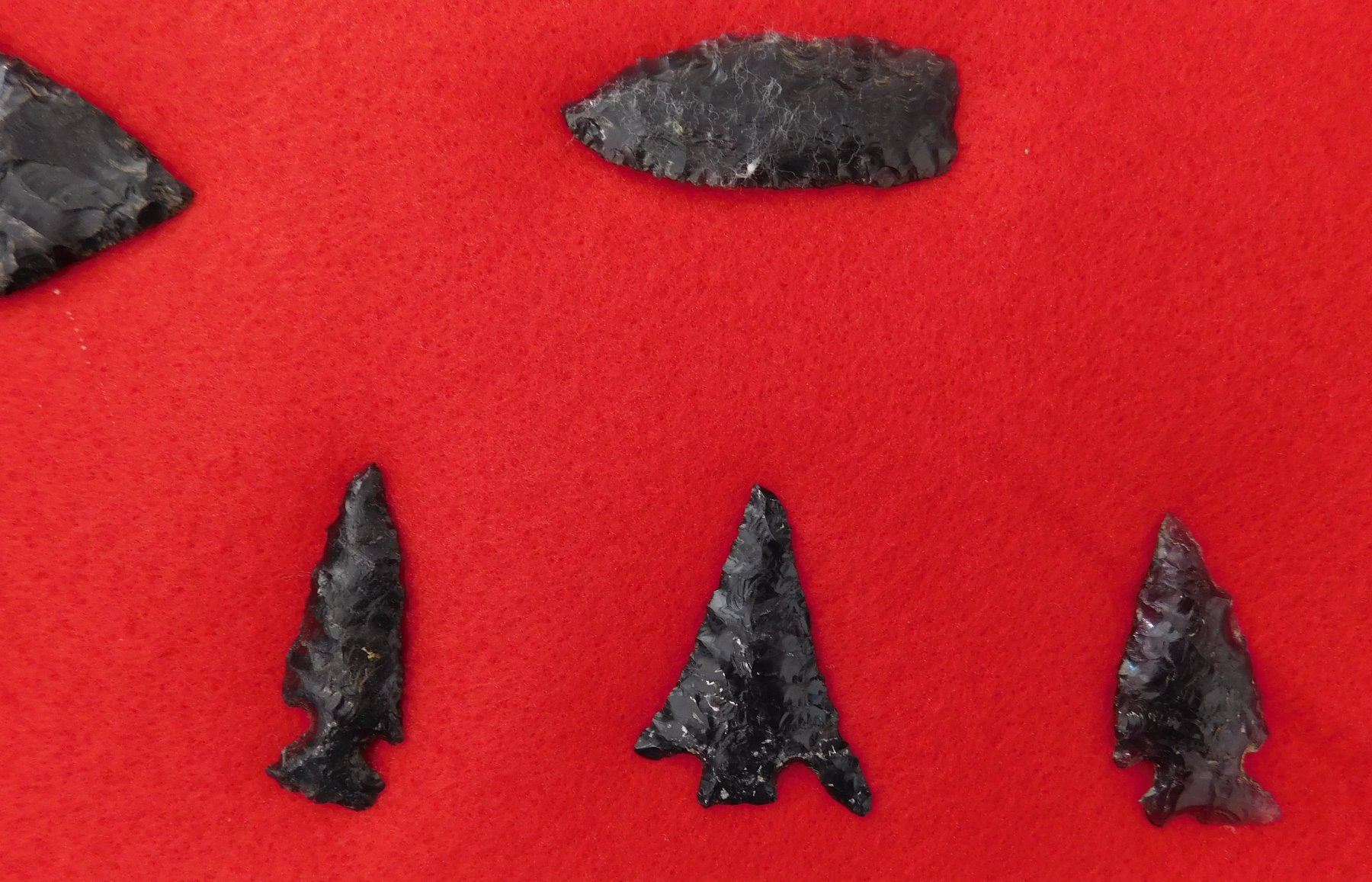 California Obsidian Collection, pre-historic items. Made of obsidian, the longest measures 2 1/2". Sonoma County, California. Some paleo points. Frame not included. Condition: As found, see images. Shipping: $16.50 w/insurance and signature.