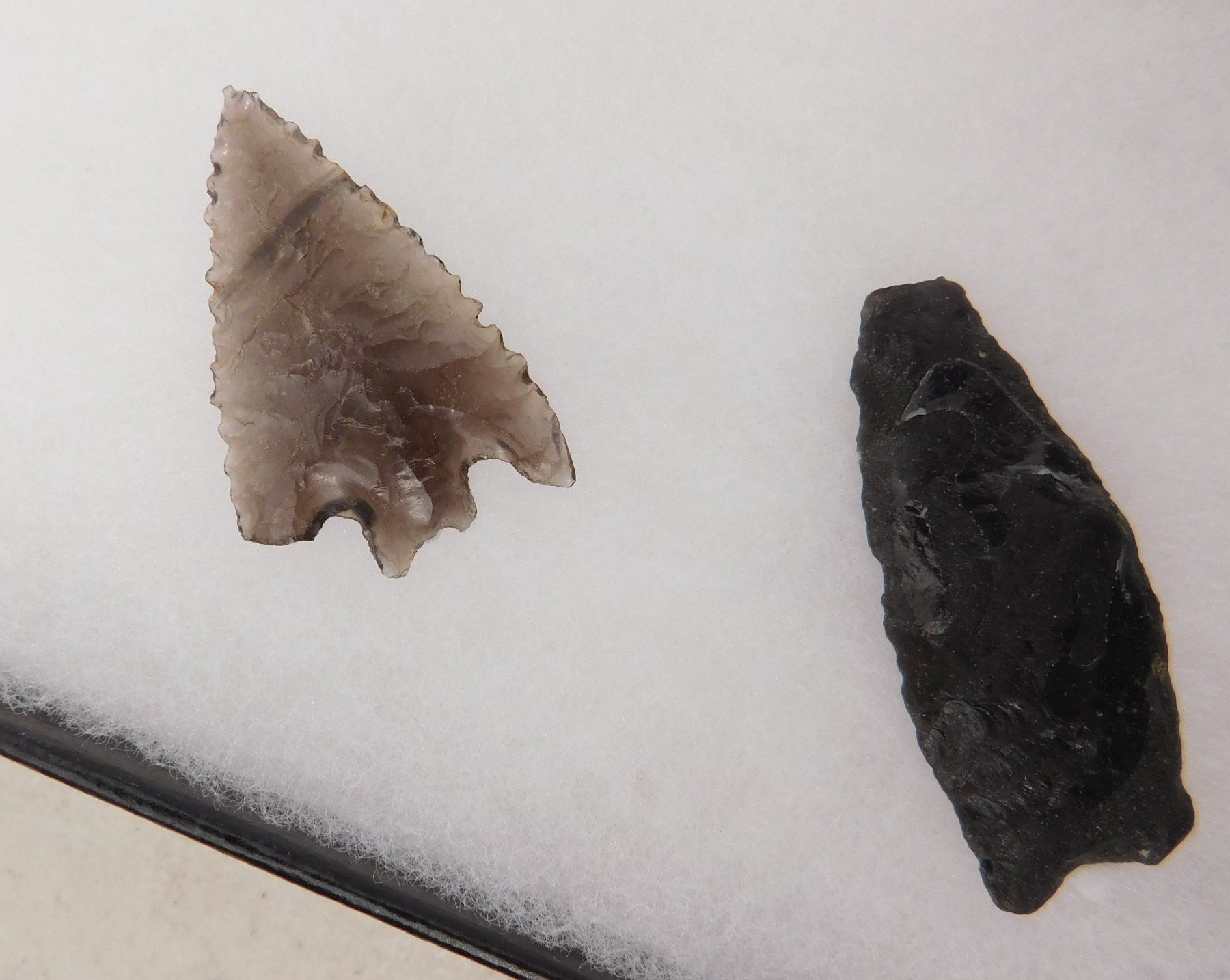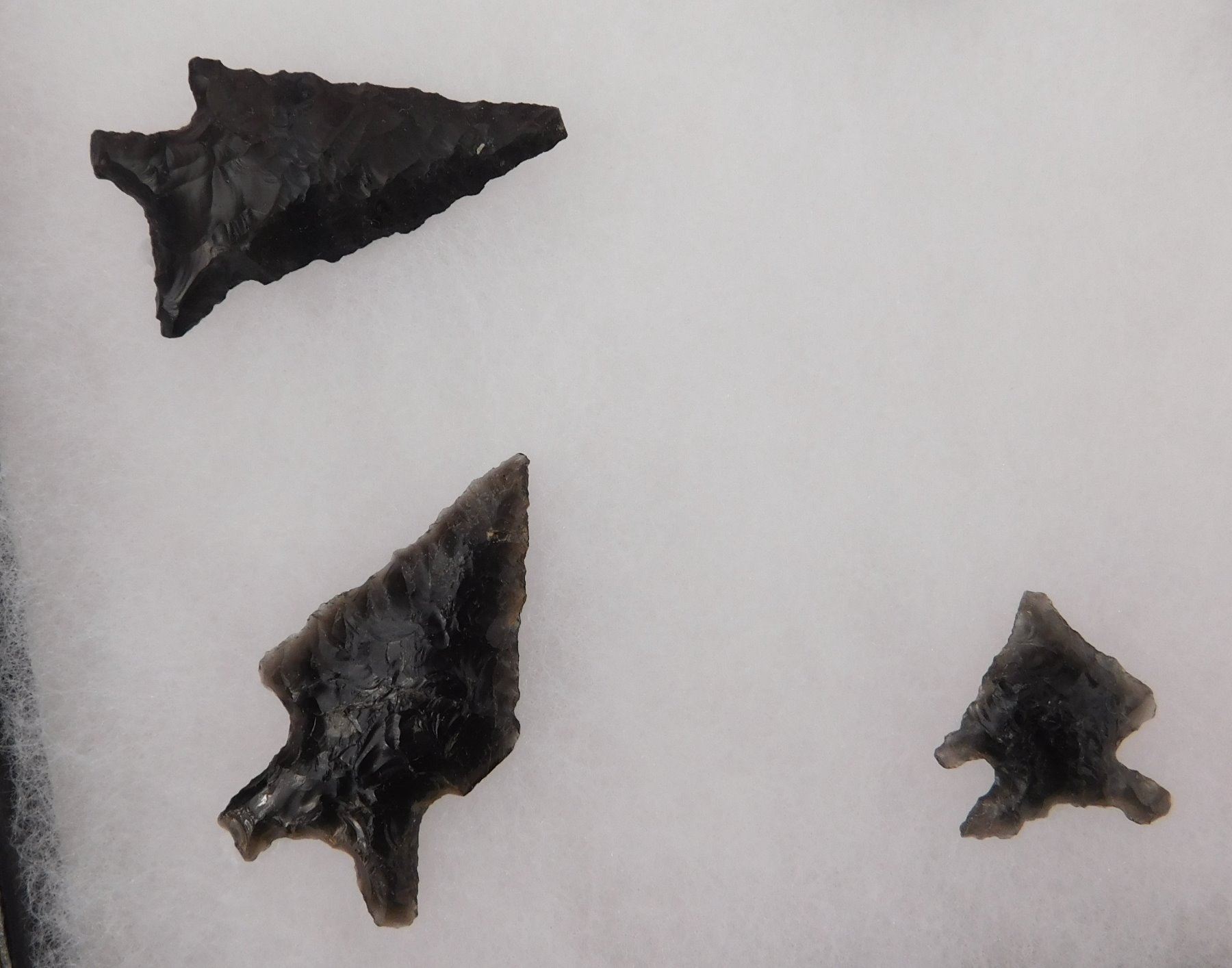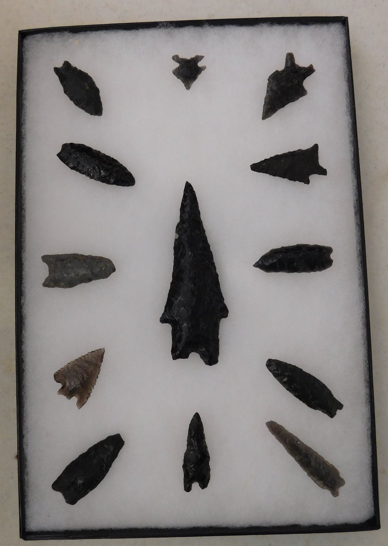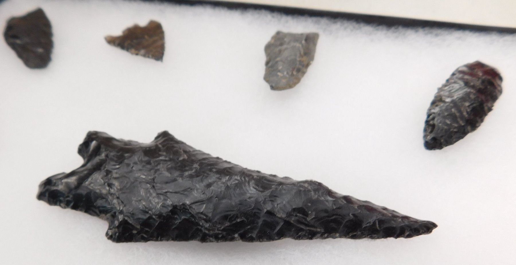 California Obsidian Collection, pre-historic items. Made of obsidian, the longest measures 4 1/4". Northern California. Many Pinto Basins, paleo items. Frame not included. Condition: Some dings, as found, see images. Shipping: $16.50 w/insurance and signature.