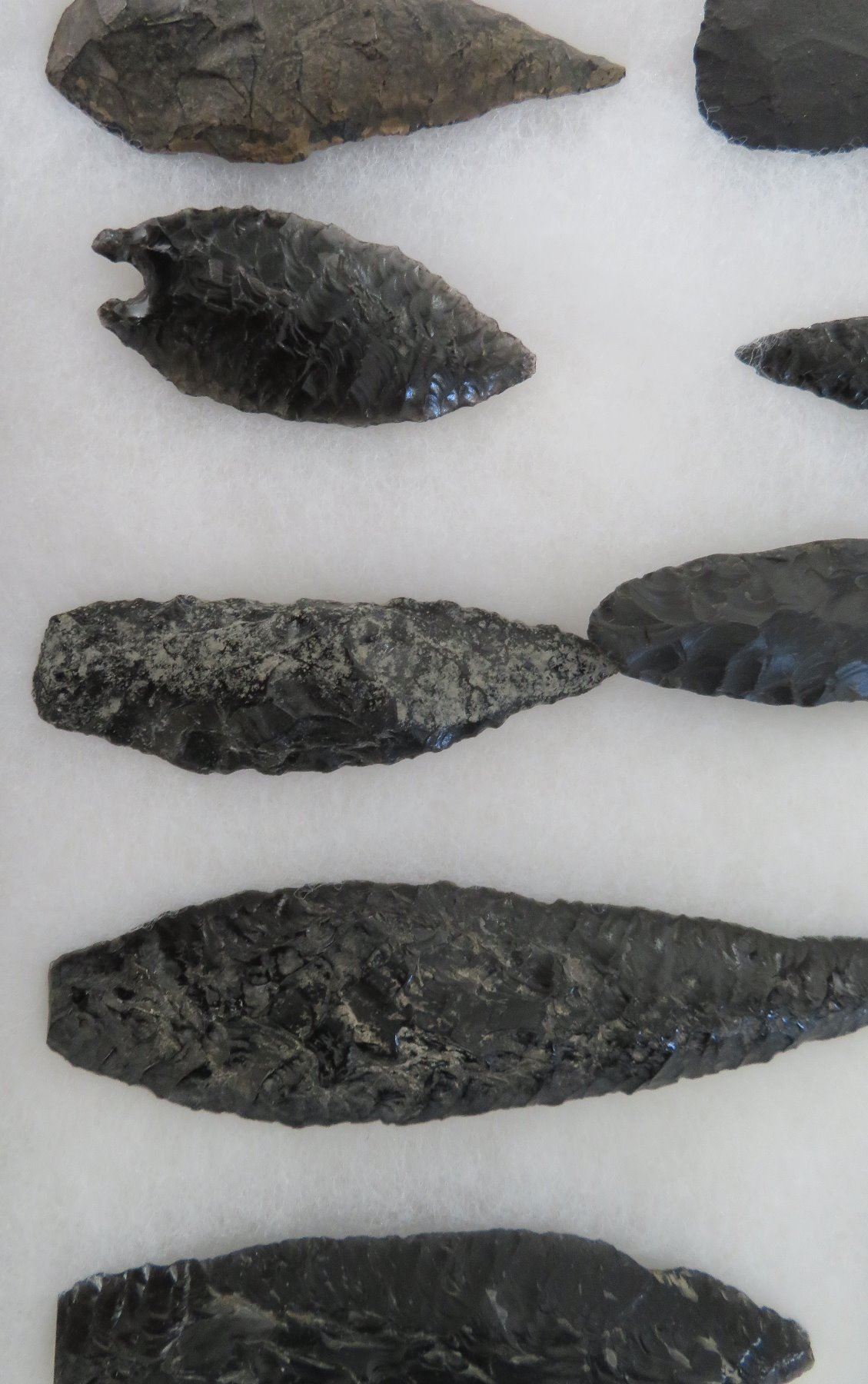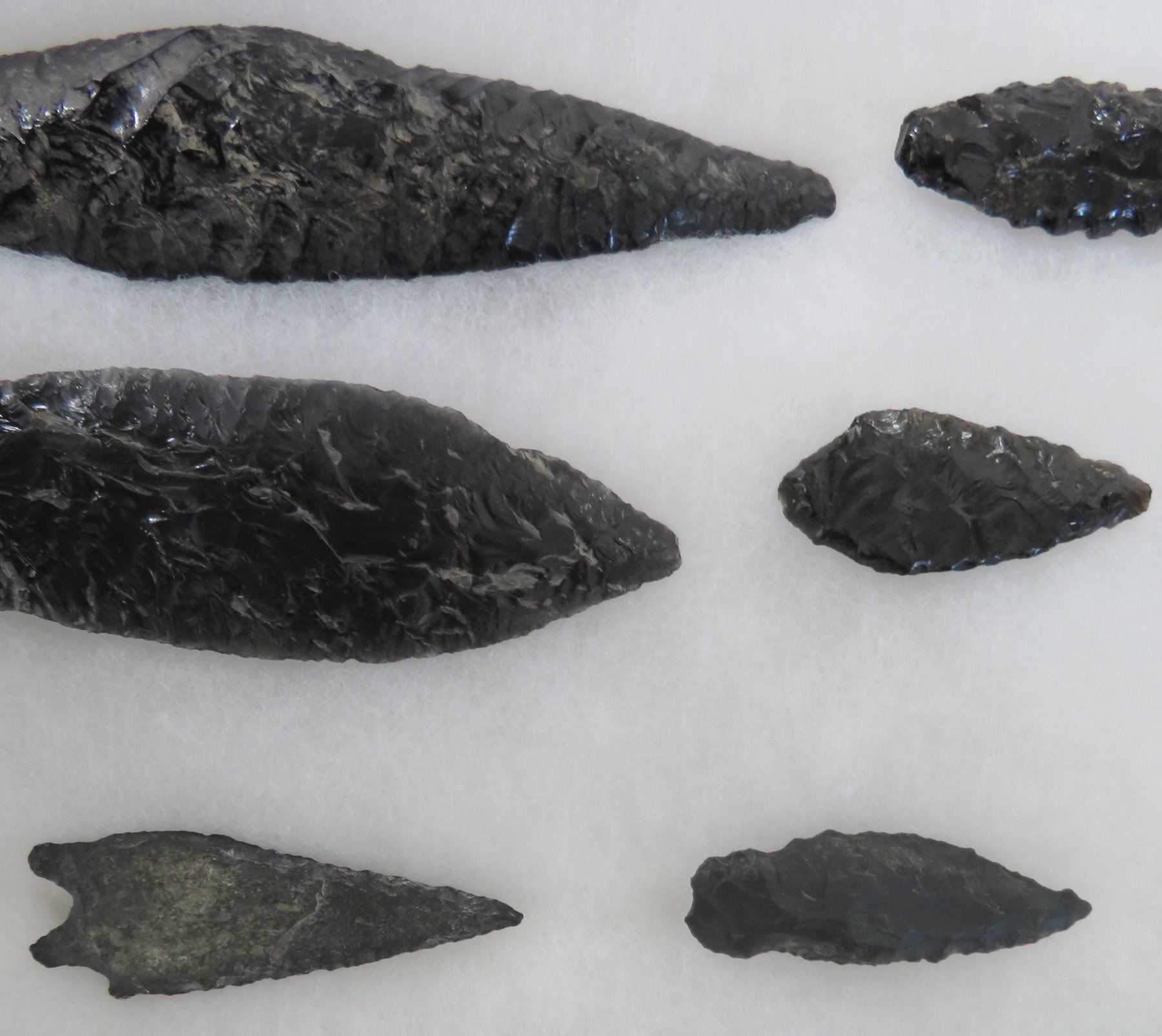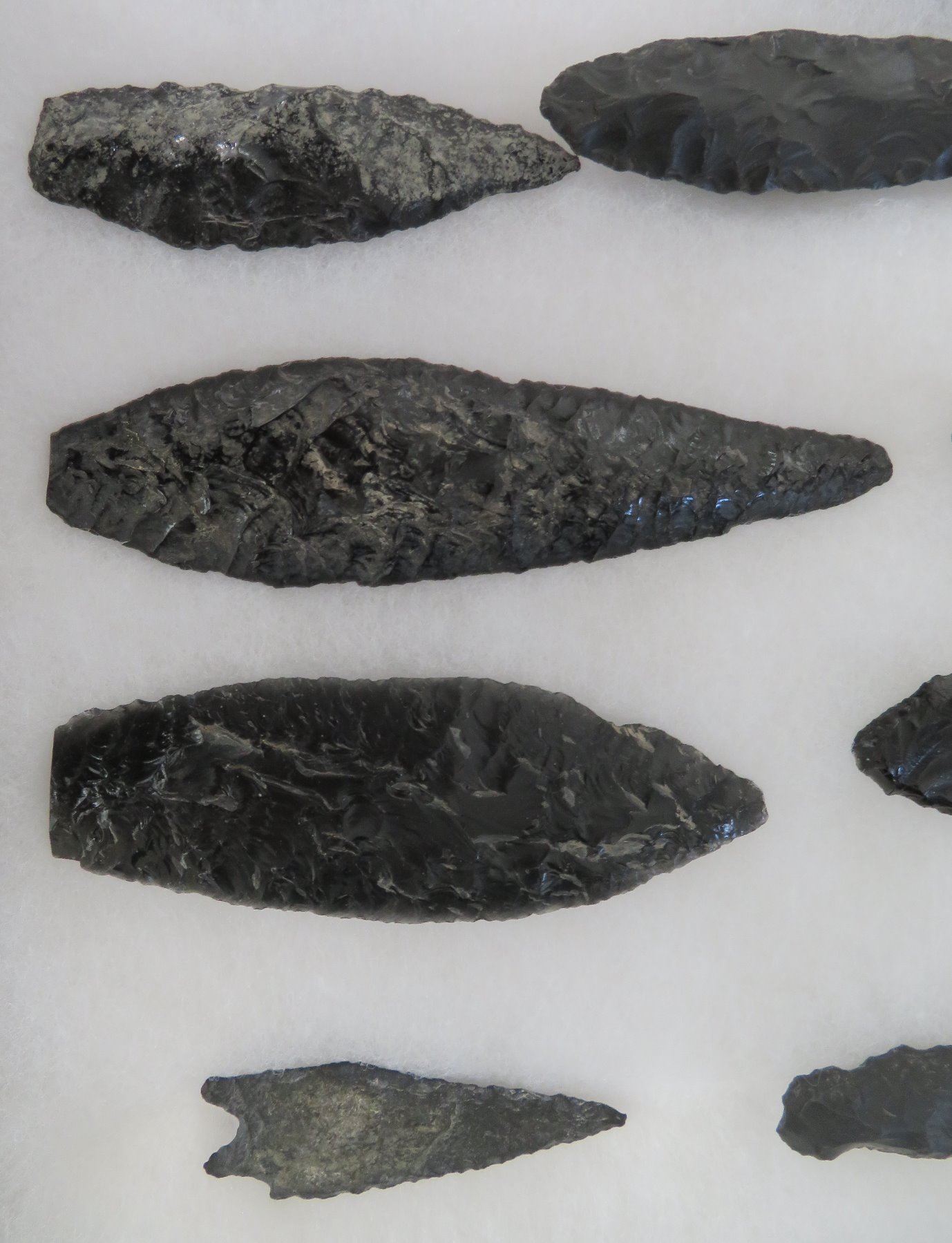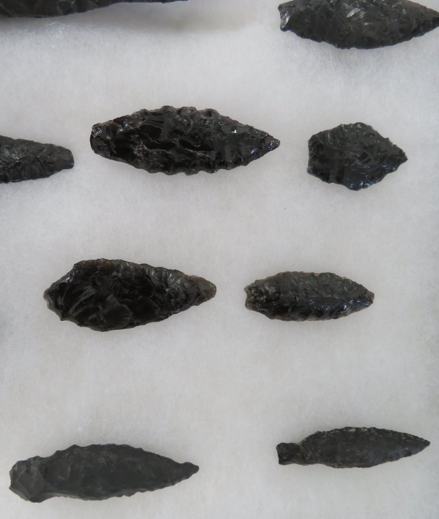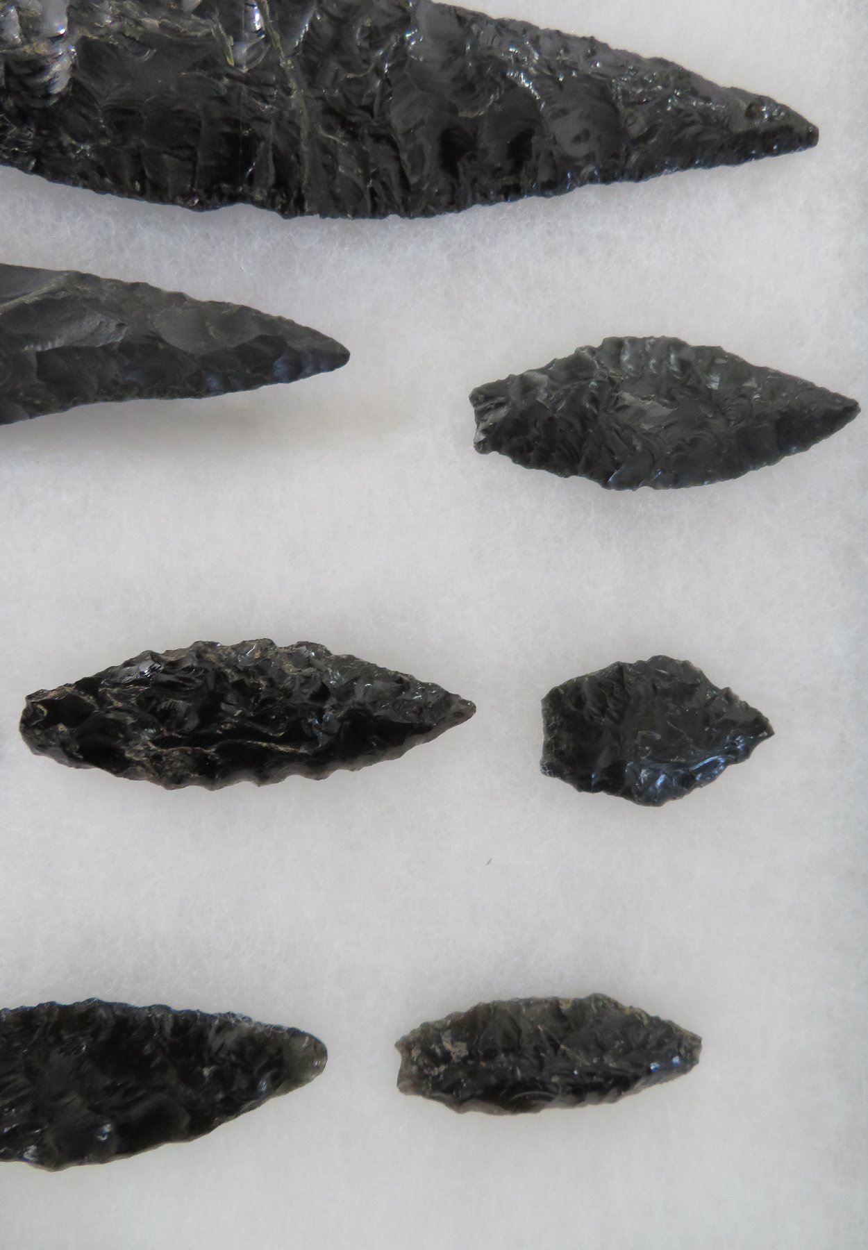 California Obsidian Collection, pre-historic items. Made of obsidian stone, the items measure from 1 1/4" to 6 1/2" long. Santa Barbara County, California. Many paleos. From a 60-year-old California collection. Frame not included. Condition: As found, see images. Shipping: $32.50 w/insurance and signature, due to value.