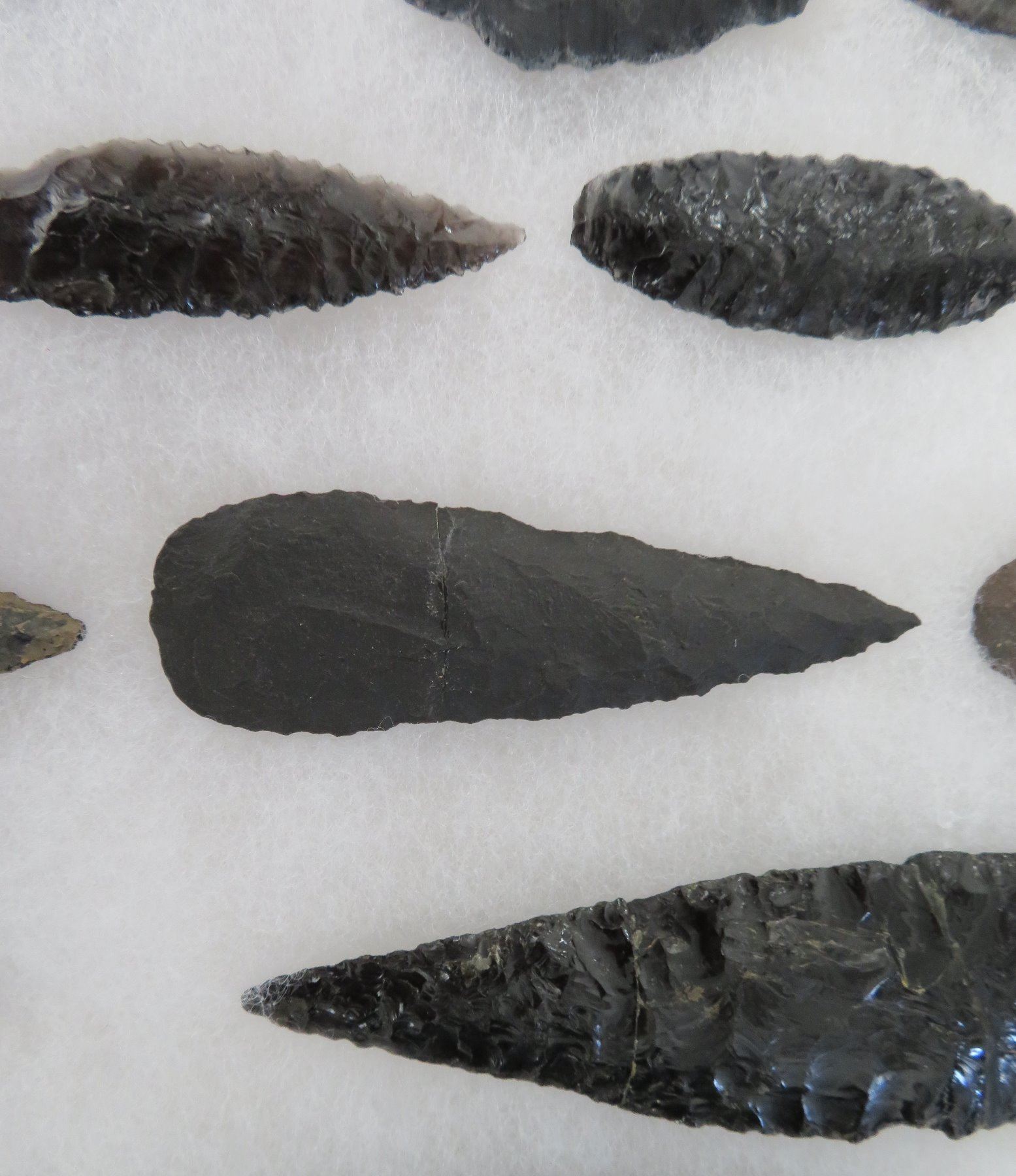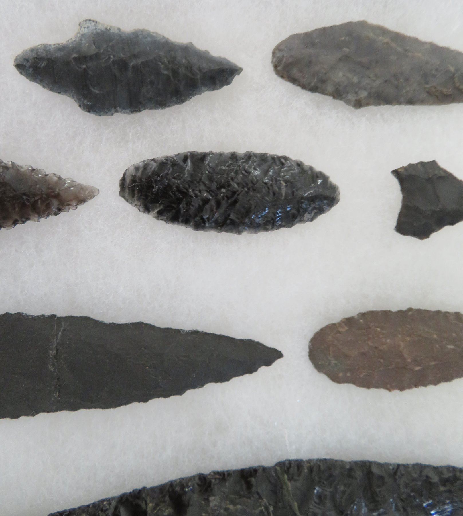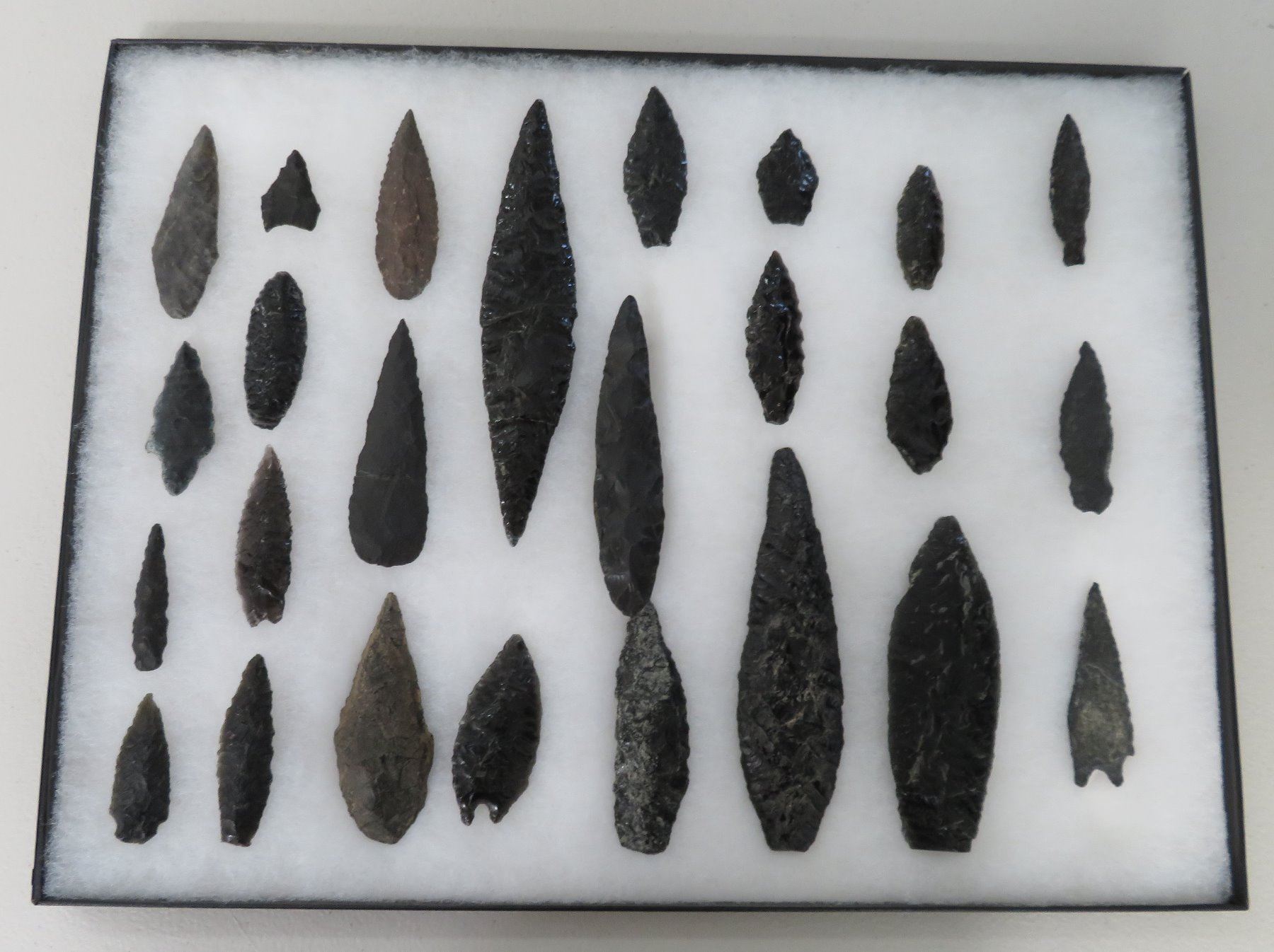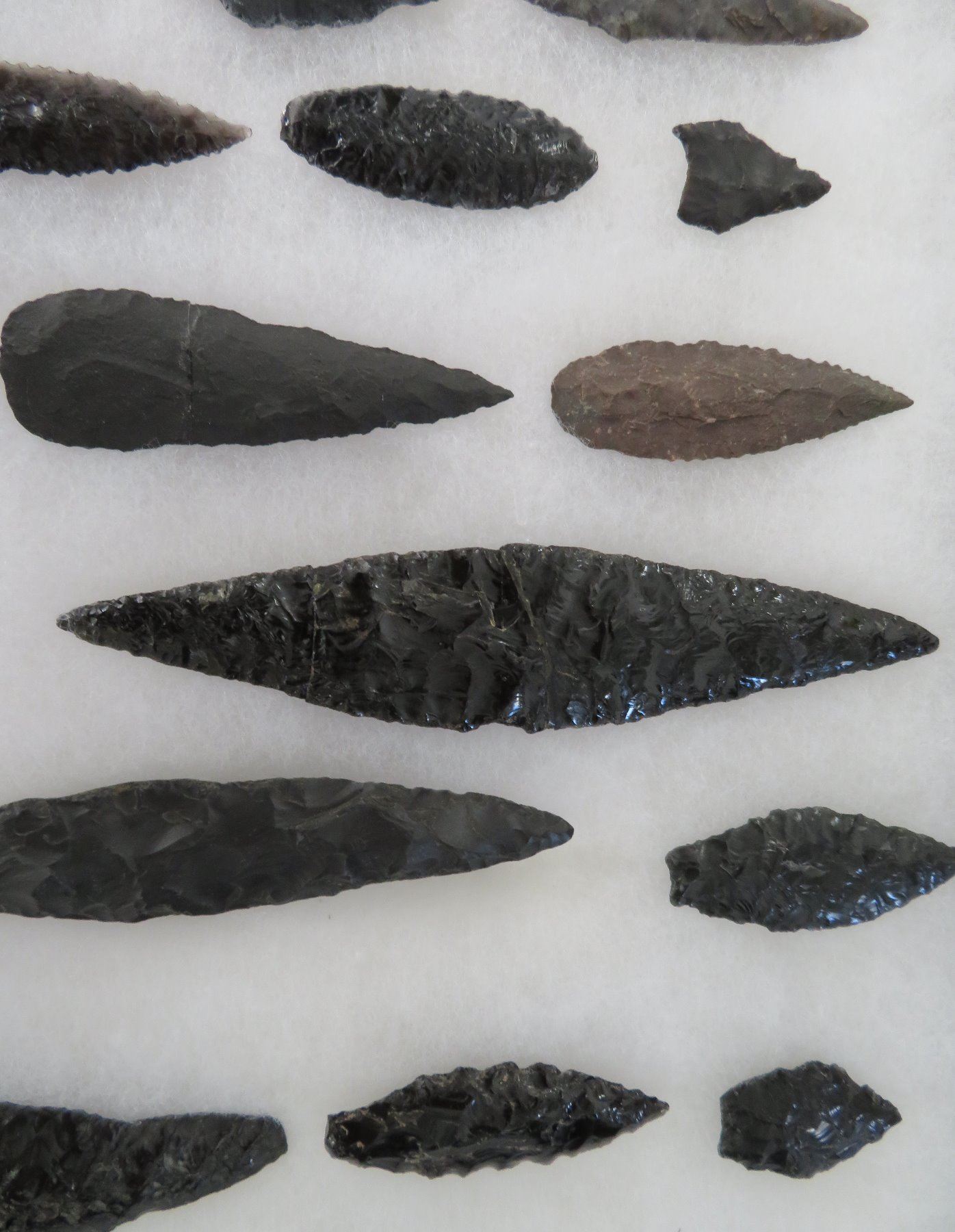 California Obsidian Collection, pre-historic items. Made of obsidian stone, the items measure from 1 1/4" to 6 1/2" long. Santa Barbara County, California. Many paleos. From a 60-year-old California collection. Frame not included. Condition: As found, see images. Shipping: $32.50 w/insurance and signature, due to value.