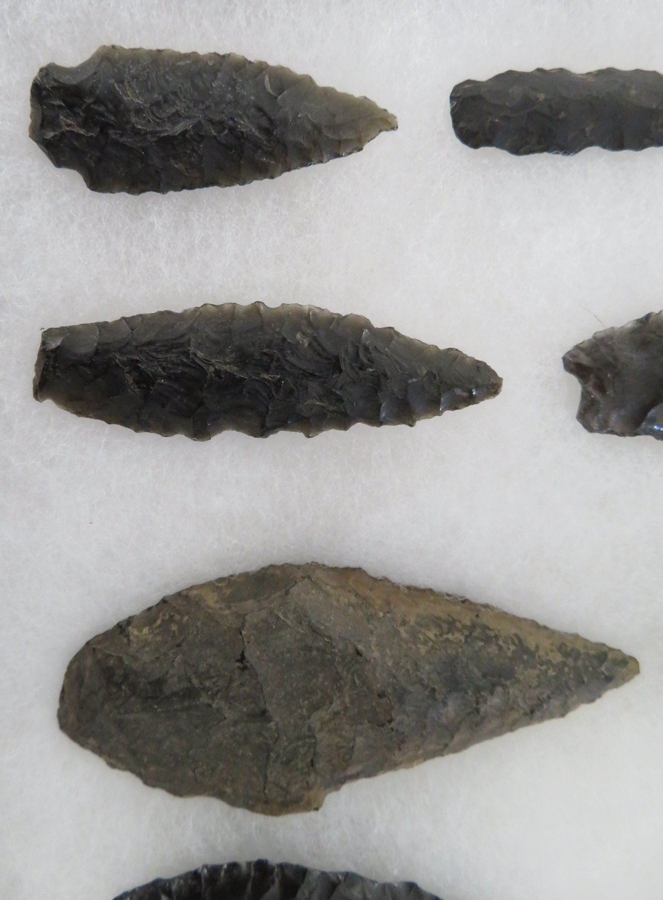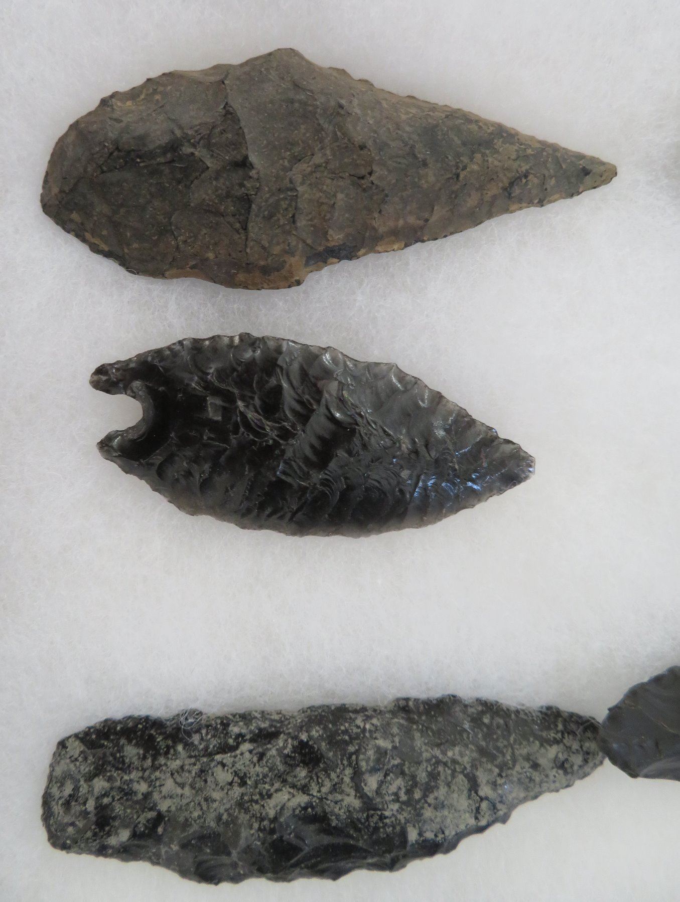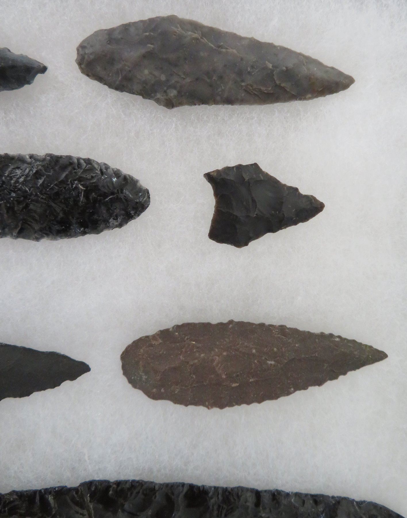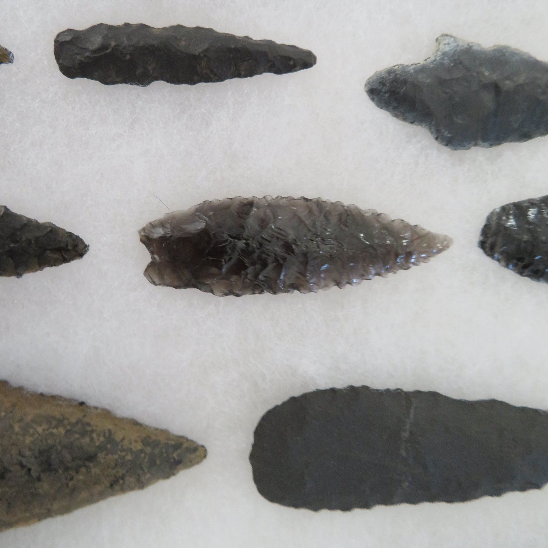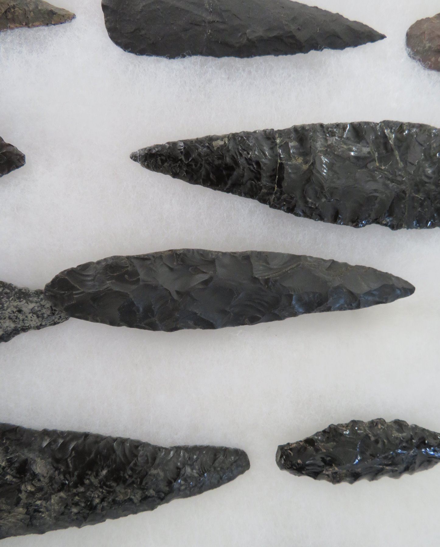 California Obsidian Collection, pre-historic items. Made of obsidian stone, the items measure from 1 1/4" to 6 1/2" long. Santa Barbara County, California. Many paleos. From a 60-year-old California collection. Frame not included. Condition: As found, see images. Shipping: $32.50 w/insurance and signature, due to value.