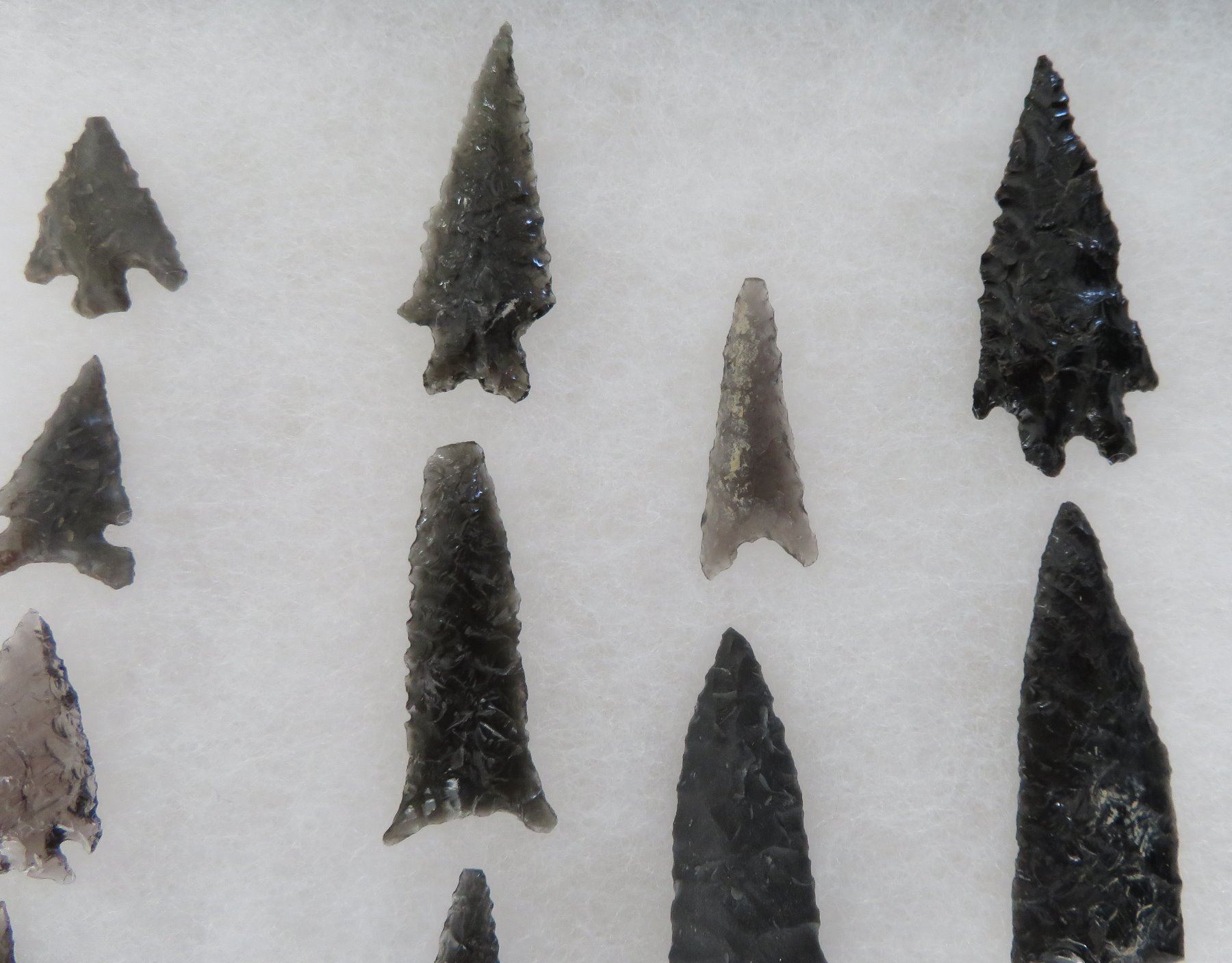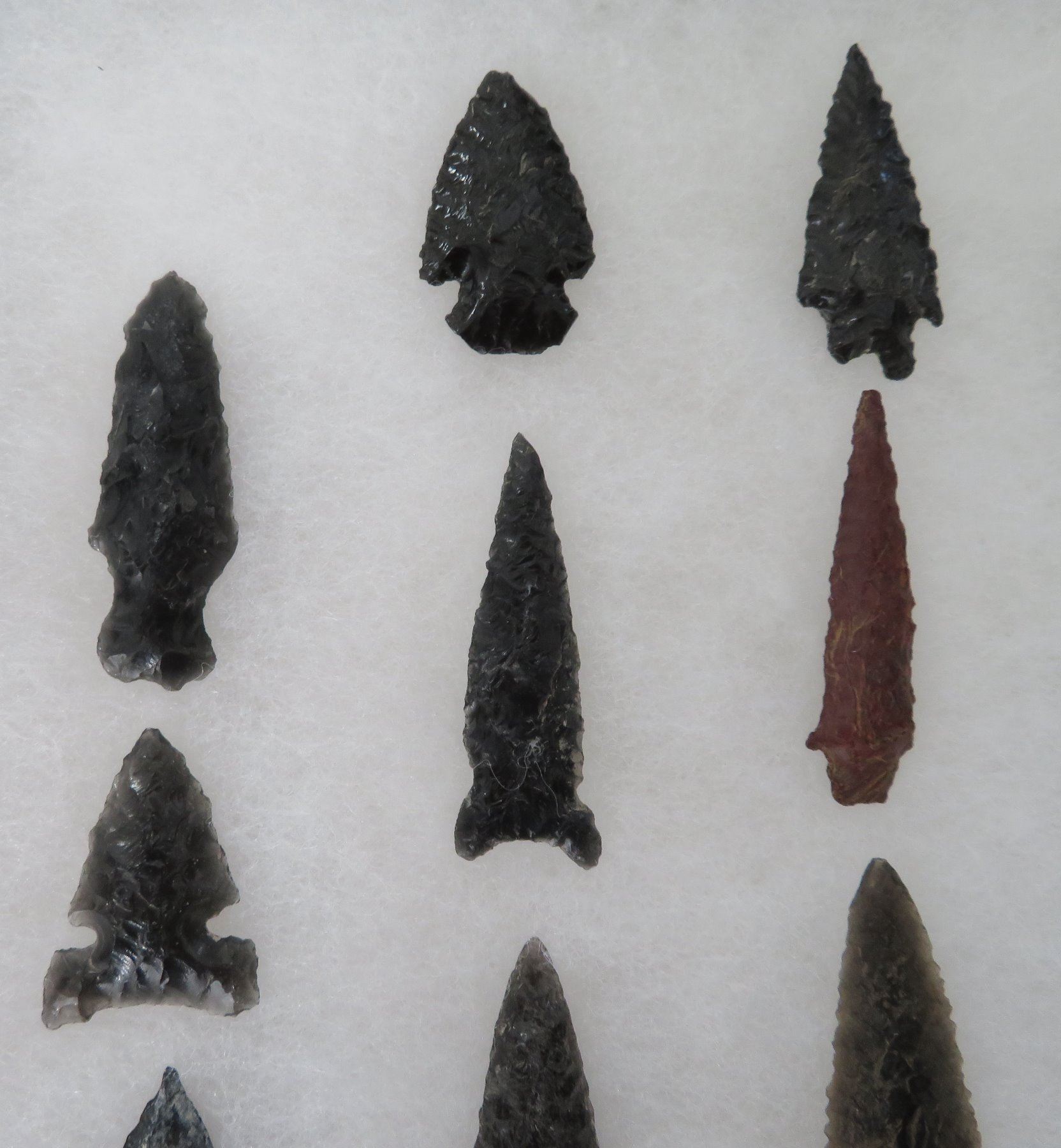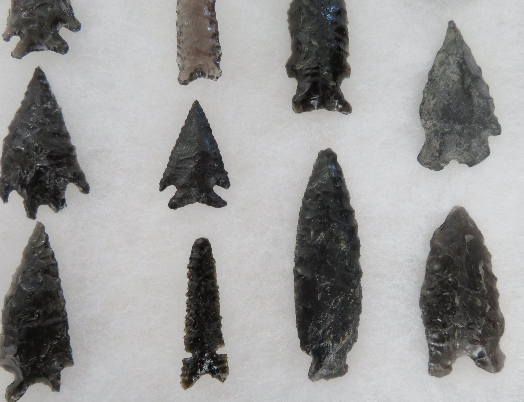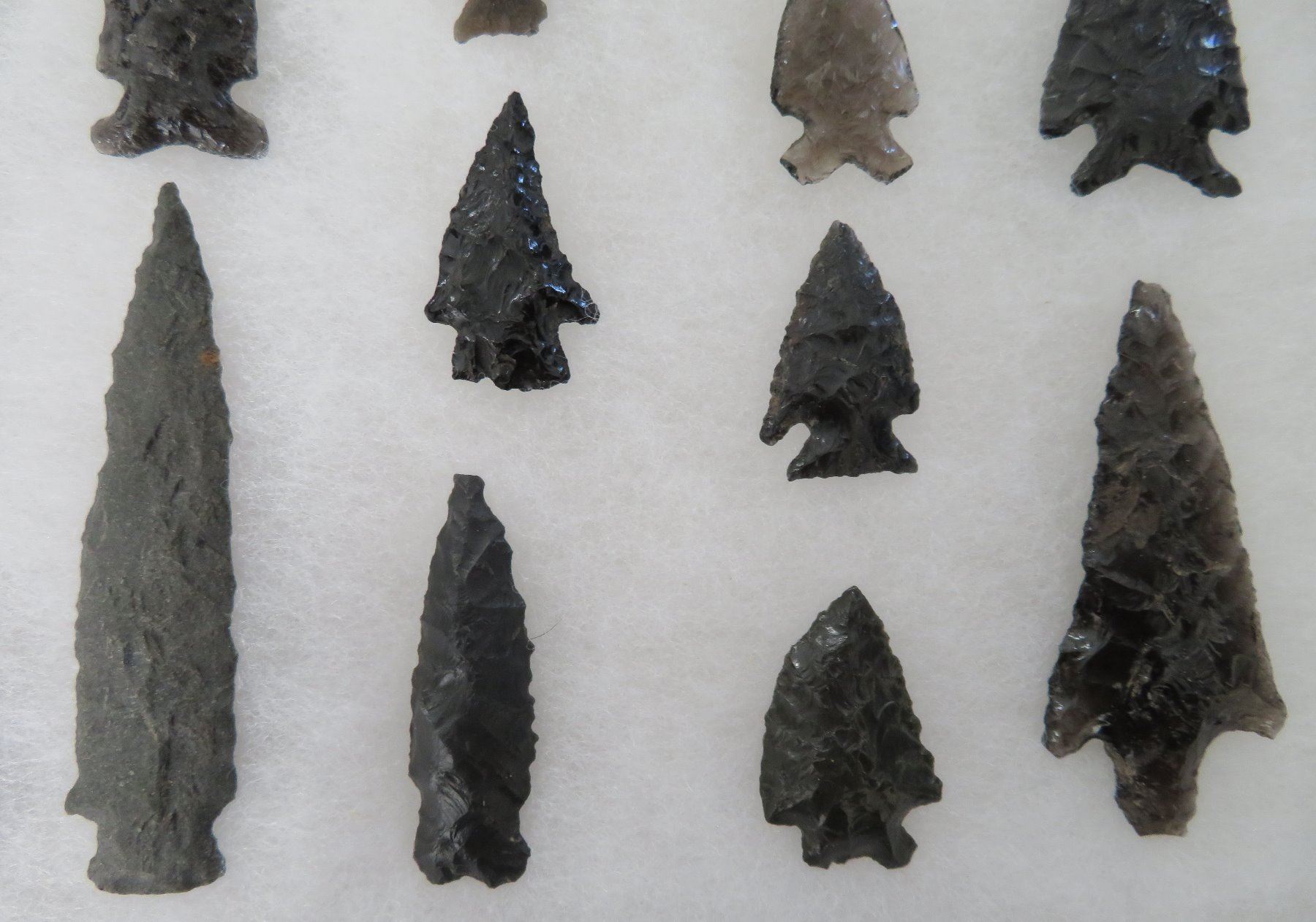 California Obsidian Collection, pre-historic items. Made of mainly obsidian stone, the items measure from 1" to 3 1/4". Sutter County, California. Elkos, pinto basins. From a 60-year-old California collection. Frame not included. Condition: As found, see images. Shipping: $30.00 w/insurance and signature.