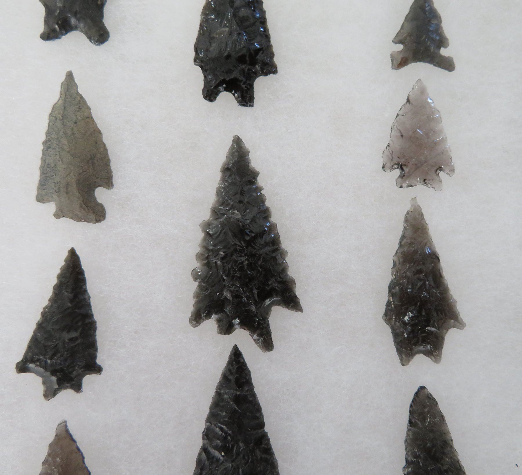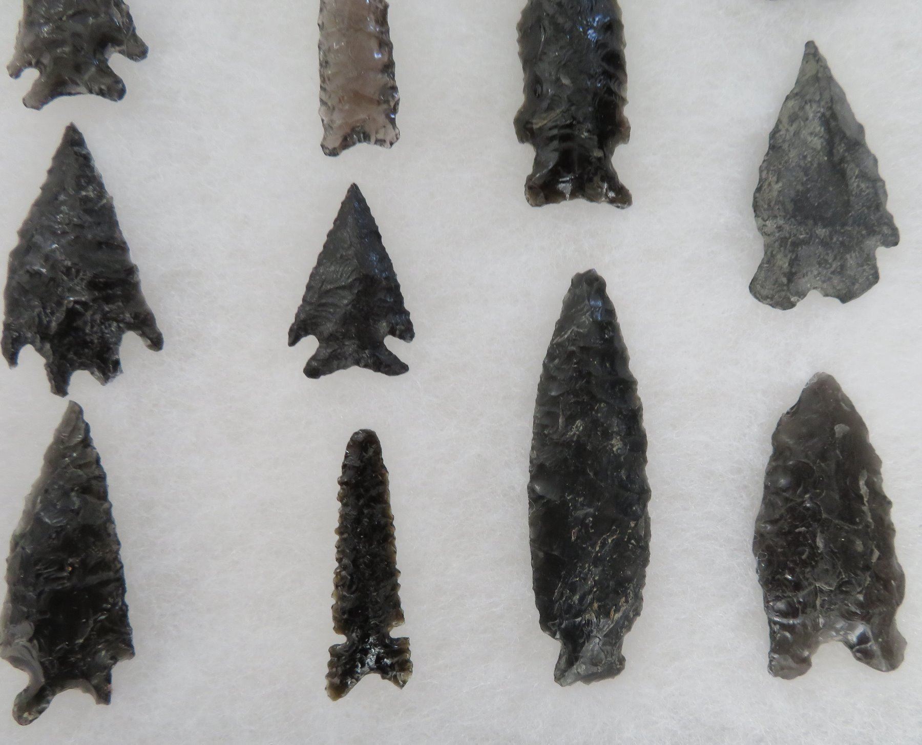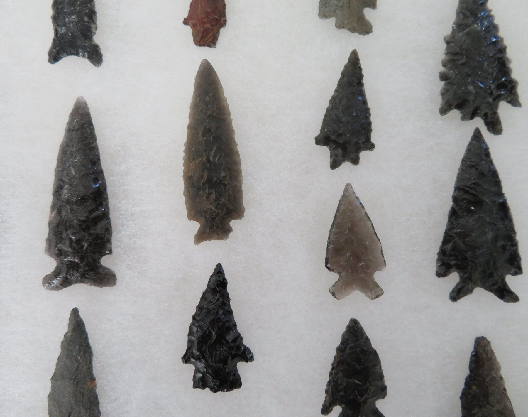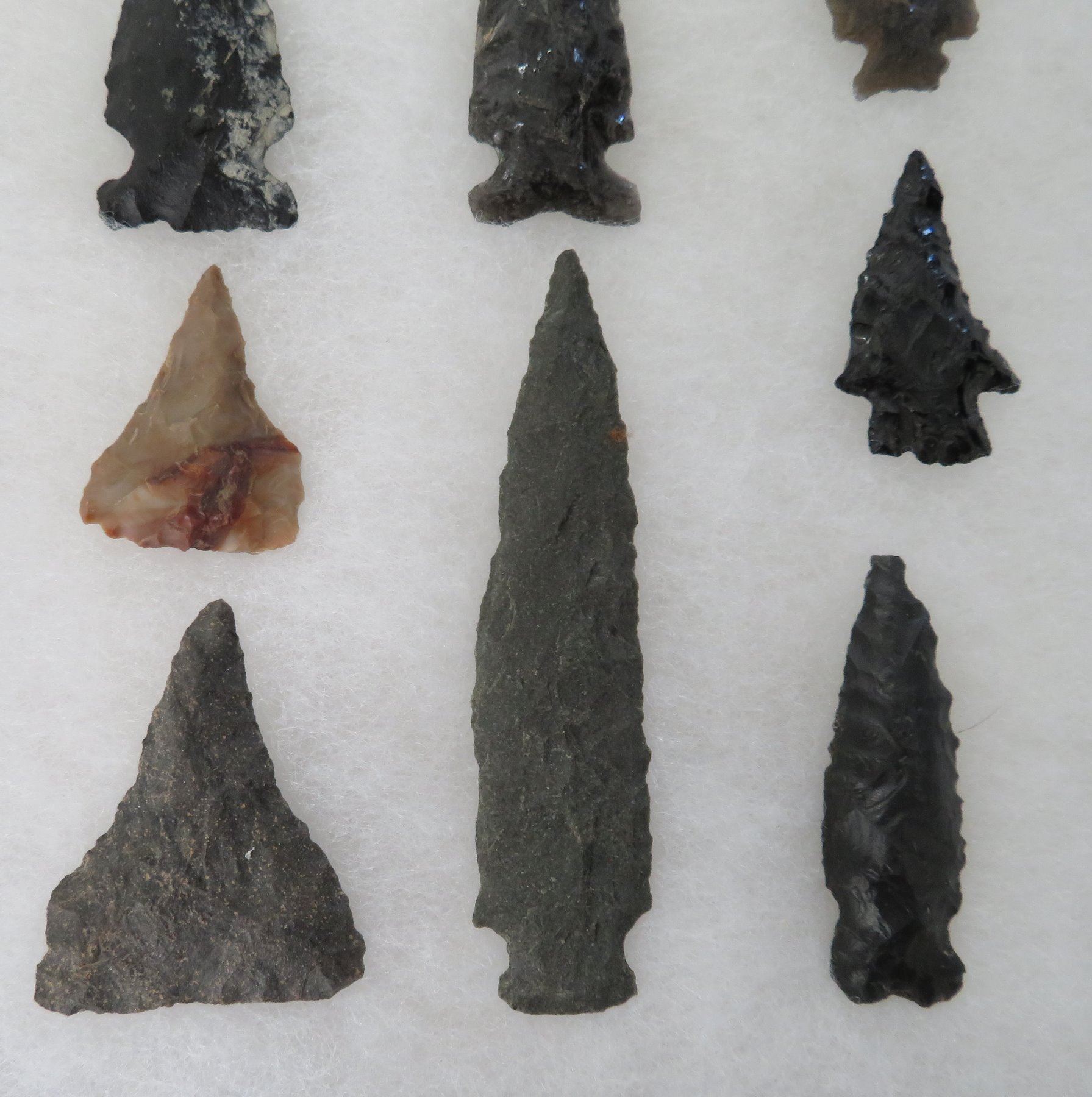 California Obsidian Collection, pre-historic items. Made of mainly obsidian stone, the items measure from 1" to 3 1/4". Sutter County, California. Elkos, pinto basins. From a 60-year-old California collection. Frame not included. Condition: As found, see images. Shipping: $30.00 w/insurance and signature.