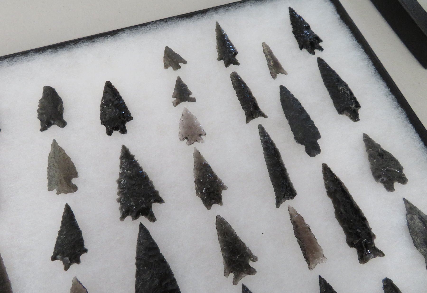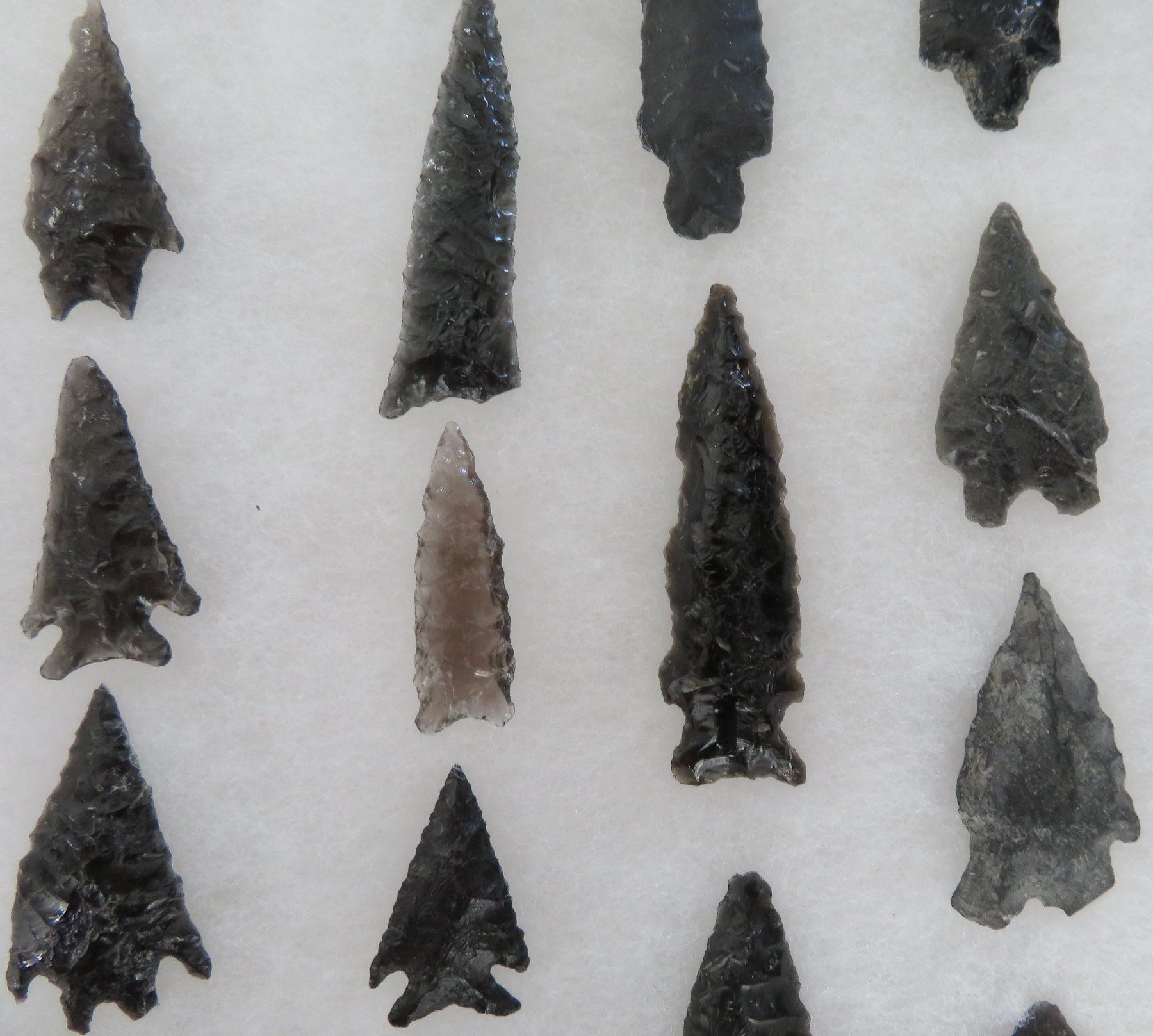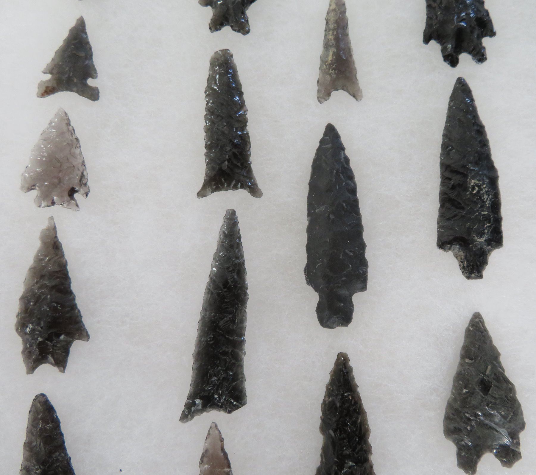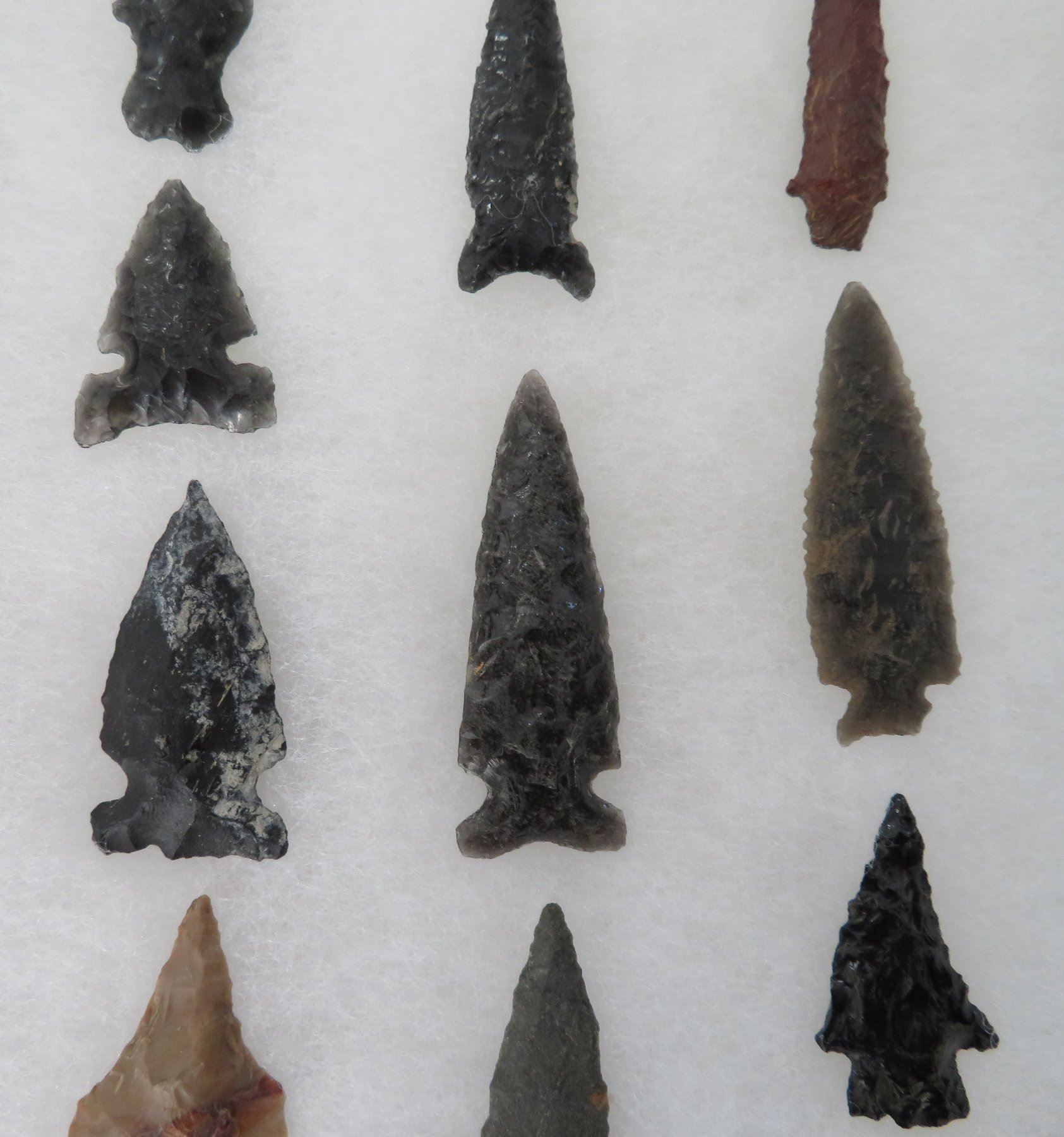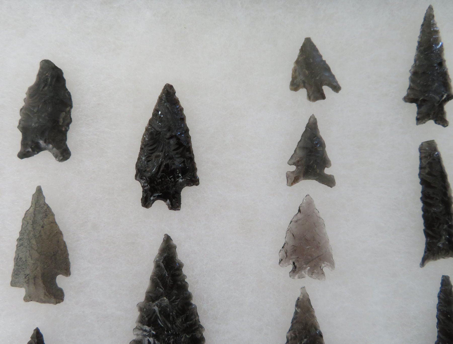 California Obsidian Collection, pre-historic items. Made of mainly obsidian stone, the items measure from 1" to 3 1/4". Sutter County, California. Elkos, pinto basins. From a 60-year-old California collection. Frame not included. Condition: As found, see images. Shipping: $30.00 w/insurance and signature.