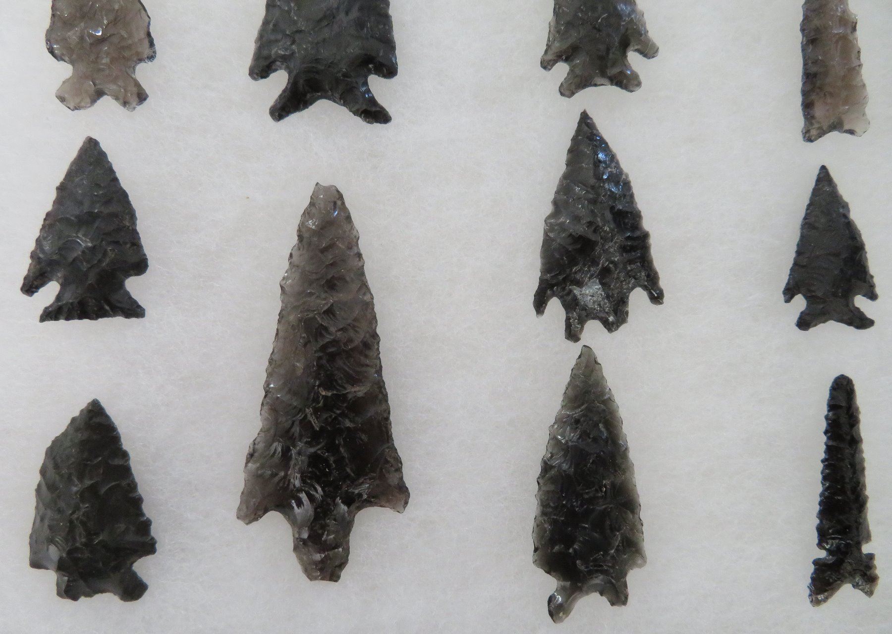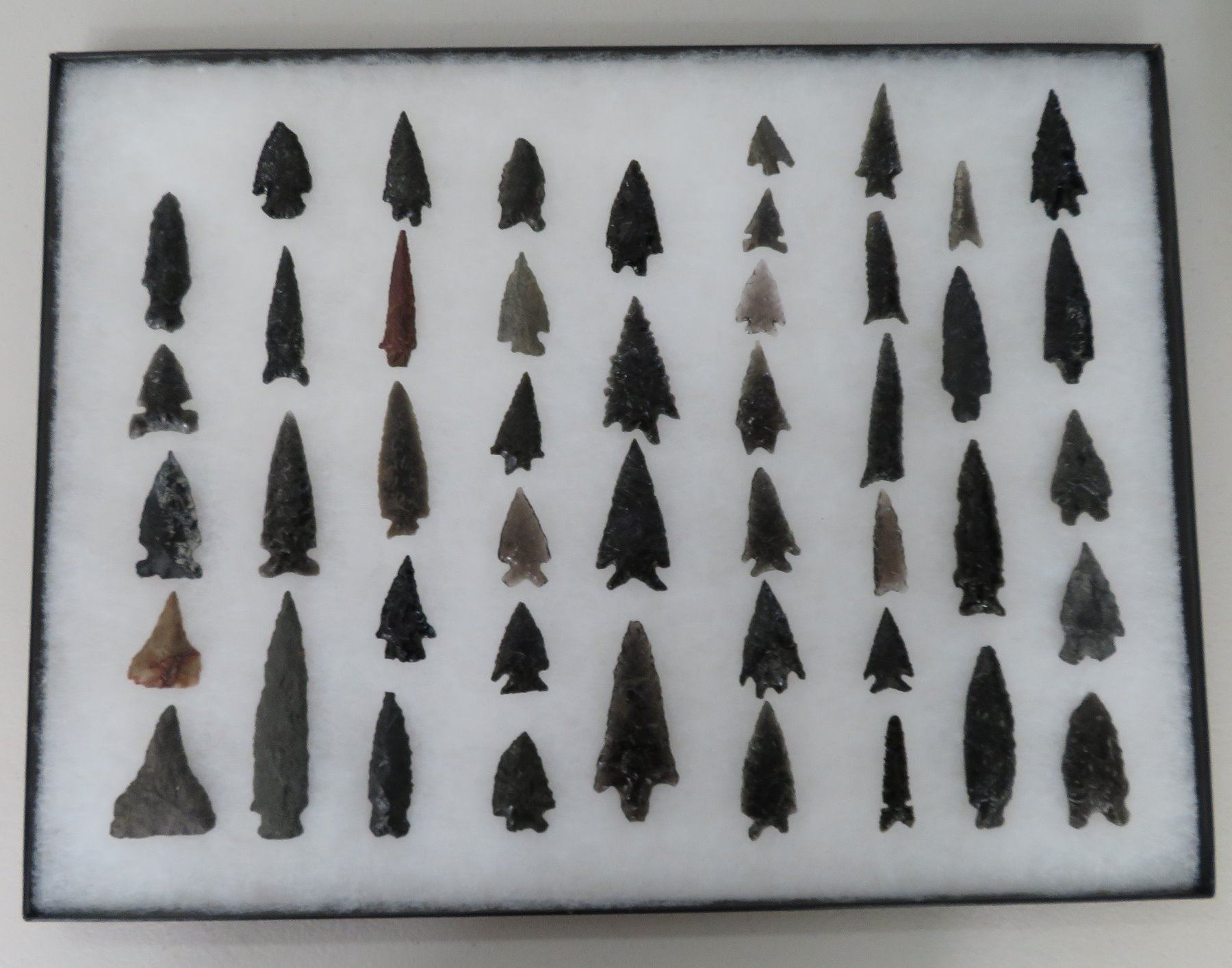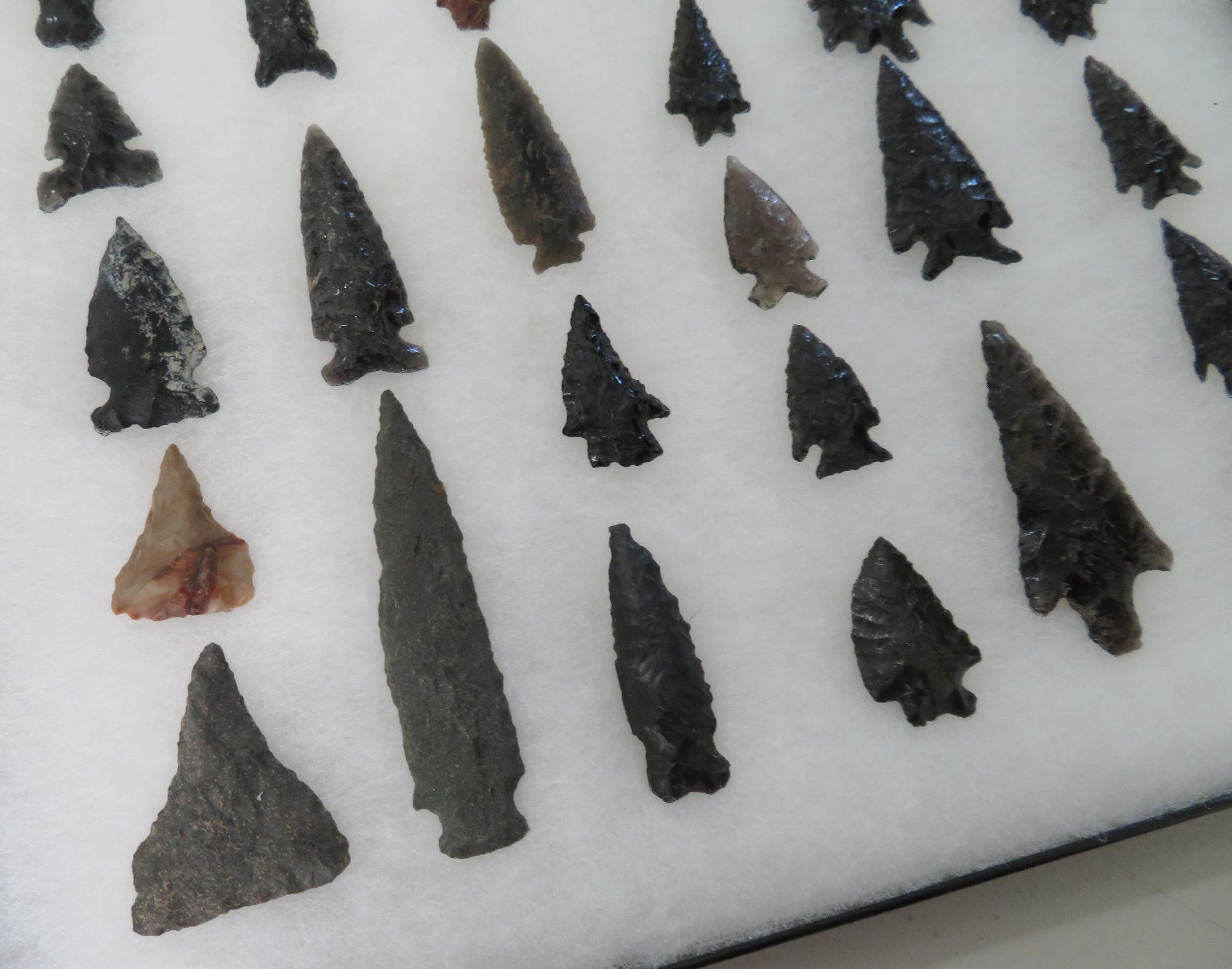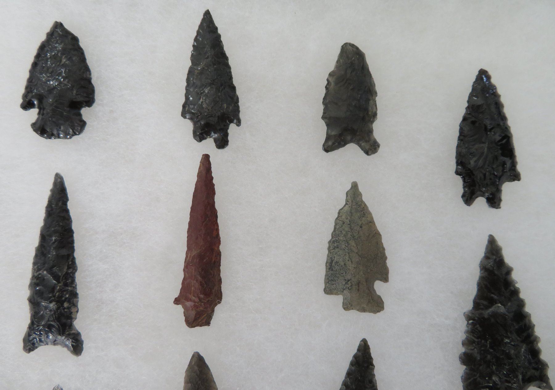California Obsidian Collection, pre-historic items. Made of mainly obsidian stone, the items measure from 1" to 3 1/4". Sutter County, California. Elkos, pinto basins. From a 60-year-old California collection. Frame not included. Condition: As found, see images. Shipping: $30.00 w/insurance and signature.
