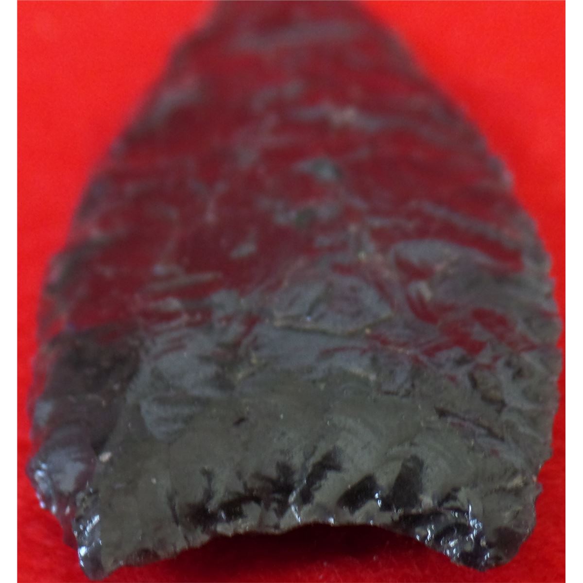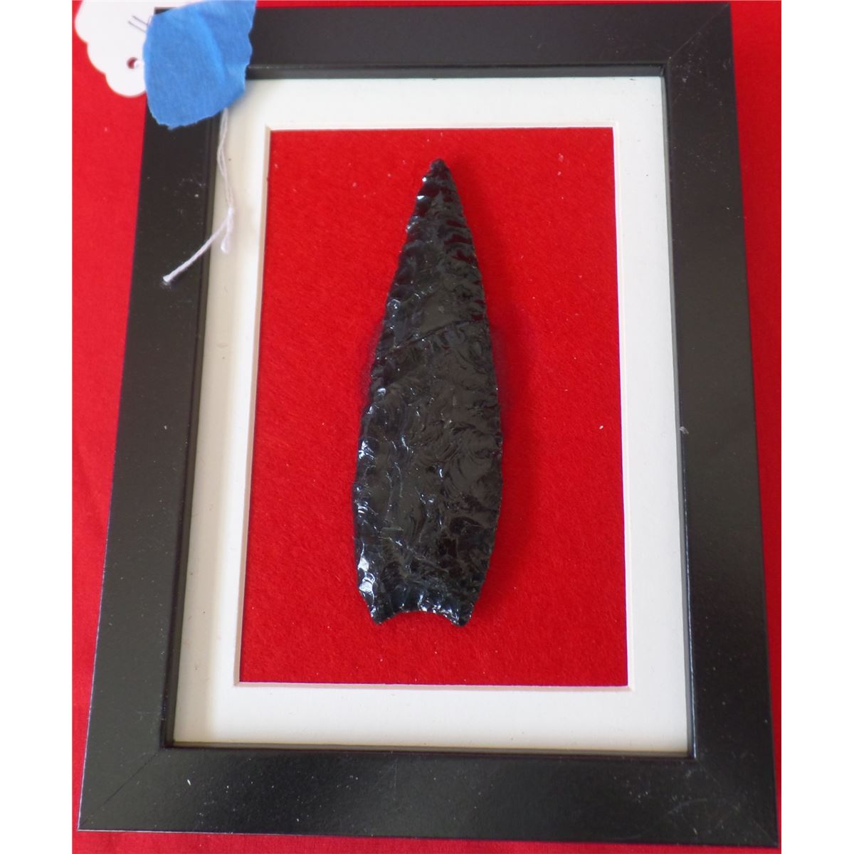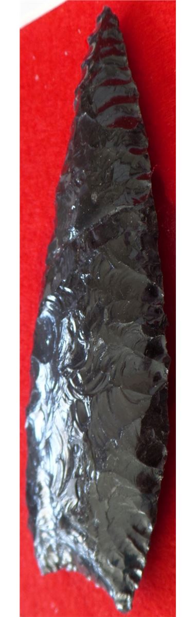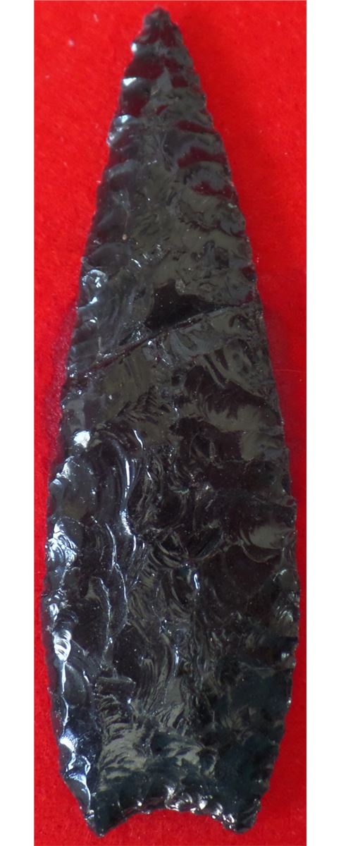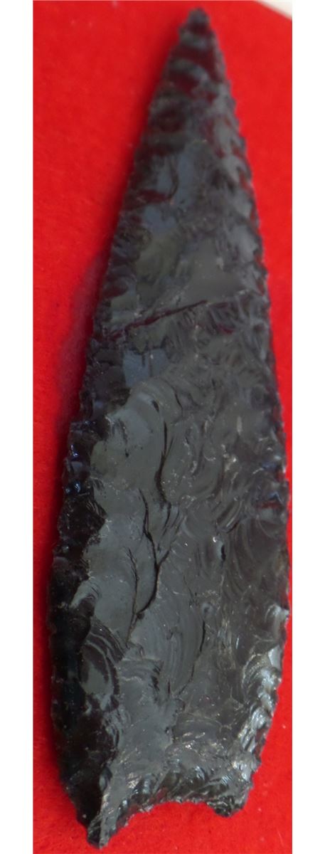 California Obsidian Point - Early man, Paleo shape. The point has fine chipping and is in nice condition measuring 4 3/4 x 1 1/2 inches. Shipping $12.00