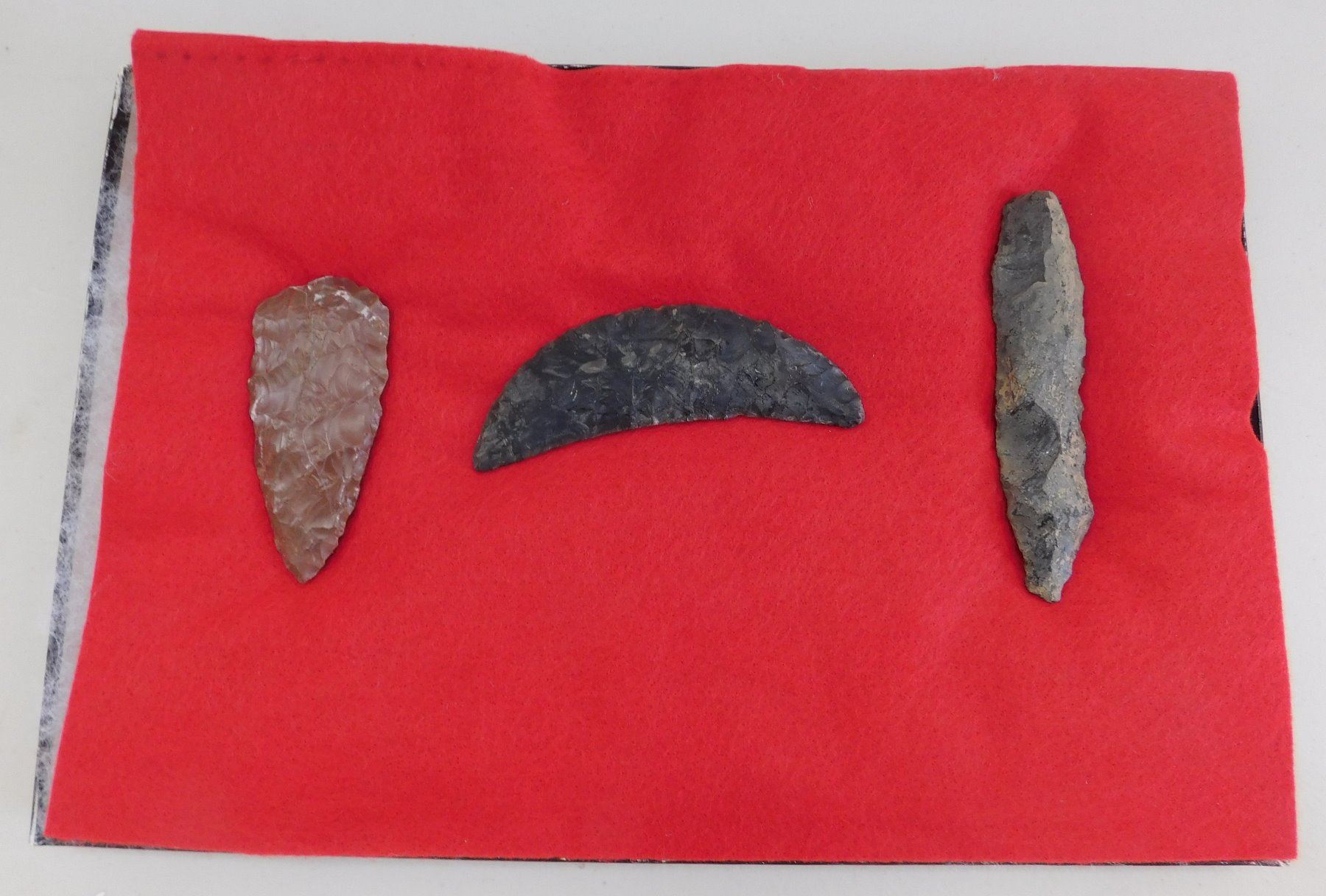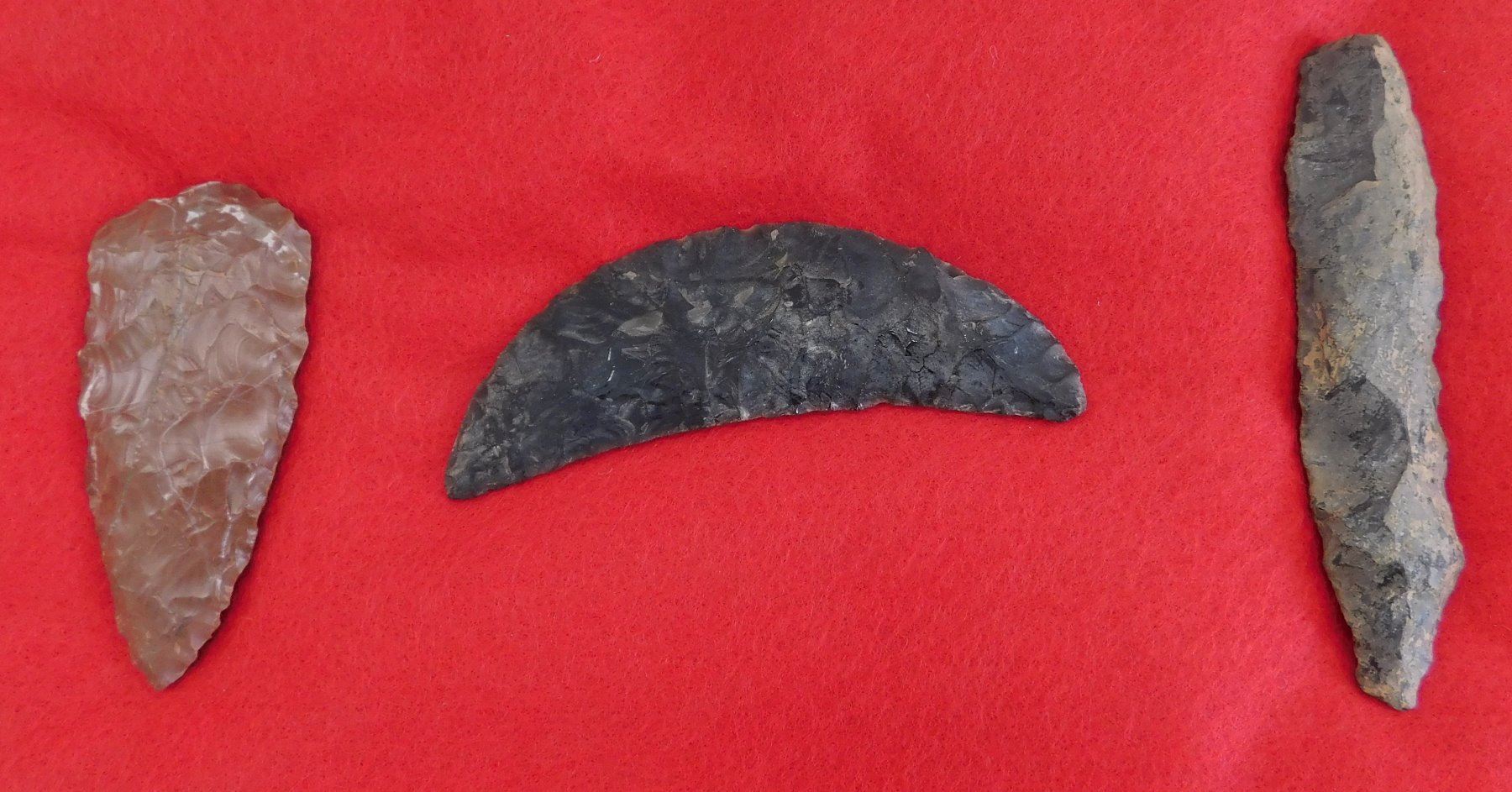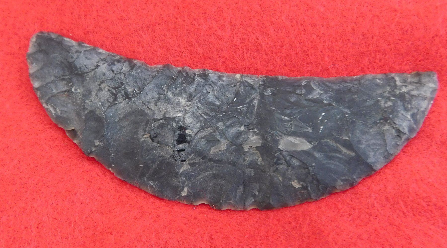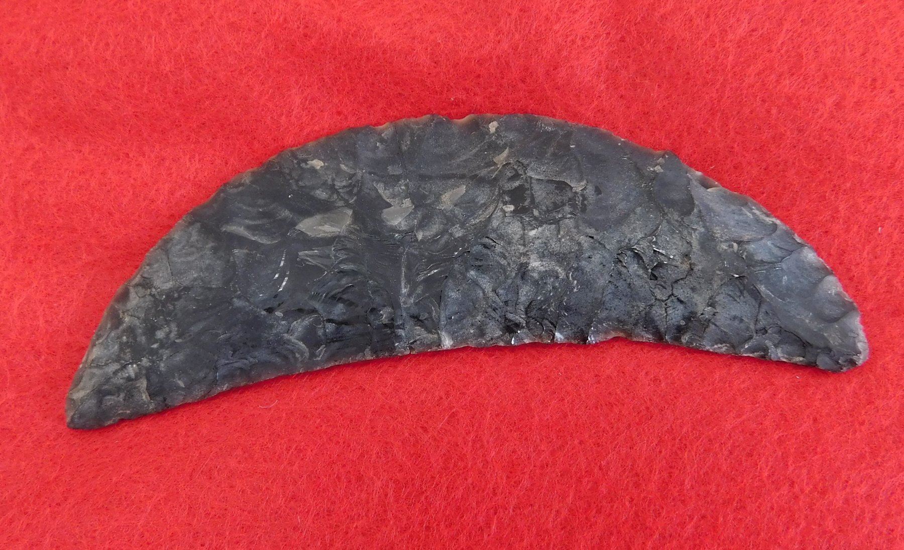 California Paleo Crescent Flint Collection, paleo period. Made of obsidian, the largest item measures 4". Kings County, California. Crescent has crack and is 4" long. Frame not included. Condition: As found, crescent has crack, see images. Shipping: $20.00 w/insurance and signature.