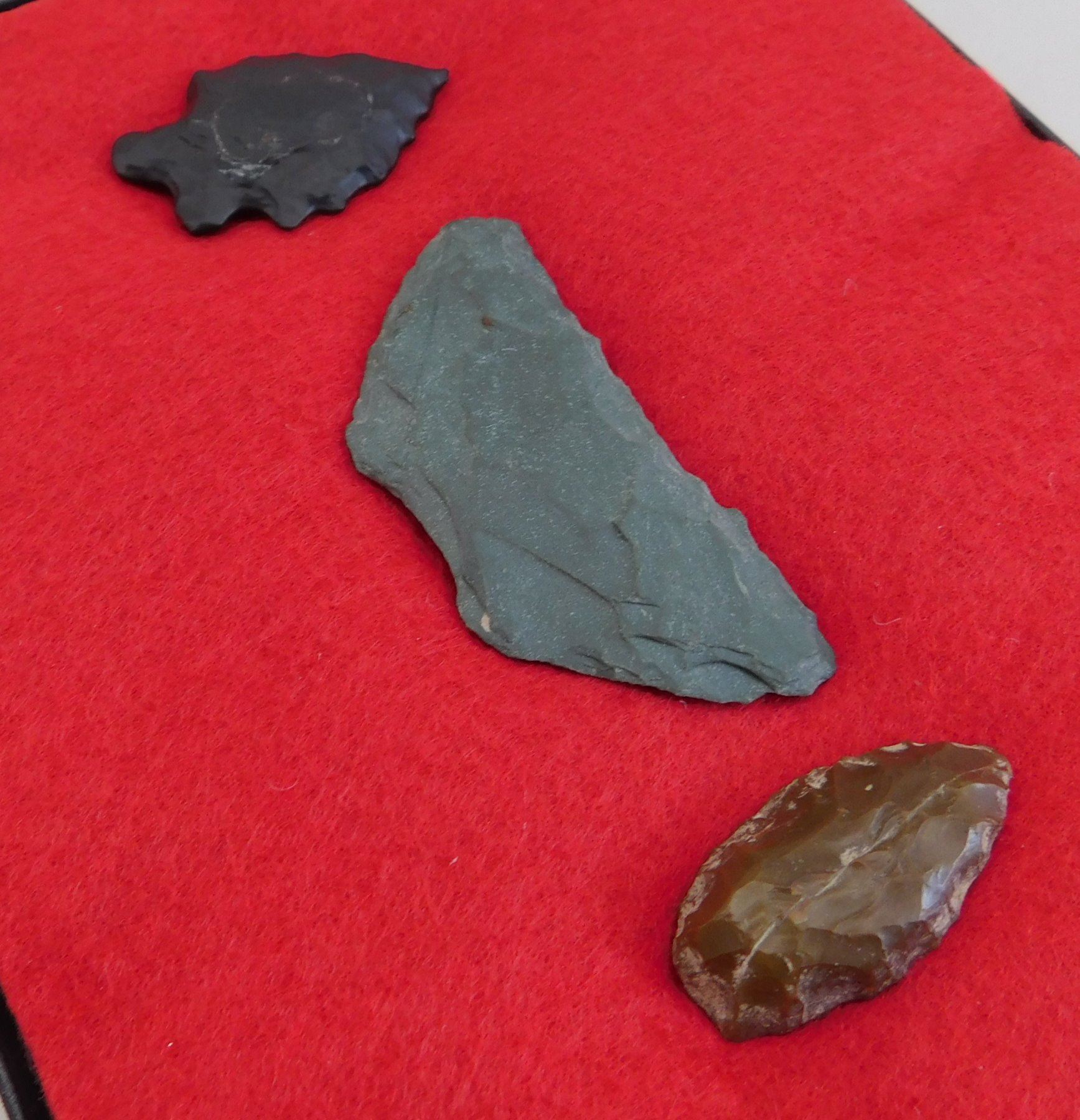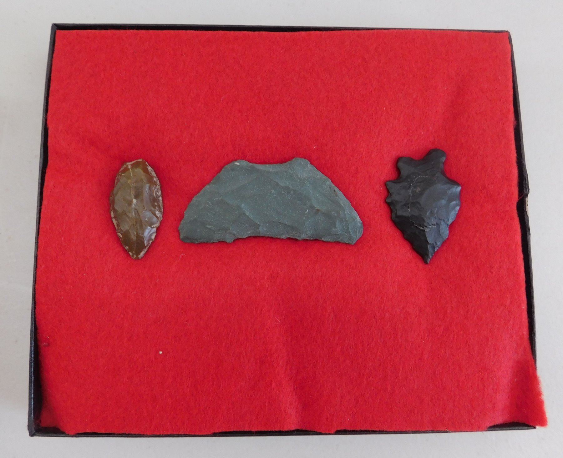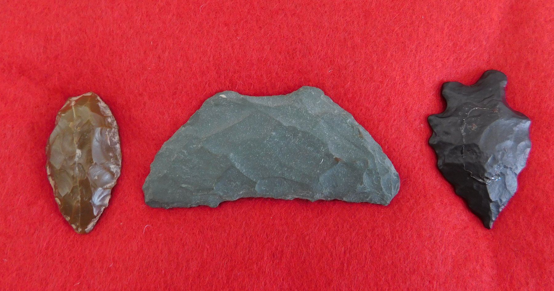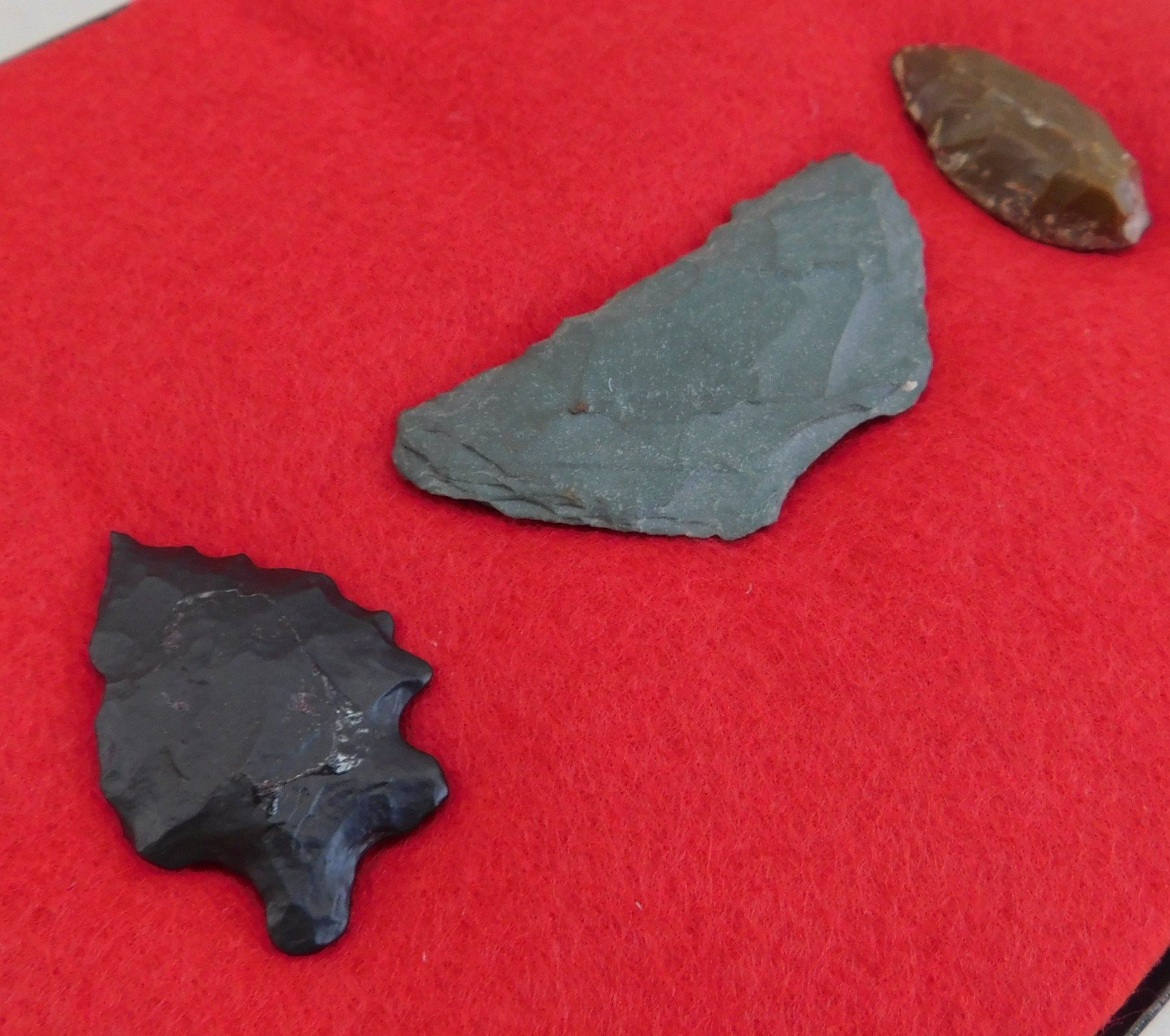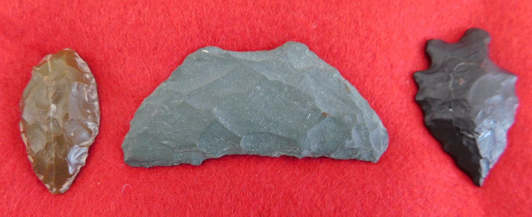 California Paleo Crescent Flint Collection, paleo period. Made of obsidian and chert, the largest item measures 2.5" long. Kings County, California, USA. Nice crescent and pinto point. Frame not included. Condition: As found, see images. Shipping: $15.50 w/insurance and signature.