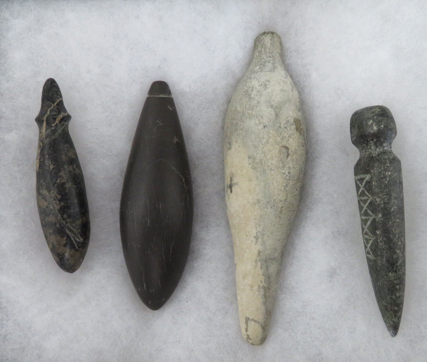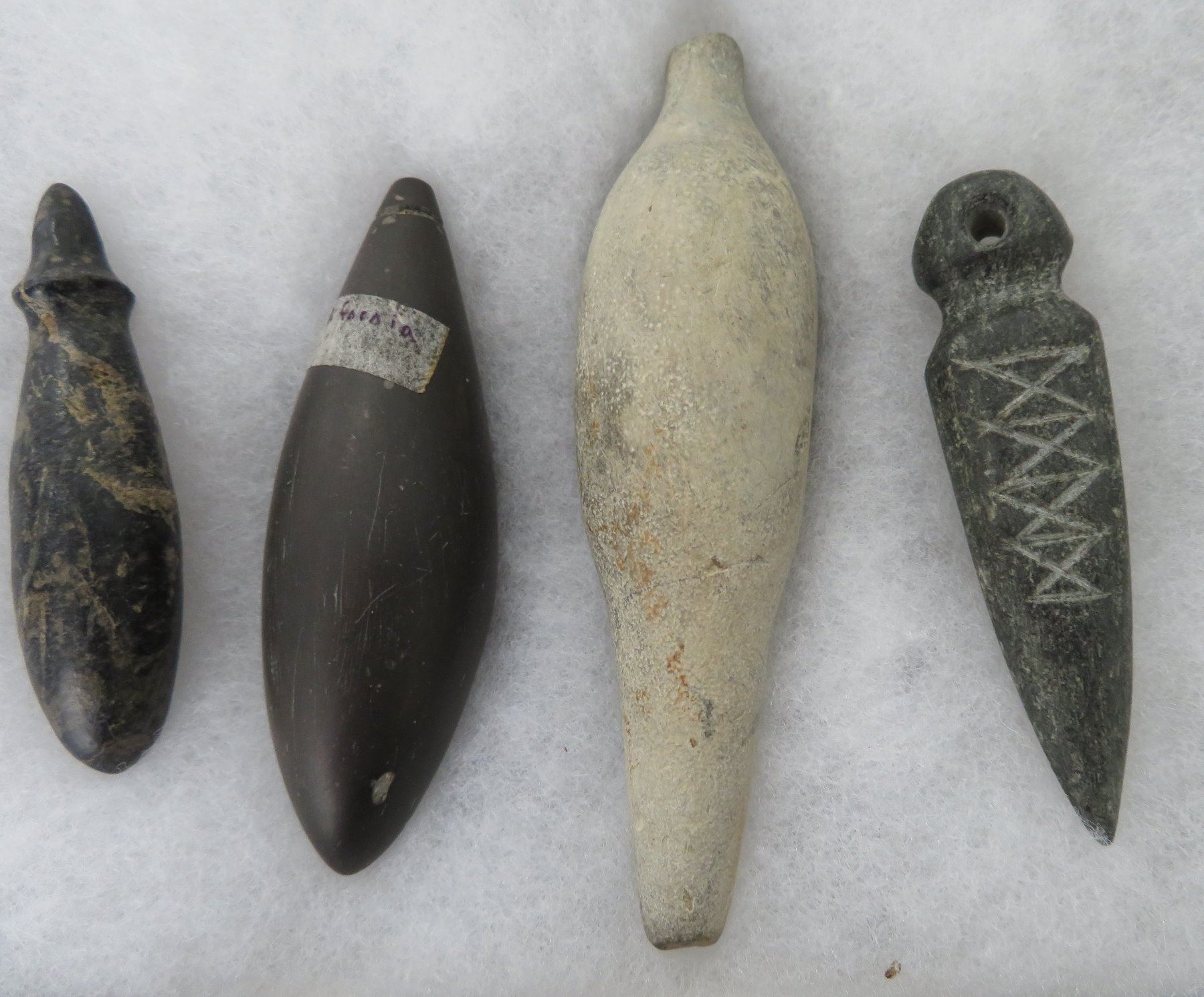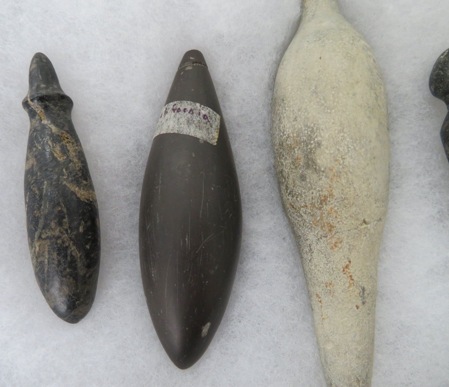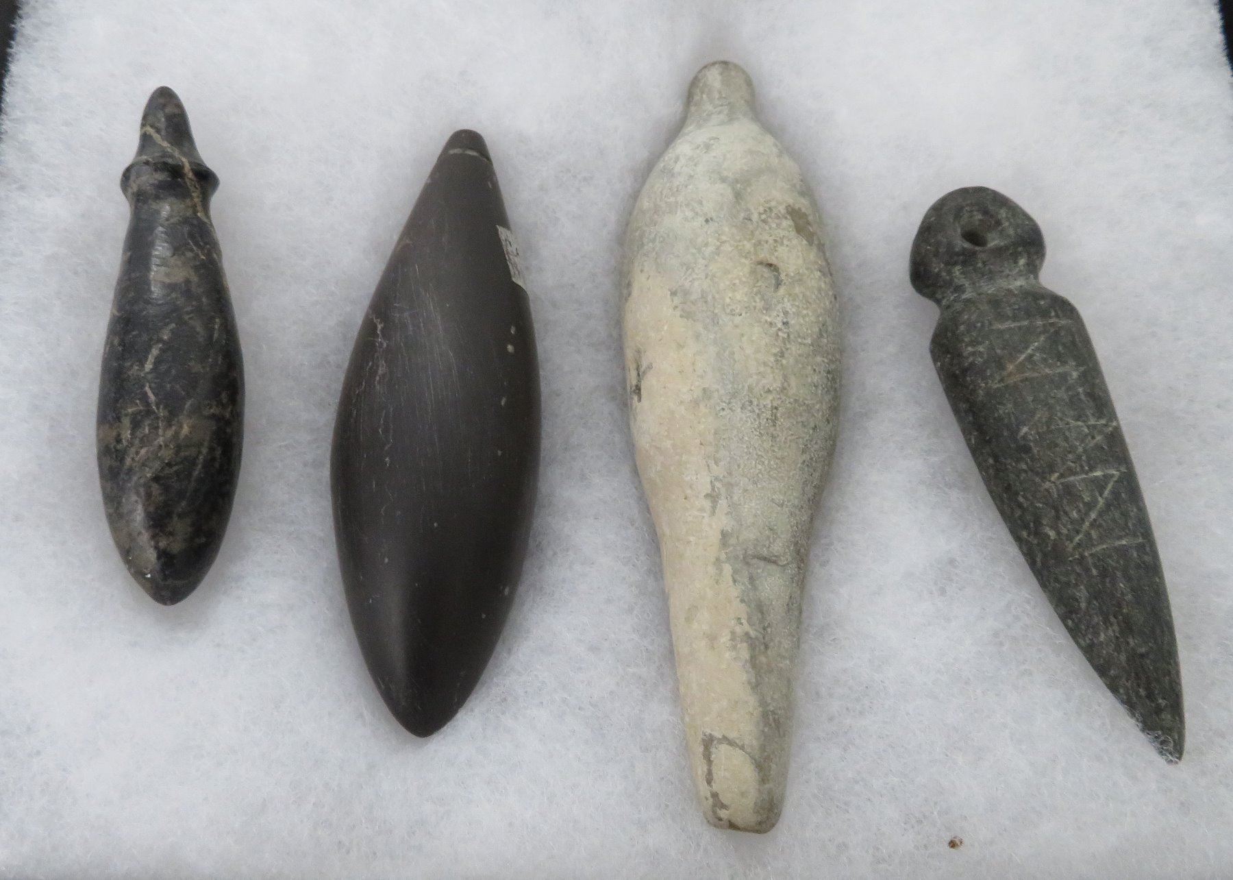 California Plummet Collection, pre-historic items. Made of steatite, basalt and granite stone, the items measure 3 1/4" to 4 7/8". Chumash, Santa Barbara County, California. Nice plummet collection. From a 60-year-old California collection. Frame not included. Condition: As found, see images. Shipping: $28.50 w/insurance and signature, due to value.