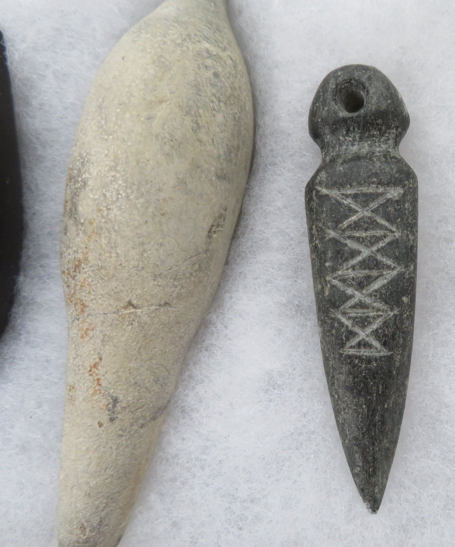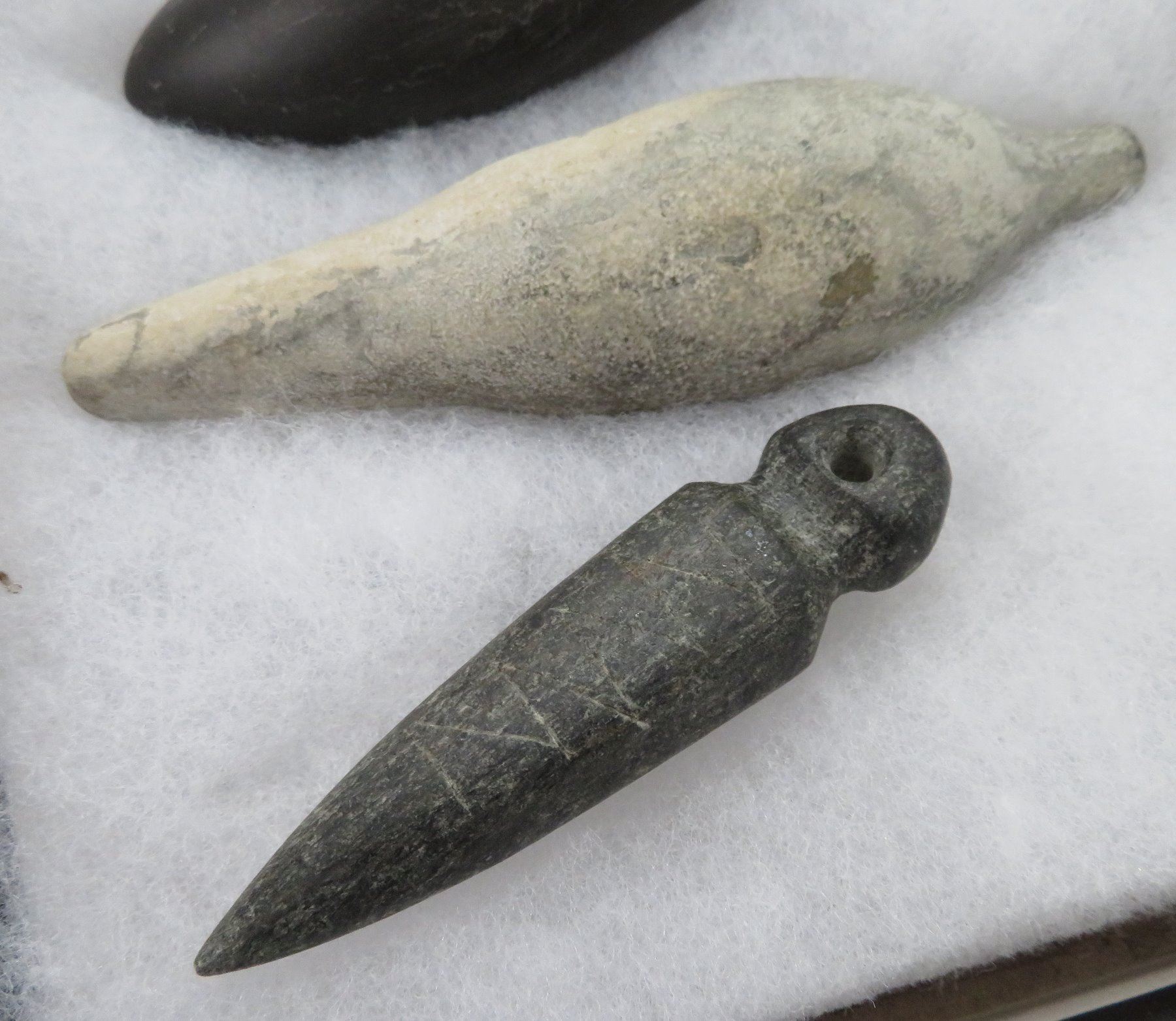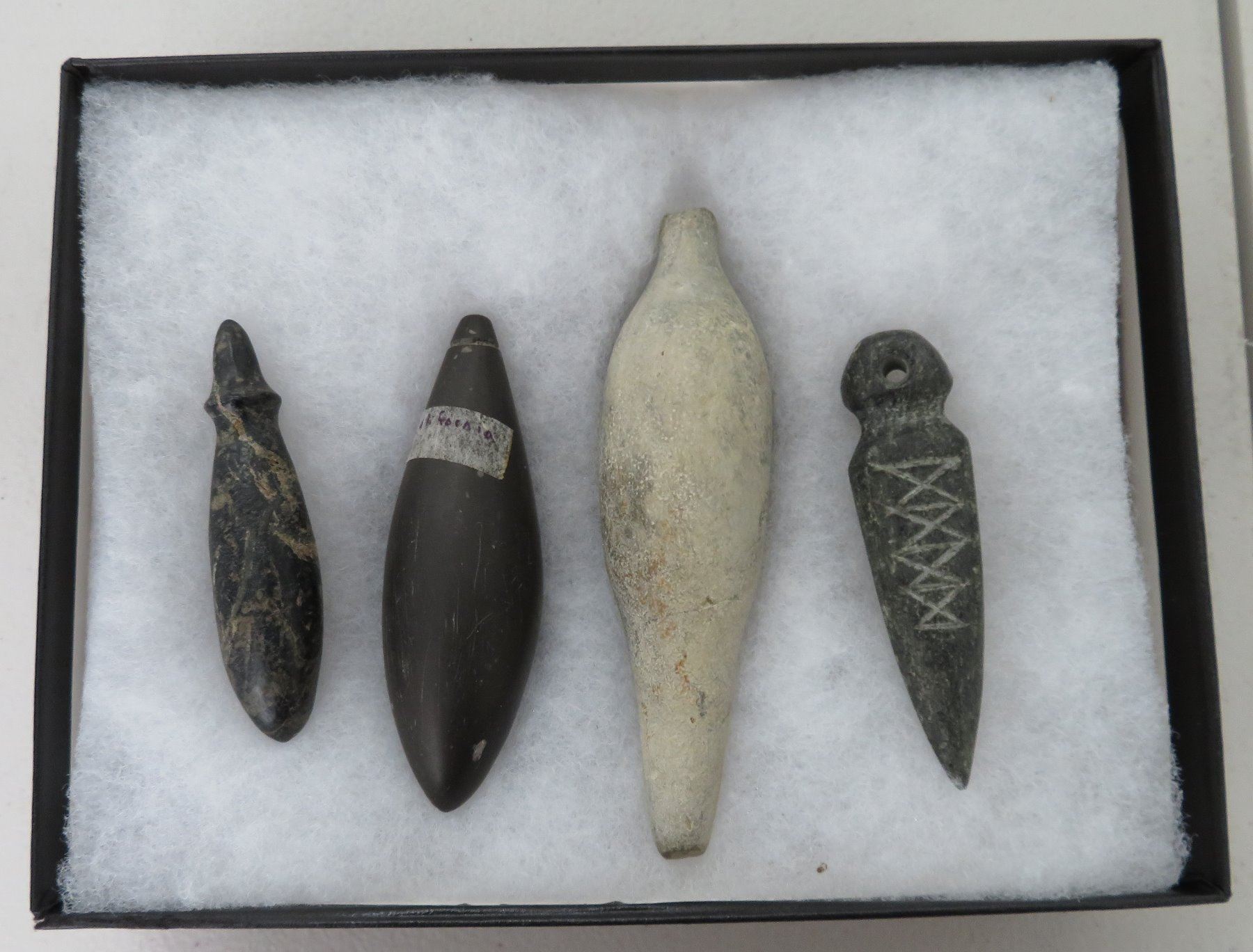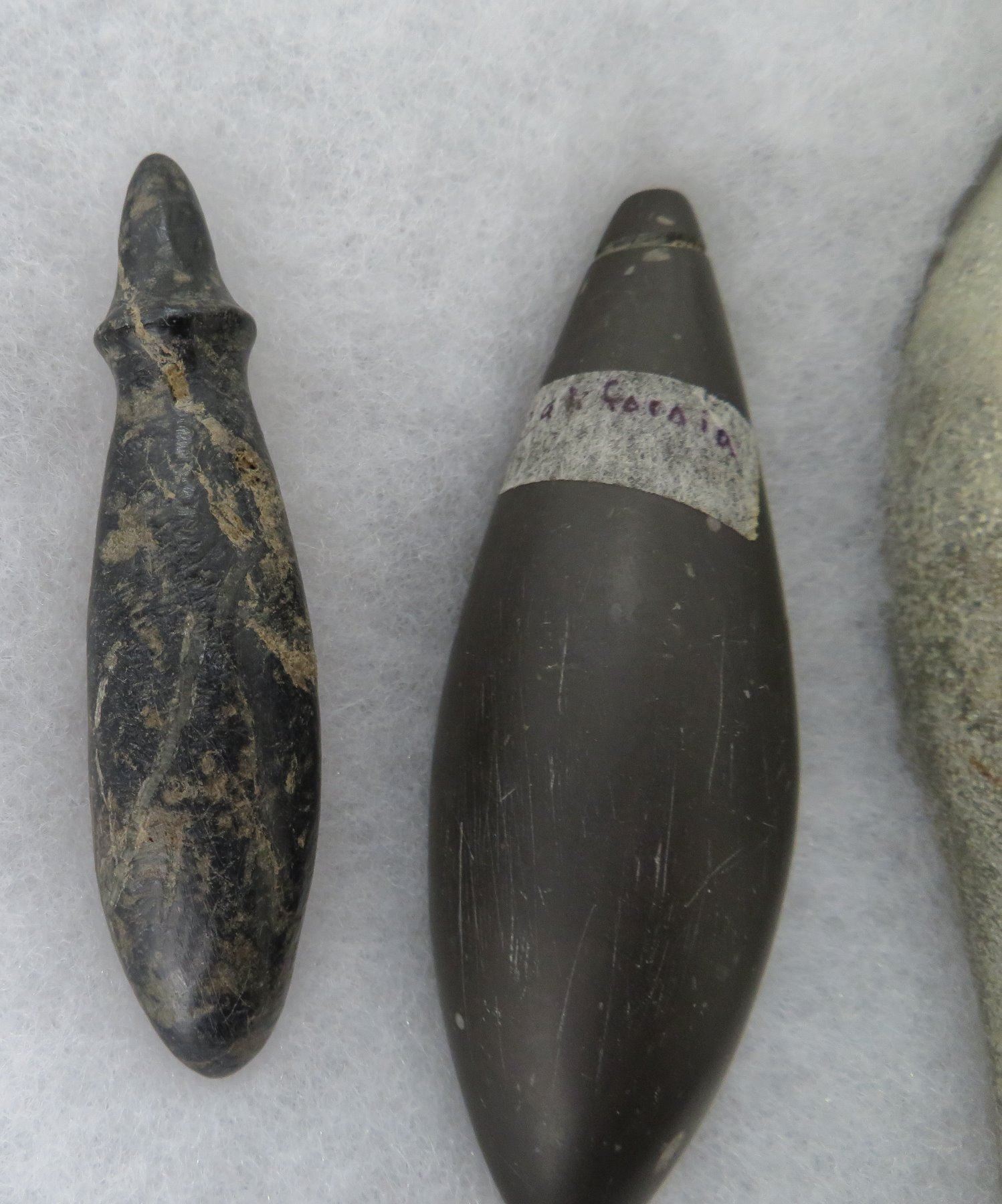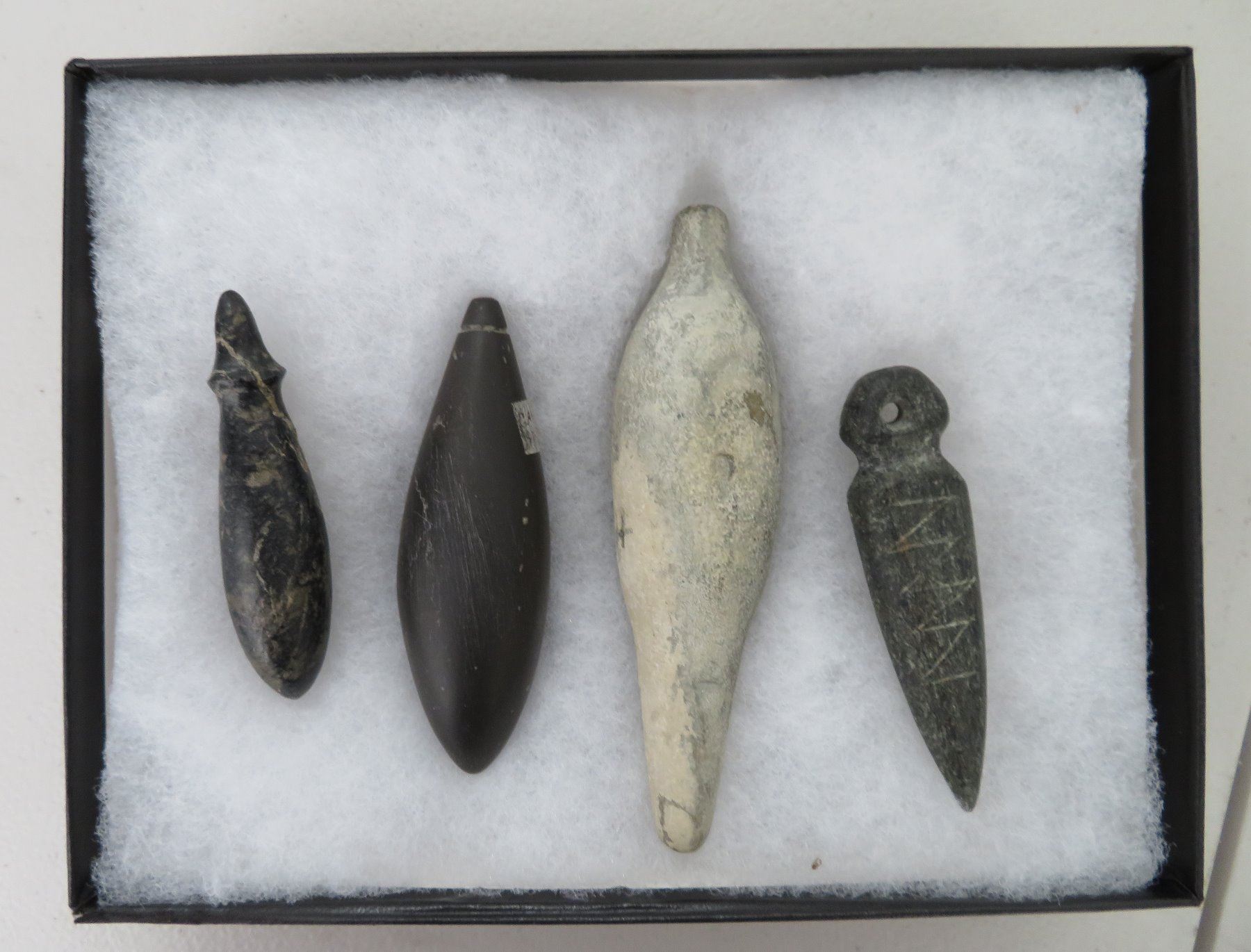 California Plummet Collection, pre-historic items. Made of steatite, basalt and granite stone, the items measure 3 1/4" to 4 7/8". Chumash, Santa Barbara County, California. Nice plummet collection. From a 60-year-old California collection. Frame not included. Condition: As found, see images. Shipping: $28.50 w/insurance and signature, due to value.
