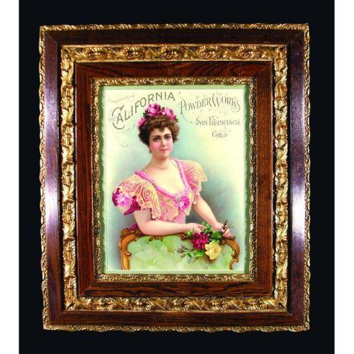California Powder Works Paper Sign, San Francisco, Cal. These California Powder signs are extremely rare and difficult to find. Very Good original condition in period gesso frame. 14 X 18 1/2 inches image only.