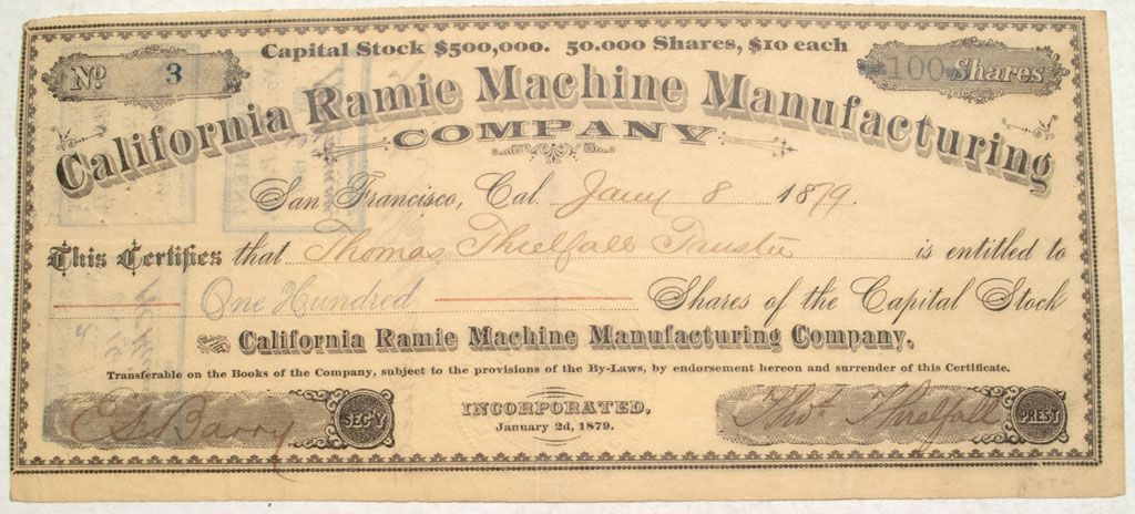 Very early number 3 for 100 shares to Thomas Threlfall, trustee, issued on January 8, 1879. Signed by secretary E. Barry and president Threlfall. Ramie is a cloth that comes from a plant commonly known as China Grass.