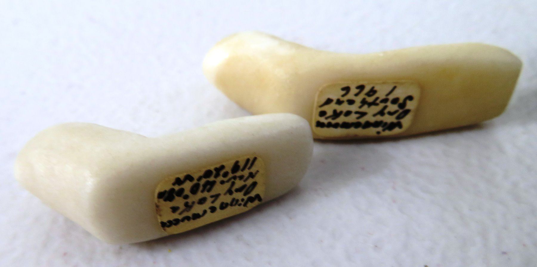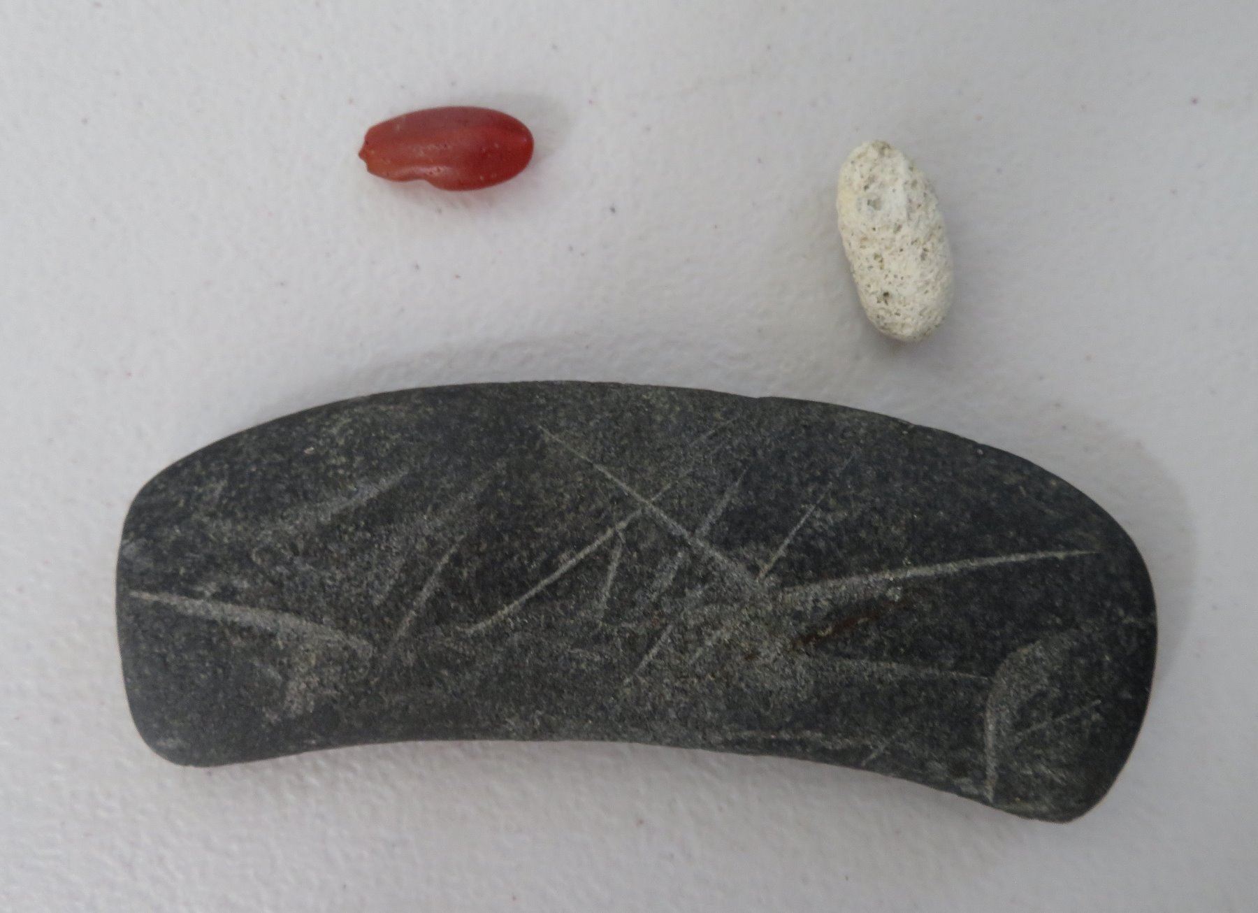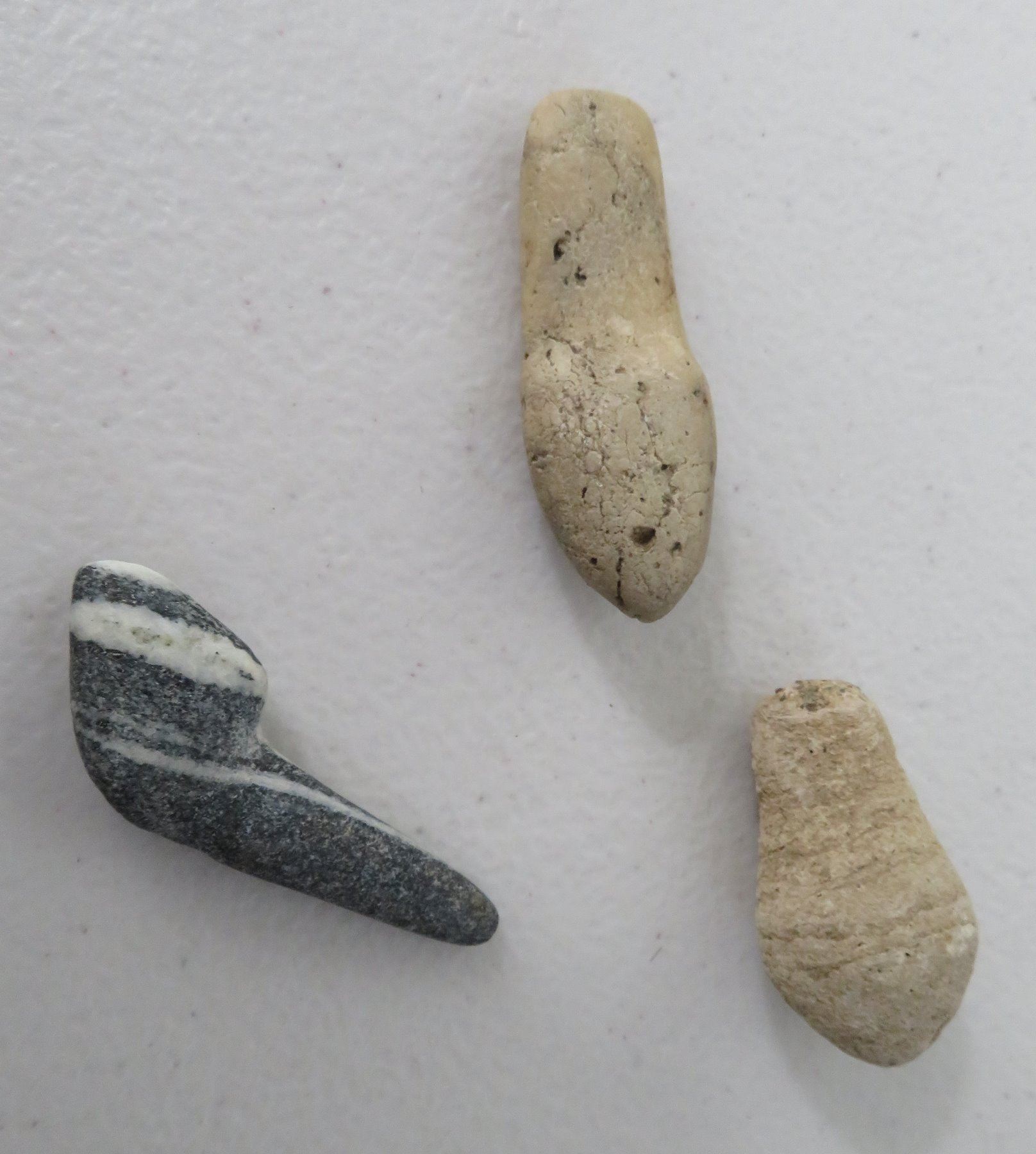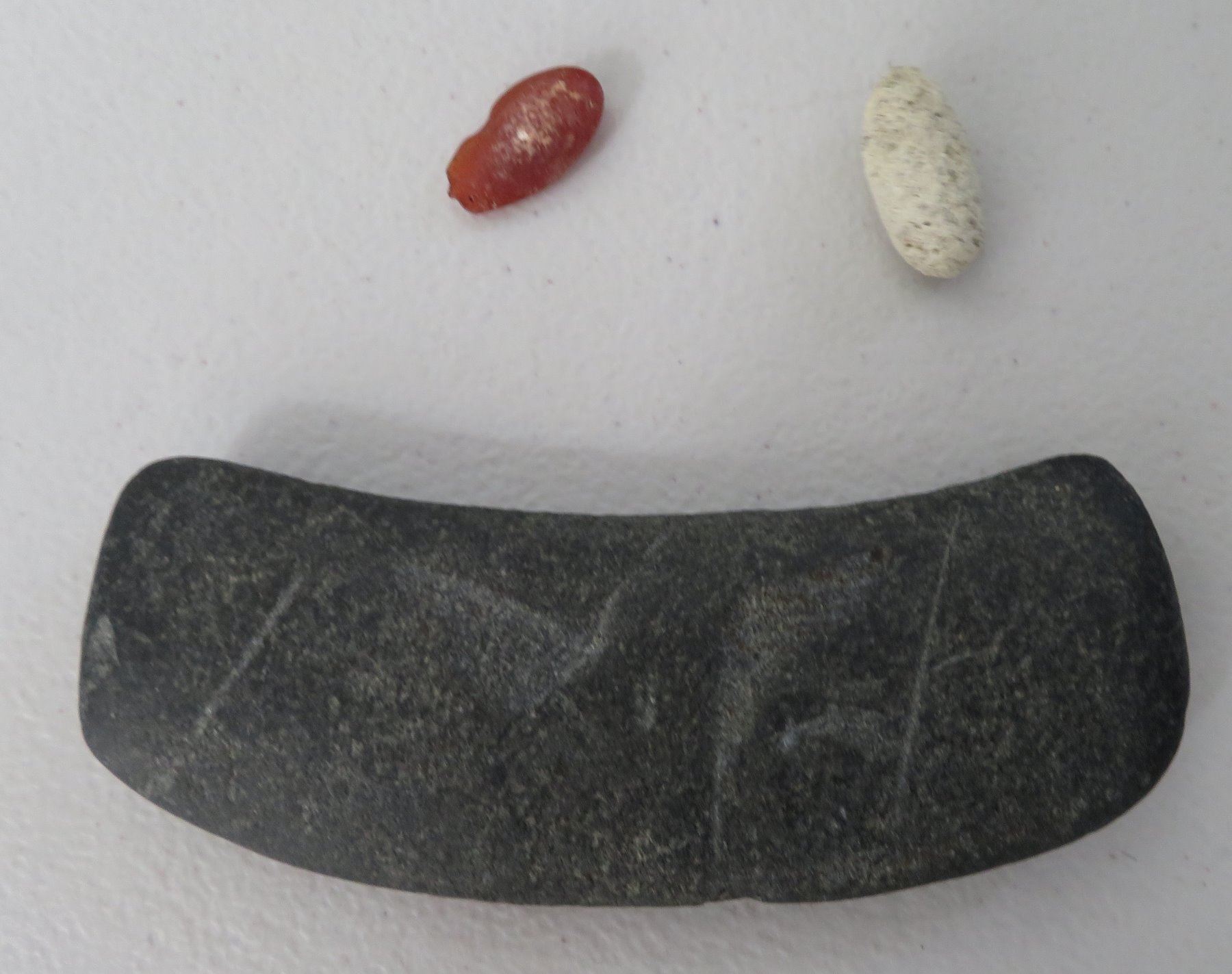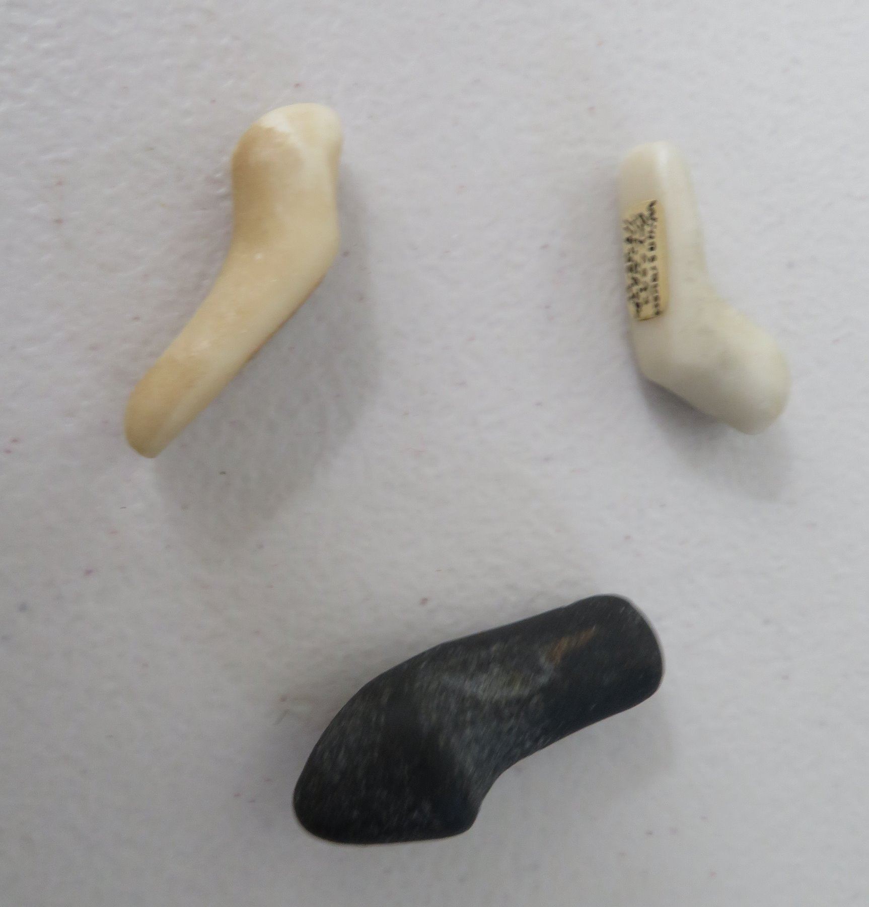 California Relics, pre-historic items. Made of wood, stone, basalt and quartz, the items measure from 1" to 5". California central coast, Chumash. Effigies included. From a 60-year-old California collection. Frame not included. Condition: As found, see images. Shipping: $26.50 w/insurance and signature, due to value.