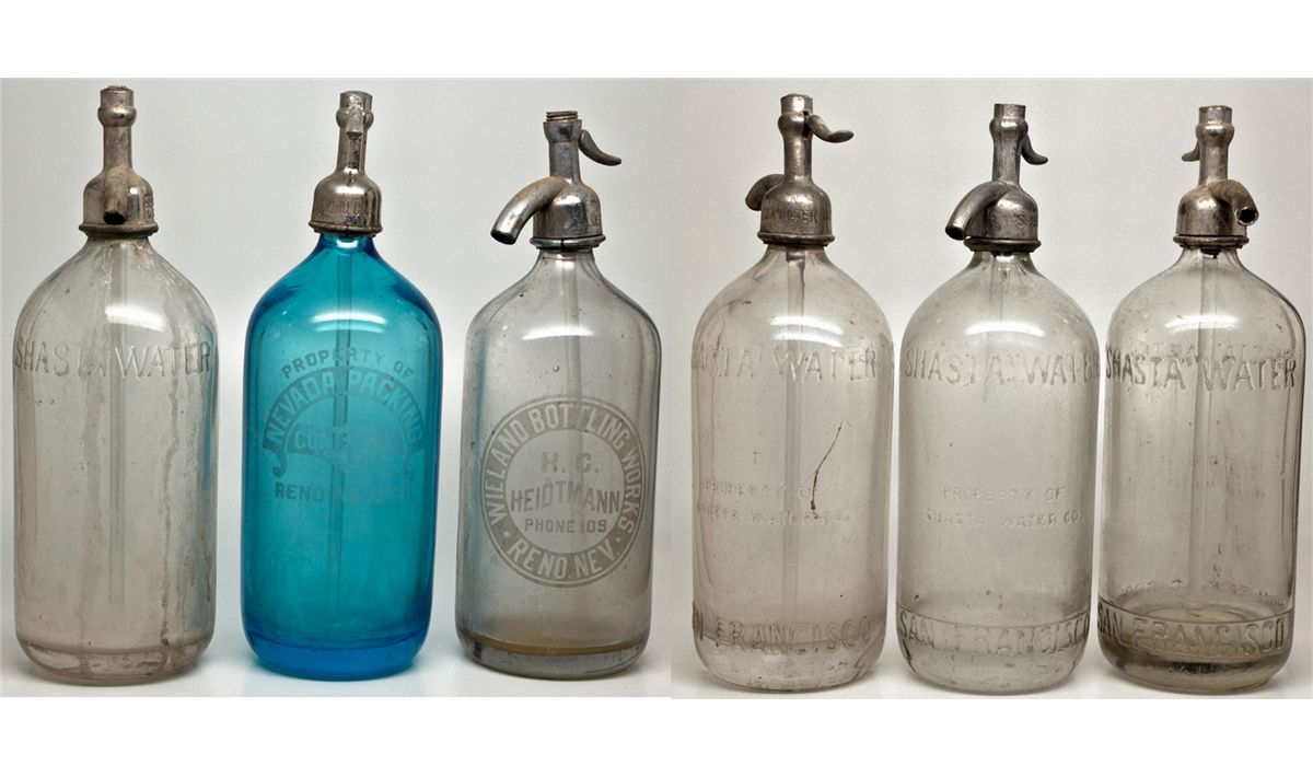 Lot of 6: 1) Beautiful cobalt seltzer bottle, 12", with top, by 4" wide. “Nevada Packing Co.” top logo matches bottle’s decorative front etching “Property of Nevada Packing Company Reno, Nevada.” Siphon tube intact, maker’s mark on the bottom indicates “Made in Czechoslovakia.” This c1907-1910 bottle shows very little wear and the lower portion of the inside bears mineral deposits. Cobalt seltzers such as this are extremely rare, with perhaps five specimens known in collections, and "may have been presented as Christmas gifts for the company’s clients” [Ref: Nevada History Through Glass, Vol 1, Fred Holabird, 2012, p. 104]. 2) Seltzer 11.5" tall, with top, which is missing screw-on cap, by 4" wide. “Silver” is engraved on the top, intact siphon tube. “Wieland Bottling Works Reno, Nev.” etched on front. Center front etched “H.C. Heidtmann Phone 109.” No maker’s mark, and the bottle still contains some amber liquid. Clear glass, multiple small bubbles throughout surface, moderate interior staining. Harry C. Heidtmann managed the Wieland Saloon for Otto Benschuetz during the 1910s [Ref: Nevada History Through Glass, Vol 1, Fred Holabird, 2012, pp. 144-5]. 3) The remaining 4 bottles in this lot of 6 are well-known Shasta Water Company seltzers. All are 12" tall, with tops, by 4" wide. All tops match the bottles with a “Shasta Water” logo. Three of the siphon tubes are intact, the last broken in half. Three of the bottles are embossed “Shasta Water” on front and reverse, with “Property of Shasta Water Co.” embossed on the front center. The lower fronts of these three are embossed with “San Francisco.” Two of these three bottles bear a “Made in Czecho-Slovakia” maker’s mark while the third bears none. The fourth bears an embossed “Property of The Shasta Water Co. 15” front and an embossed “Shasta Water” rear, no maker’s mark. All 4 clear glass with signs of wear and staining. This lot is stored in a green wooden "Silver State Syphons Reno" crate. -59435