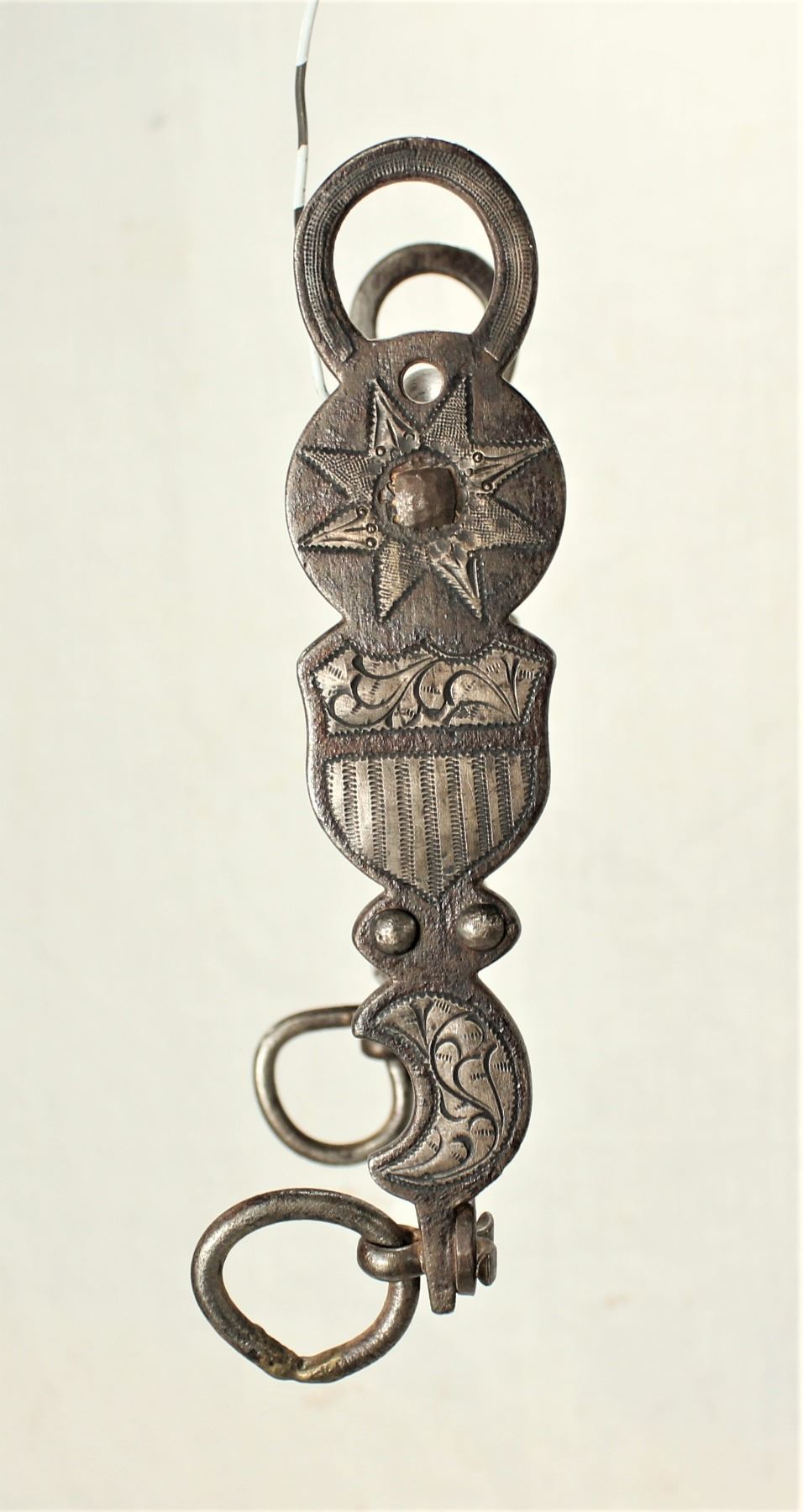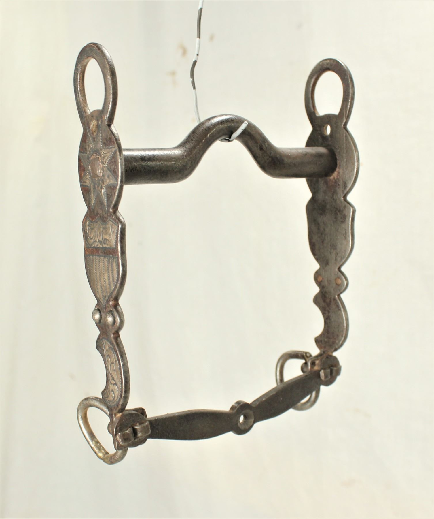 Nice early iron California bit with curb mouthpiece, showing great inlaid silver Shield and star designed cheeks.