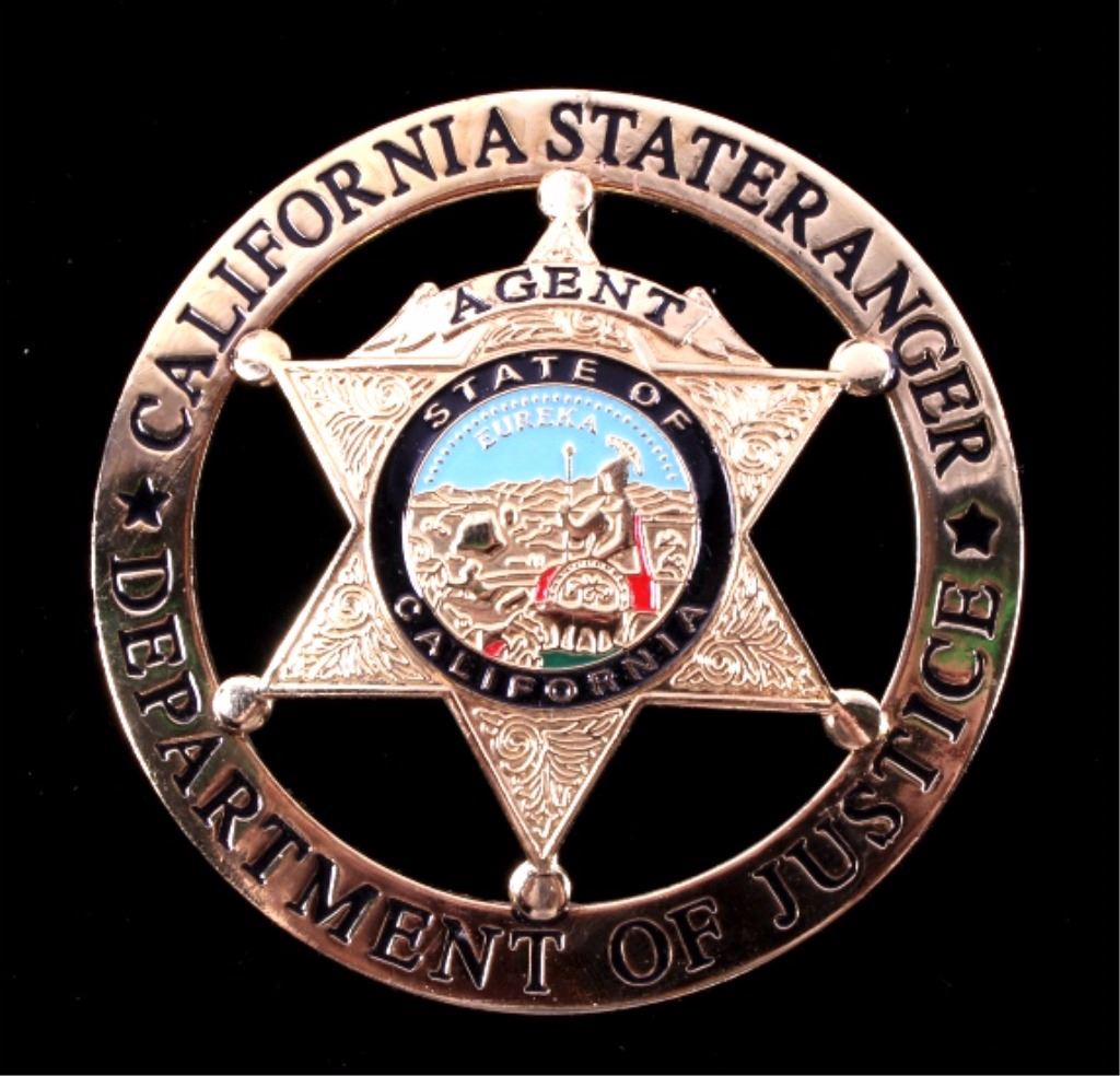 This is a California State Ranger badge. The  badge shows an encircled six point star with  the seal of California in the center. The  badge is in good condition. It measures 2.75"  in diameter.