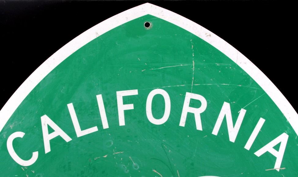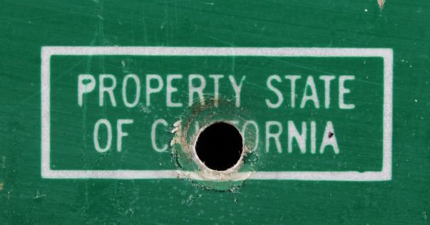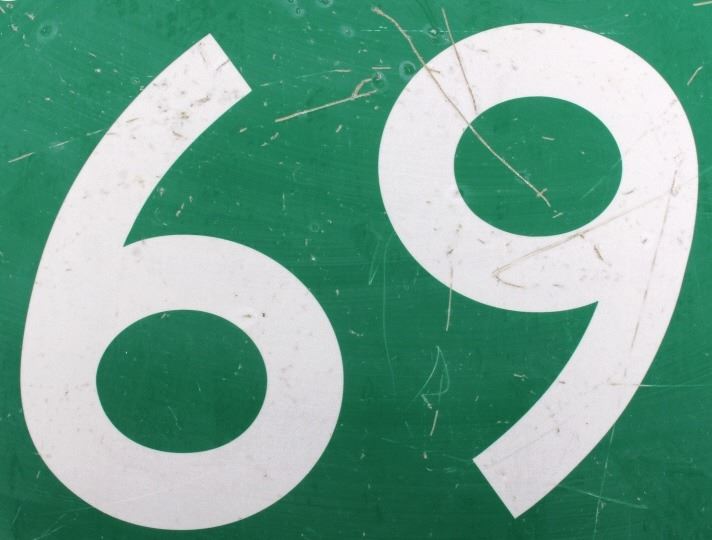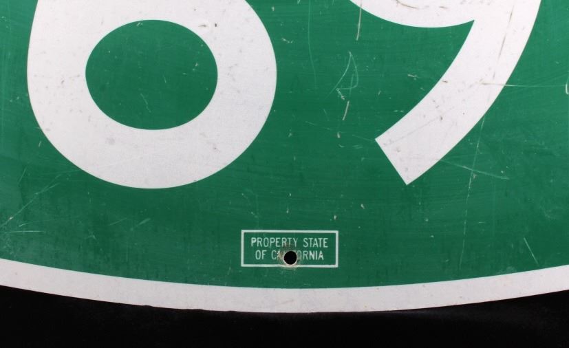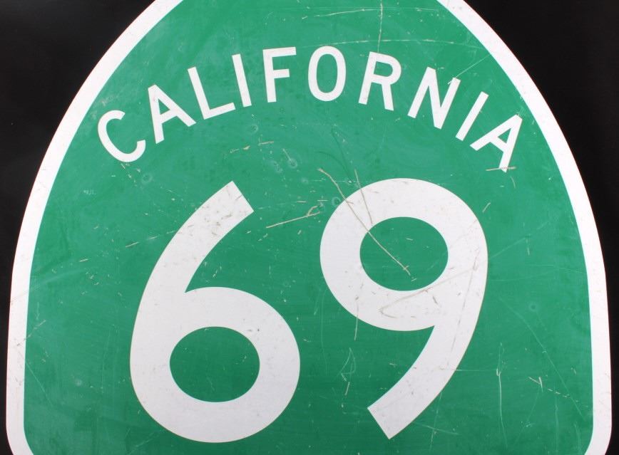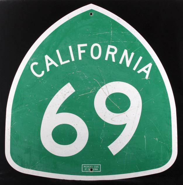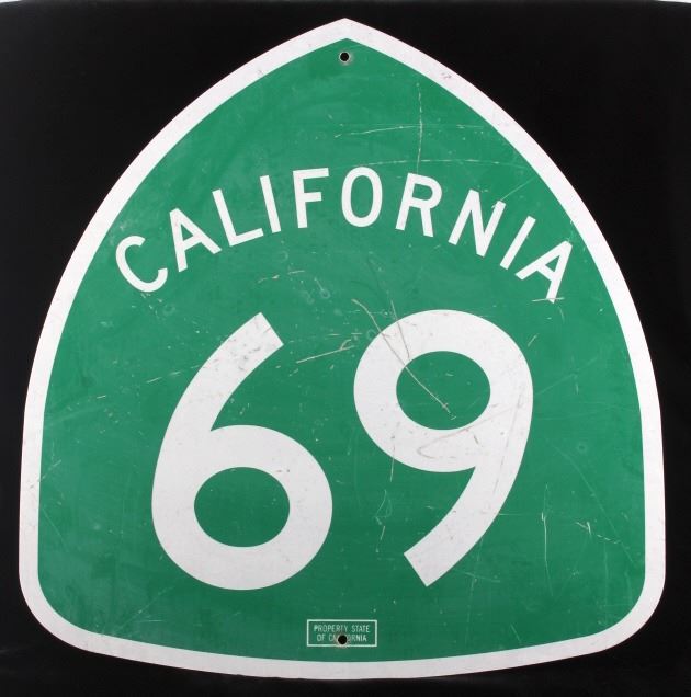 This is an original California State Route 69 highway sign. The sign shows the standard State Route shield and reads "California 69". The sign is also marked "Property State of California". The highway sign is in good overall condition with moderate wear. The sign measures 24" x 25".