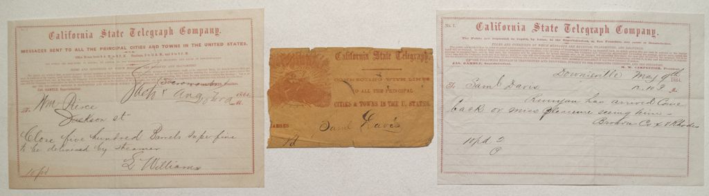 Lot of three. 1) May 9, 1864 telegraph to Samuel Davis of Downieville. "Runyan has arrived." From Brown, Cox, & Rhodes. 2) Cover for first telegraph. Roughly town at left. 3) 1861 telegraph to Mr. Pierce of Sacramento. Five hundred super fine barrels to be delivered by steamer. From S (L?) Williams.