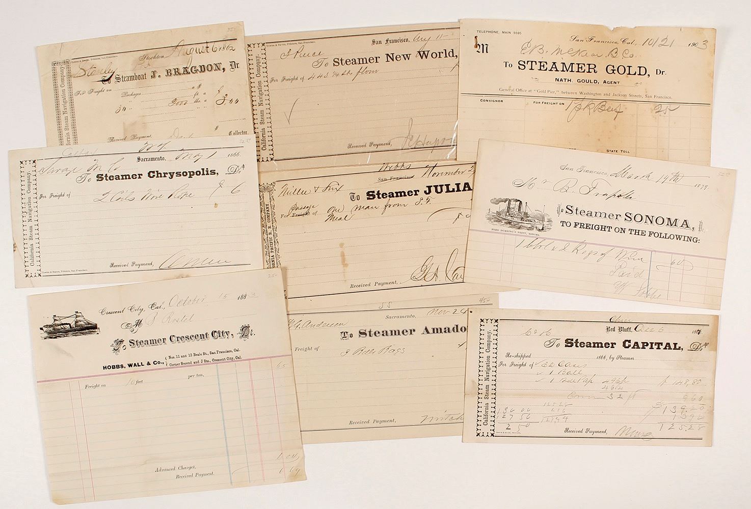 Lot of 9 billheads & receipts all from different California steamers. This is a unique collection that we haven't assembled before. Included: 1862 receipt for Steamer New World (San Francisco) of the California Steam Navigation Co.; 1862 receipt for Steamboat J. Bragdon (Stockton) of the California Steam Navigation Co; 1866 freight receipt for Steamer Chrysopolis (Sacramento) for shipment of wire rope to the Savage Mining Co. in Virginia City; 1867 receipt for Steamer Capital (Red Bluff); 1871 receipt for the Steamer Julia (Webbs? written over SF) of the California Pacific RR Co. to famous CA ranchers Miller & Lux for passage and meal for one man; 1871 receipt for Steamer Amador (Sacramento) of the California Pacific RR Co.; pictorial 1879 billhead for Steamer Sonoma (San Francisco); pictorial 1883 billhead for Steamer Crescent City; and a 1903 billhead for Steamer Gold (San Francisco). Most pieces have folds, toning, and some tears. Please inspect! (Prag Collection) Date: Location: California HWAC # 54883