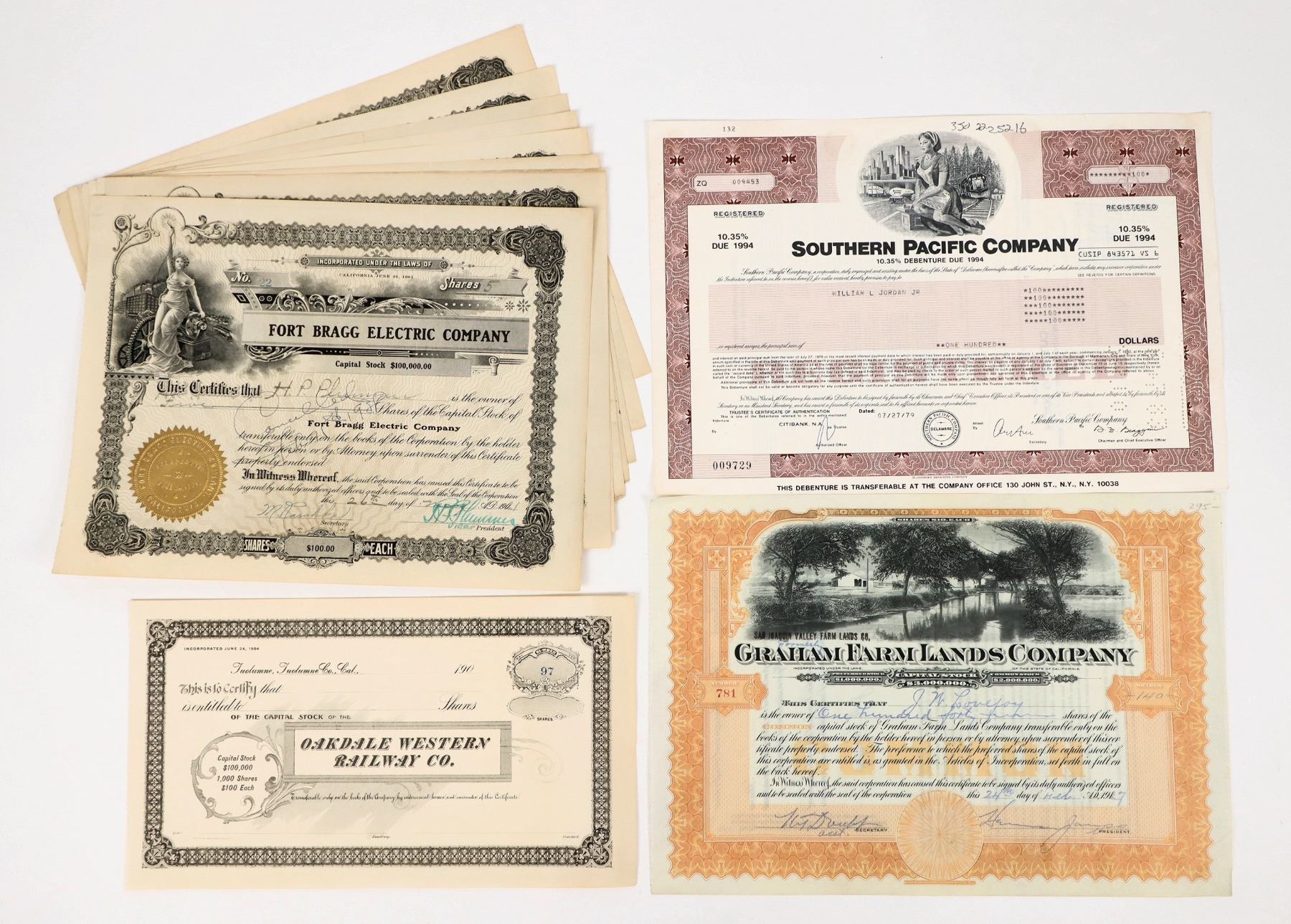 This lot hold sonly California stock certificates, many from Fort Bragg (8). The Fort Bragg Electric Company issued 1901 to/signed by H.P. Plummer President, later signed by T.D. Perkins President; Graham Farm Lands Company (later) San Joaquin Valley Lands Co. issued 1927; unissued stock for the Oakdale Western Railway CO. of Tuolumne, Co. Please see photo for details.