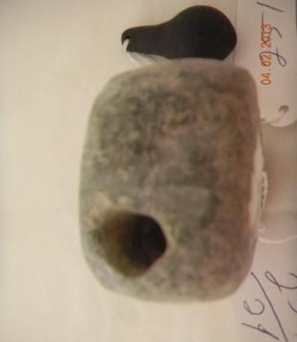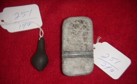 California Stone Plummet, and shaft straightener. Plummet measures 2 1/4 inches, and shaft straightener measures, 3 1/2 inches by 2 inches. Good, as found. Shipping $10.00