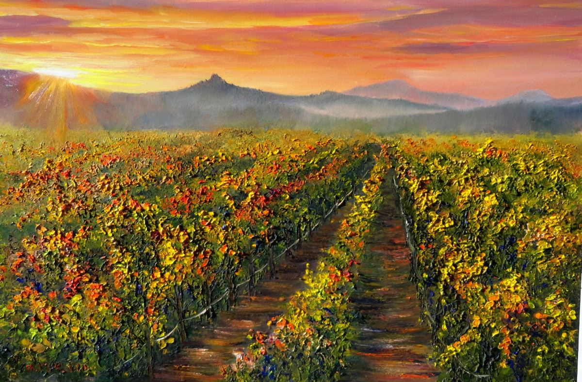 Artist: Katherine McNeill. Title: California Sunset. Medium: Oil on canvas. Size: 32" x 48" x 2". Framed size (if applicable): Museum Wrapped Artist's description: Having been raised in the wine country of California there is such