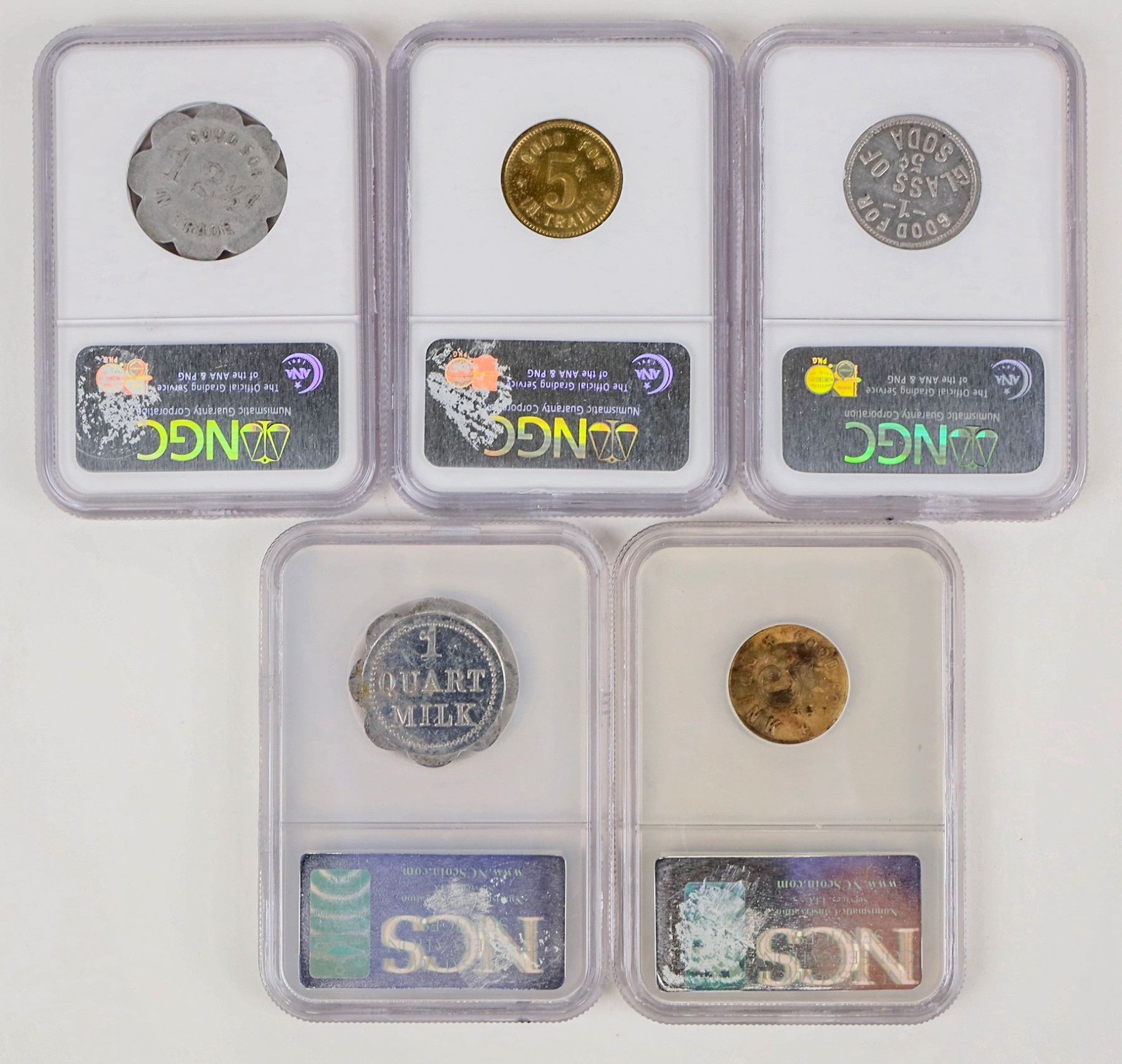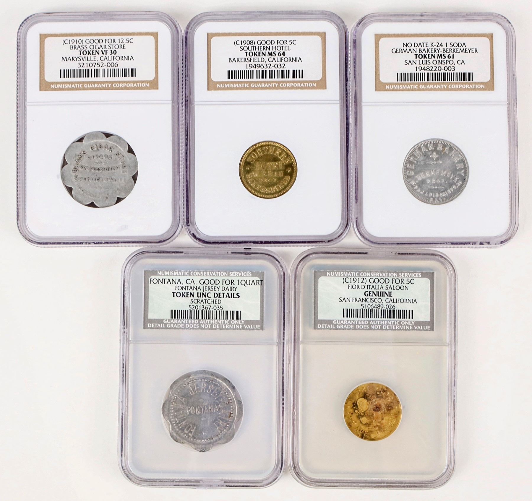 Five certified tokens: Southern Hotel, Bakersfield (MS 64); Brass Cigar Store, Marysville (VF 30); German Bakery, San Luis Obispo (MS 61); Fontana Jersey Dairy (UNC Details, scratched); Fior D'Italia Saloon, San Francisco (Genuine).