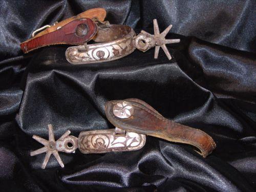 California Type Spurs, double mount silver overlay. Plain leathers. Poor condition.
