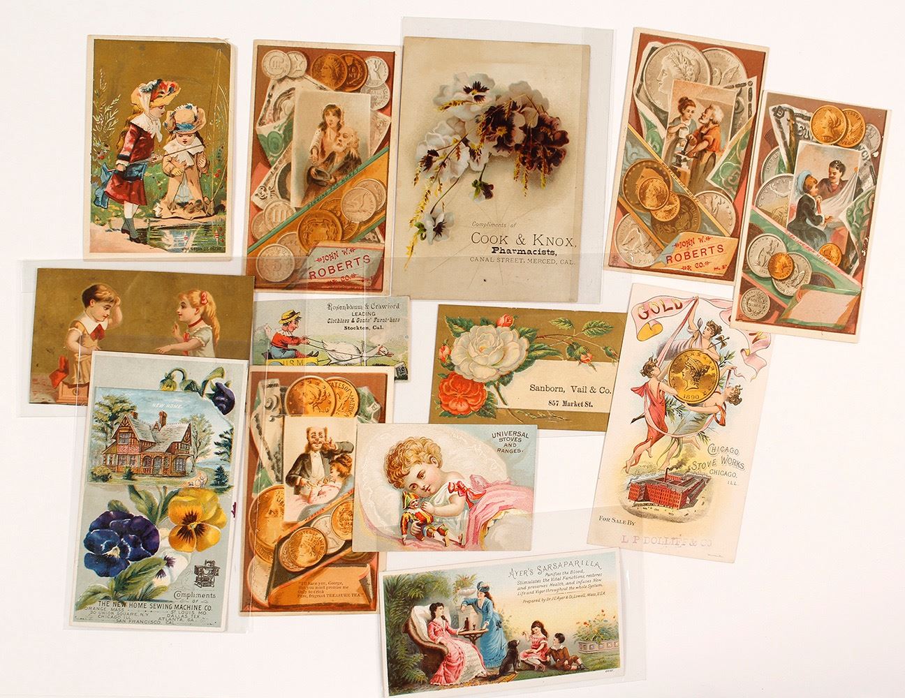 Lot of 13, mostly California. Included: Cook & Knox (Pharmacists, Merced), Sanborn, Vail & Co. (San Francisco), 2x John W. Roberts (SF), W. Ullner (Sewing Machines, SF), Rosenbaum & Crawford (Clothiers, Stockton), Hexter, May & Co. (Stoves, Portland, OR), I. Weill (Lompoc), Roberts (SF), Moulton & Co. (Tea, Oakdale), LP Dolliff & Co., J.C. Ayer & Co. (Lowell, Mass.), and one unused. Very colorful group. Please inspect. (Prag Collection) Date: Location: California HWAC # 54697