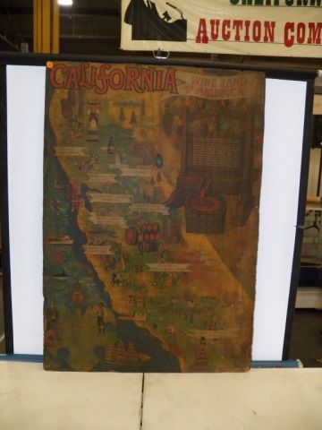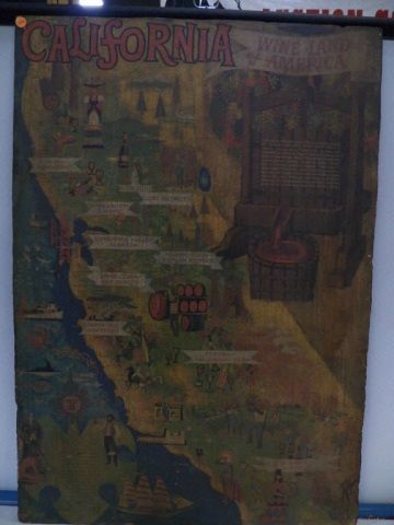 Painted on board map of California with all the Wine Country Listed. Very nice piece approx 27" x 39"