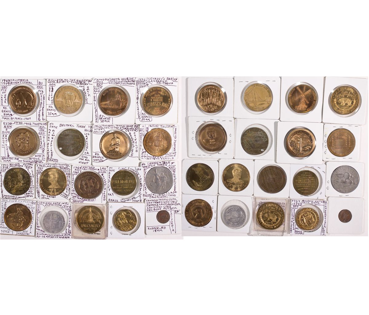 Lot of 18 tokens and medals including a Madame Bolanger "Good For All Night" token from Los Angeles, a heads and tails Burlesque token, a California Bicentennial medal, and many more. A great lot for new collectors! -60884