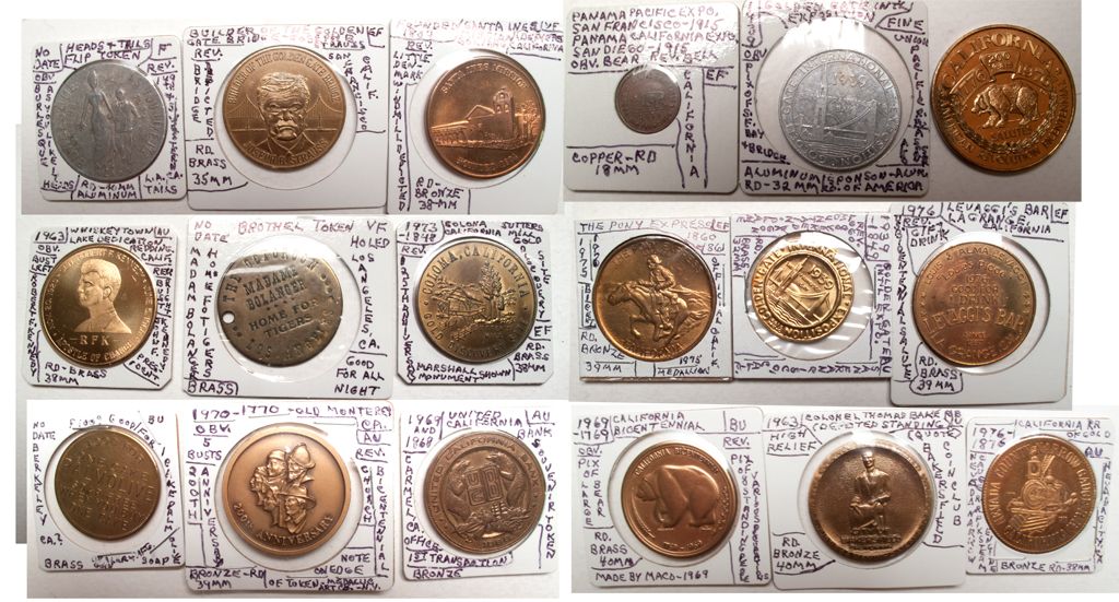Lot of 18 tokens and medals including a Madame Bolanger "Good For All Night" token from Los Angeles, a heads and tails Burlesque token, a California Bicentennial medal, and many more. A great lot for new collectors!City: County: State: CADate:
