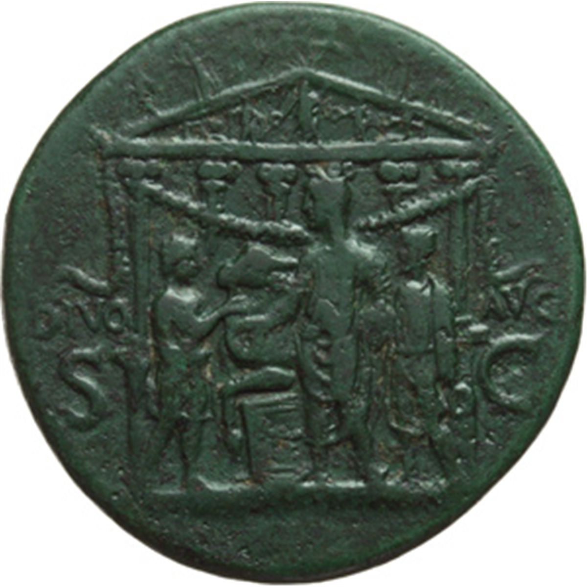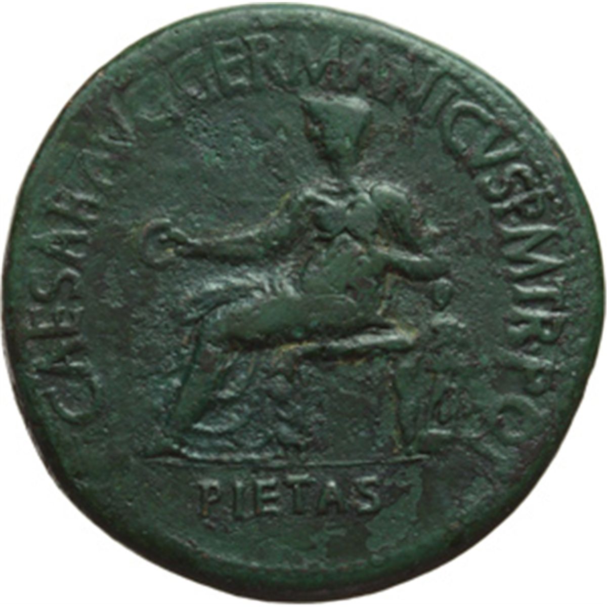 Impero Romano. Caligola (37-41). Sesterzio. D/ [C] CAESAR AVG GERMANICVS PM TR POT. Pietas seduta a sinistra tiene patera e posa il gomito sinistro su piccola figura stante. In esergo: PIETAS. R/ DIVO-AVG SC. Caligola, stante a sinistra, sacrifica davanti a tempio esastilo. RIC 36. AE. g. 25.99 mm. 35.00 R. Patina verde smeraldo. Bel BB.