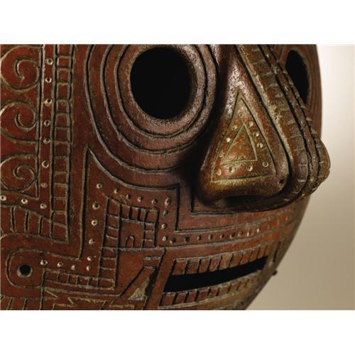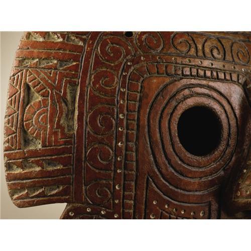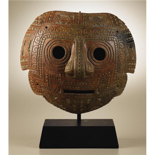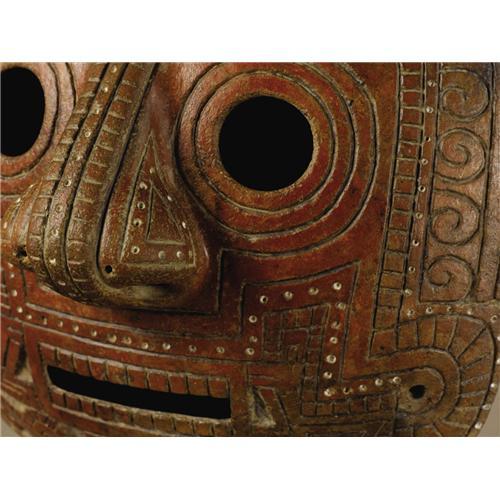 <B>Convex Face Mask</B></I><BR>Calima<BR>100 B.C. - A.D. 400<BR>Burnished ceramic, traces of white paint<BR>Height 10 in. Width 11 3/8 in.<BR><BR>This large and striking face mask is covered with deeply incised patterns which include profile zoomorphic heads that most resemble crocodilian or serpentine images. Four of these heads form a framing crest around the upper head and two outward-facing examples fill the chin area. In combination with possible variant inward-facing forms at either side of the mouth, these serve to enclose the face within their field of influence. Small circles filled with white pigment create a secondary framing rhythm. Within the overall highly stylized representation a surprisingly naturalistic nose is developed in a strongly three-dimensional manner.<BR>The regional attribution seems convincing, and a seemingly related example is illustrated in Armand J. Labbé, <I>Shamans, Gods, and Mythic Beasts: Colombian Gold and Ceramics in Antiquity.</B></I> New York: The American Federation of Arts,1998 (p.126, fig.2). Other than minor frontal abrasions and some vertical scratches on the back, the condition is very good.<BR><BR>Provenance<BR>Alfredo Ocampo, Calí, Colombia<BR>William Siegal Galleries, Santa Fe: 2004 catalogue, item 62.<BR><BR>Published<BR>Siegal, William. <I>Pre-Columbian Art.</B></I> Santa Fe: William Siegal Galleries, 2004.<BR><BR>