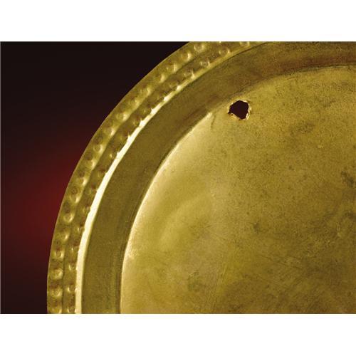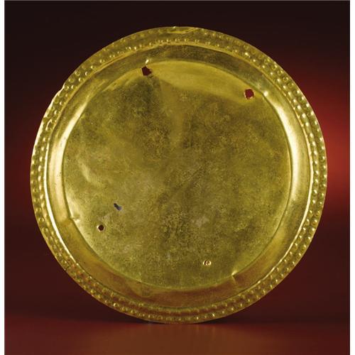 <B>Circular Pectoral</B></I><BR>Calima<BR>A.D. 400 - 1000<BR>Gold, Weight 64 grams<BR>Diameter 6 ¾ in.<BR><BR>The center portion of the pectoral is slightly convex within a double-band border. The inner band is lightly chased with faintly visible circles, while the outer is formed by a double row of repoussé beading. There is one minor edge crack, with overall surface patination. Four evenly distributed holes have been punched for attachment. This high carat example is large and in excellent condition.<BR><BR>Provenance<BR>Christies, Paris: sale 5068, 10 December 2003, p.136, lot 456<BR><BR> <BR><BR><B>Important notice:<
