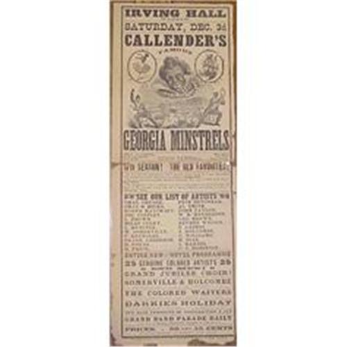 <table width="100%" border="0" cellspacing="0" cellpadding="4"><tr><td><em> </em></td></tr><tr> <td width="100%"> Callender's Famous Georgia Minstrels Broadside C. 1882 The Georgia Minstrels were formed by former slave Charles "Barney" Hicks (1840-1902) in 1865. The minstrel company was the first to successfully take this indigenous form of American entertainment to theatres around the world. It was so successful that it was taken over by a white manager, Charles Callender. 28"X10" Professionally Framed.