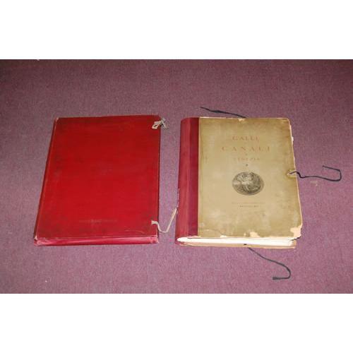 Calli E Canali in Venezia Monumenti - 2 Portfolios . Ferd. Ongania, Elephant Folio - over 15" - 23" tall. Ex-Library. Good Condition. 1891-1892. 200 PLATES of which 185 are heliogravures, and 15 are engravings, on hard stock, of the CANALS OF VENICE. With title pages and list of plates in English & Italian. Some plates are linen backed, some edge chips, portfolio I is original, with ties, library cloth backstrip, portfolio II is a library portfolio. Light library ink stamp on back of plates, notation on lower edges on front of plates, naming location of scene (not affecting the image).
