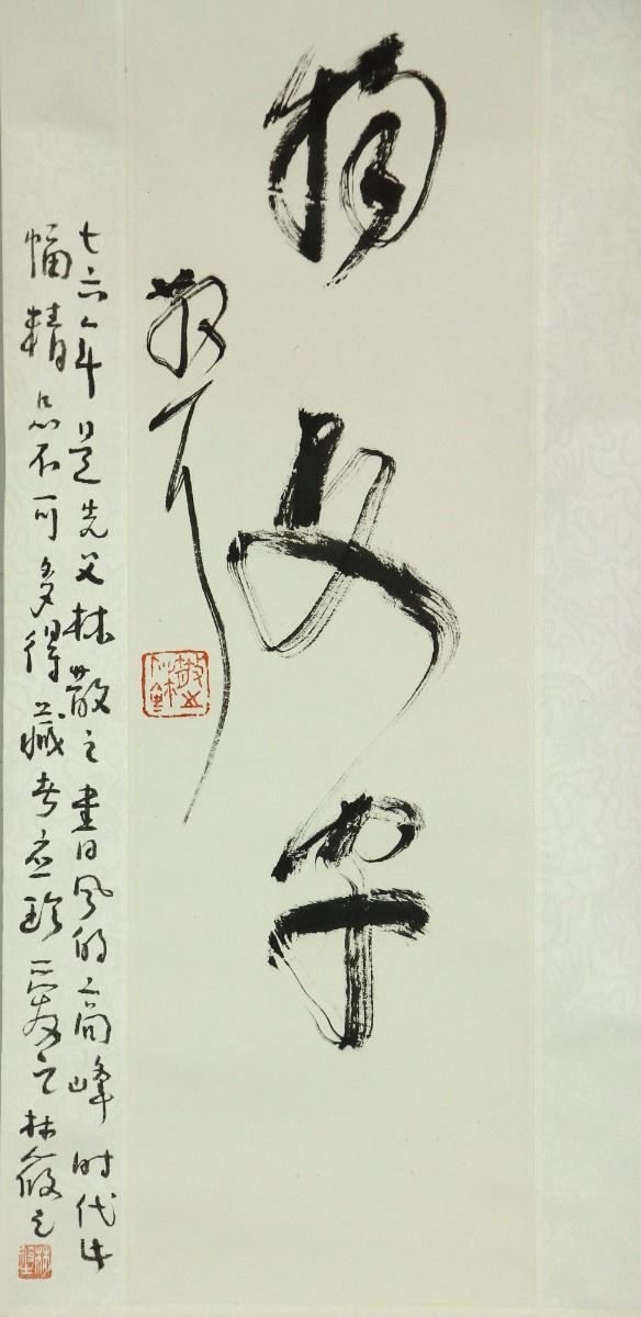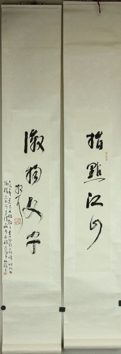 Calligraphy couplet; Chinese ink on paper; hanging scrolls; signed Lin Sanzhi and inscribed with three artist seals; 69 cm × 15.5 cm each