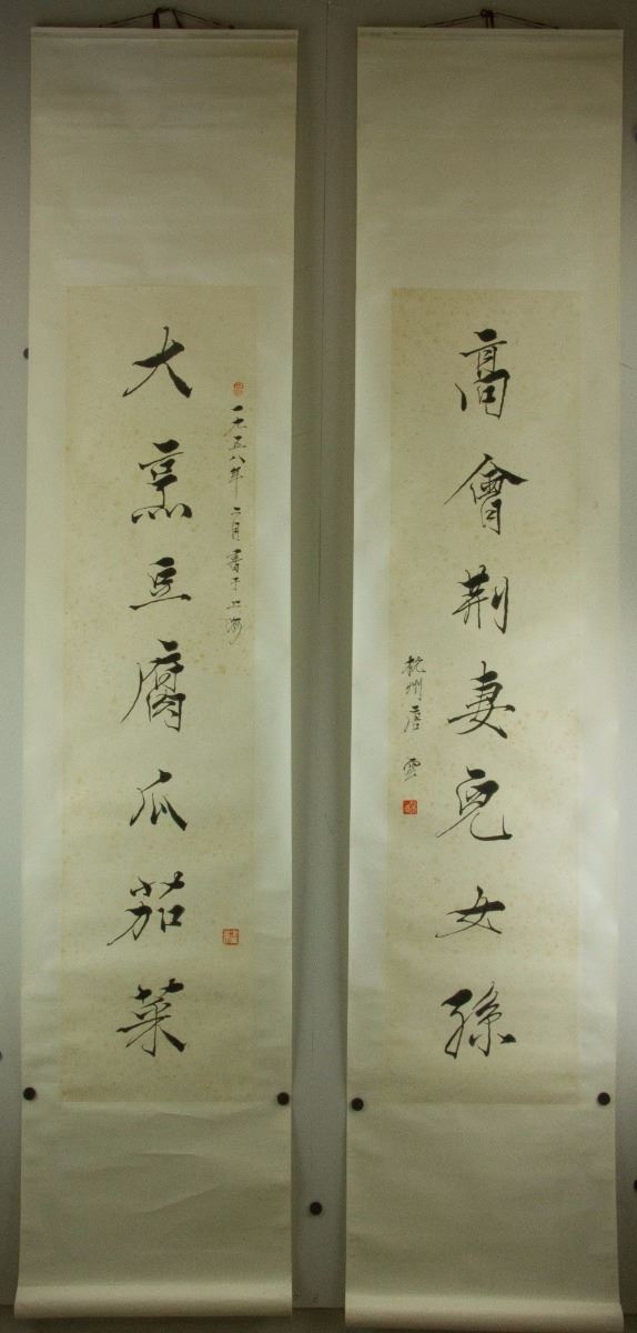 Calligraphy couplet; Chinese ink on paper; signed Tang Yun and inscribed with three artist seals; 134 cm x 31 cm each