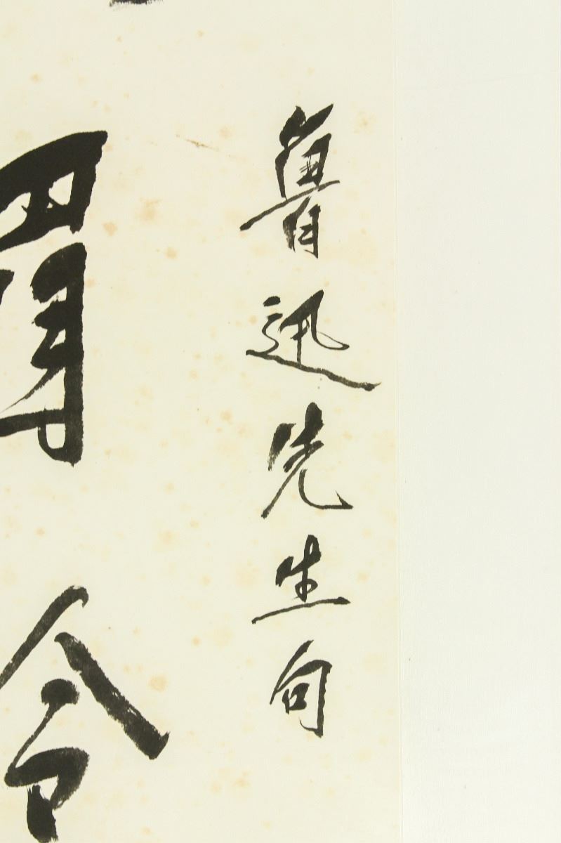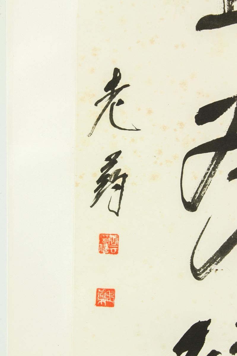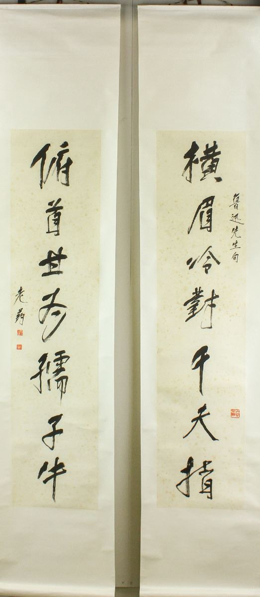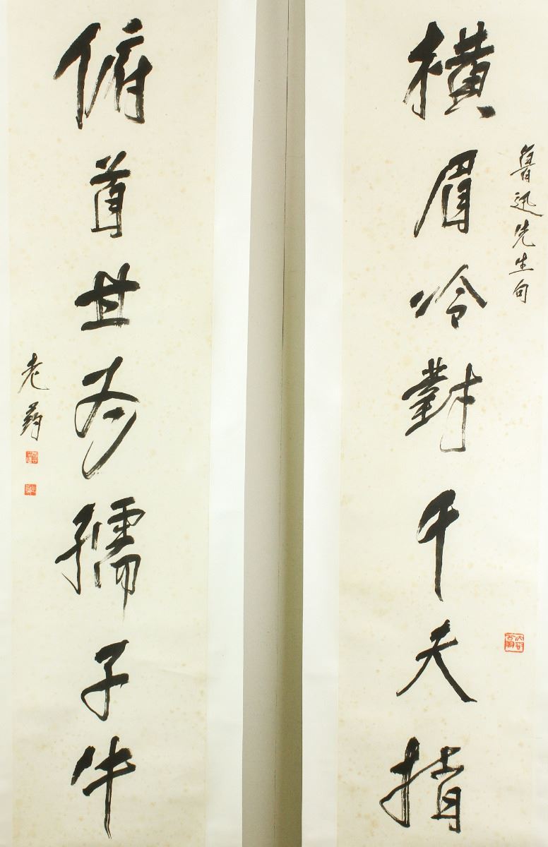 Calligraphy couplet of Lu Xun's poetry; Chinese ink on paper; two hanging scrolls; signed Tang Yun and inscribed with three seals; 133.5 cm X 31 cm each