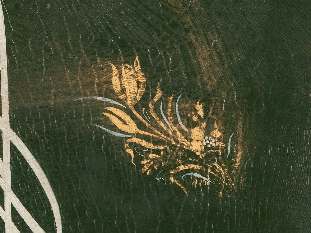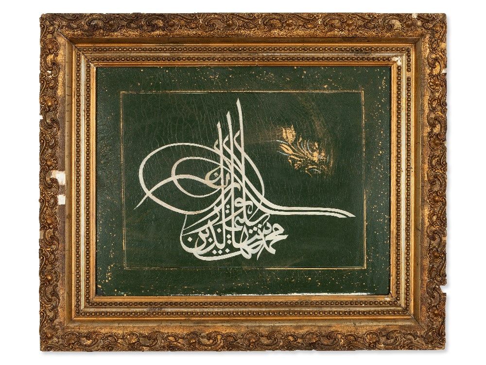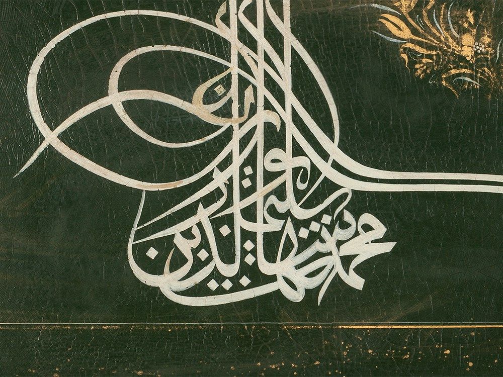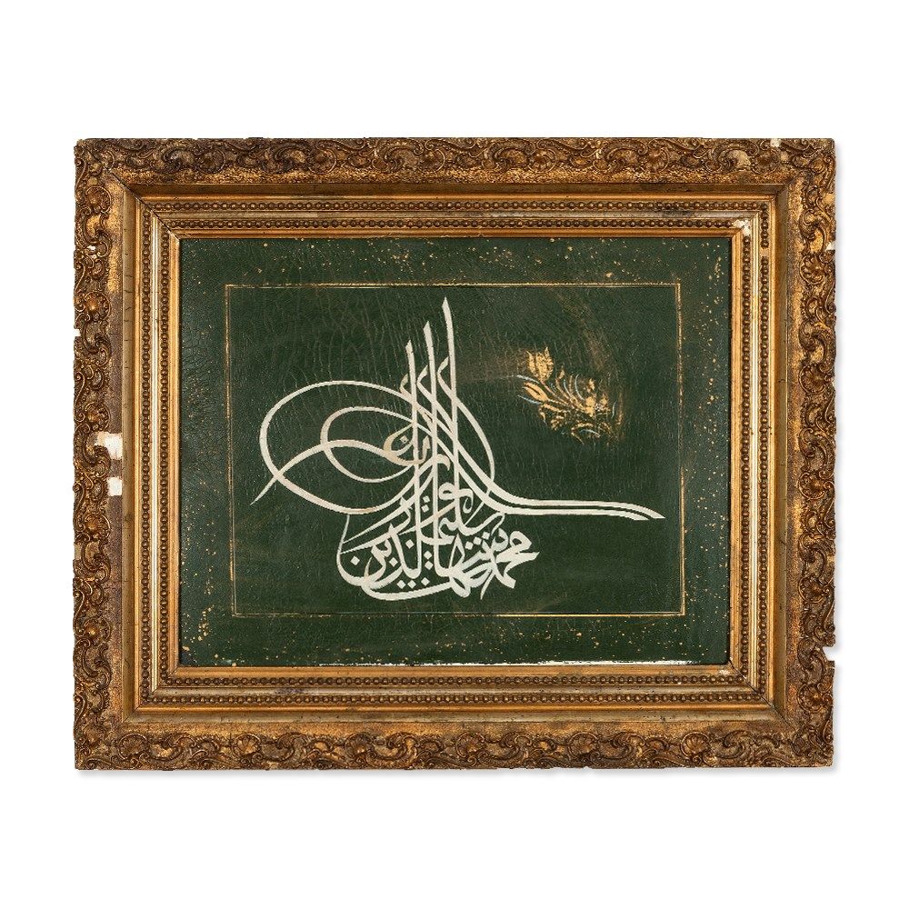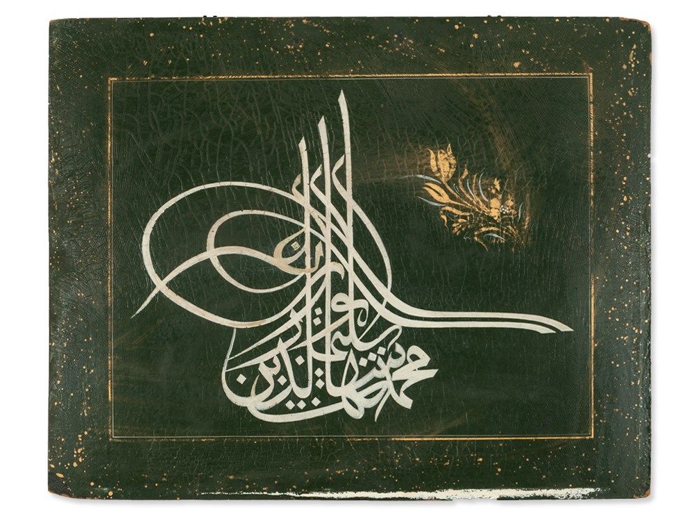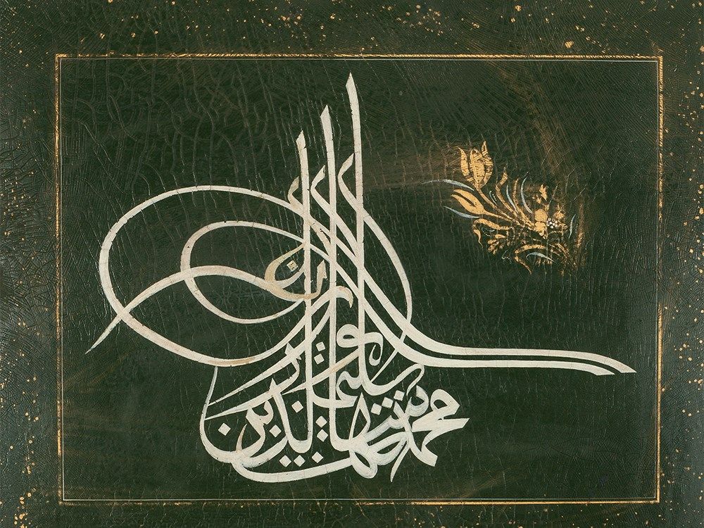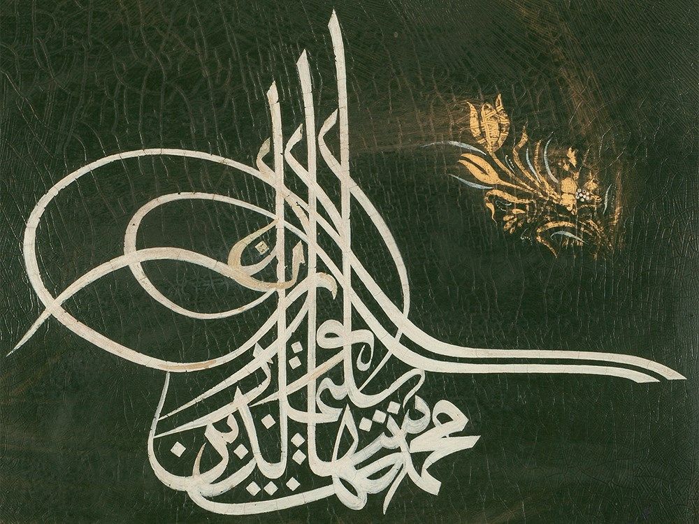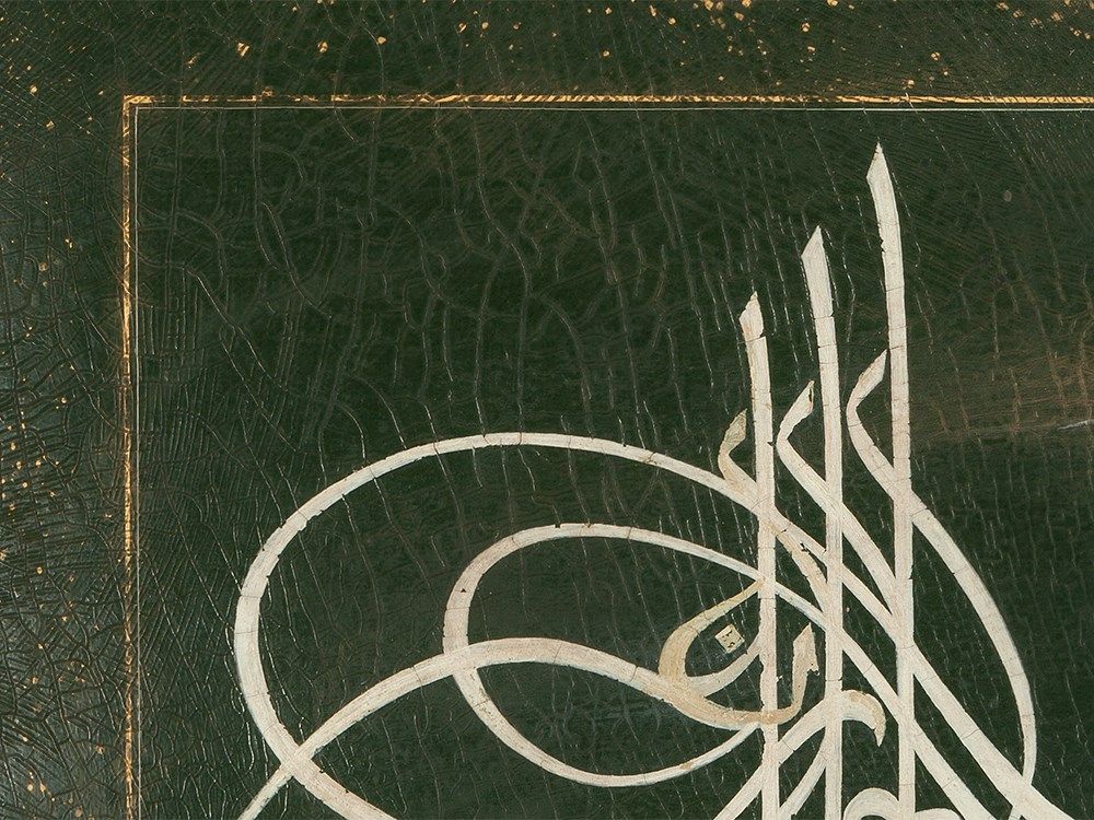 The Tughra was the calligraphic cipher of the Ottoman sultans and served as the signature or seal of the respective Sultan. Today, it enjoys great popularity as a decorative element. Here it is painted in white on a green background with a decorative flower bouquet and gold spotted edge.